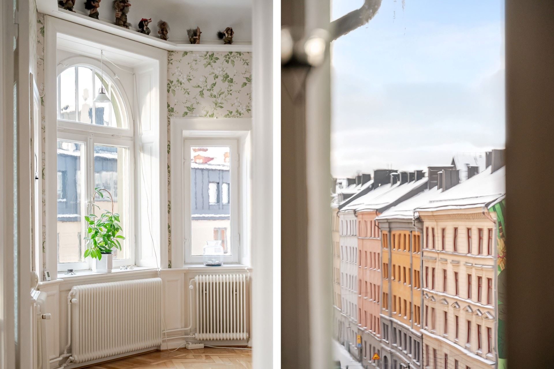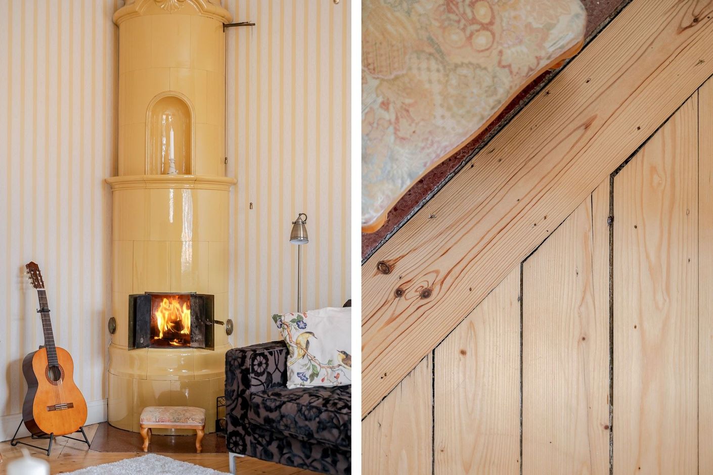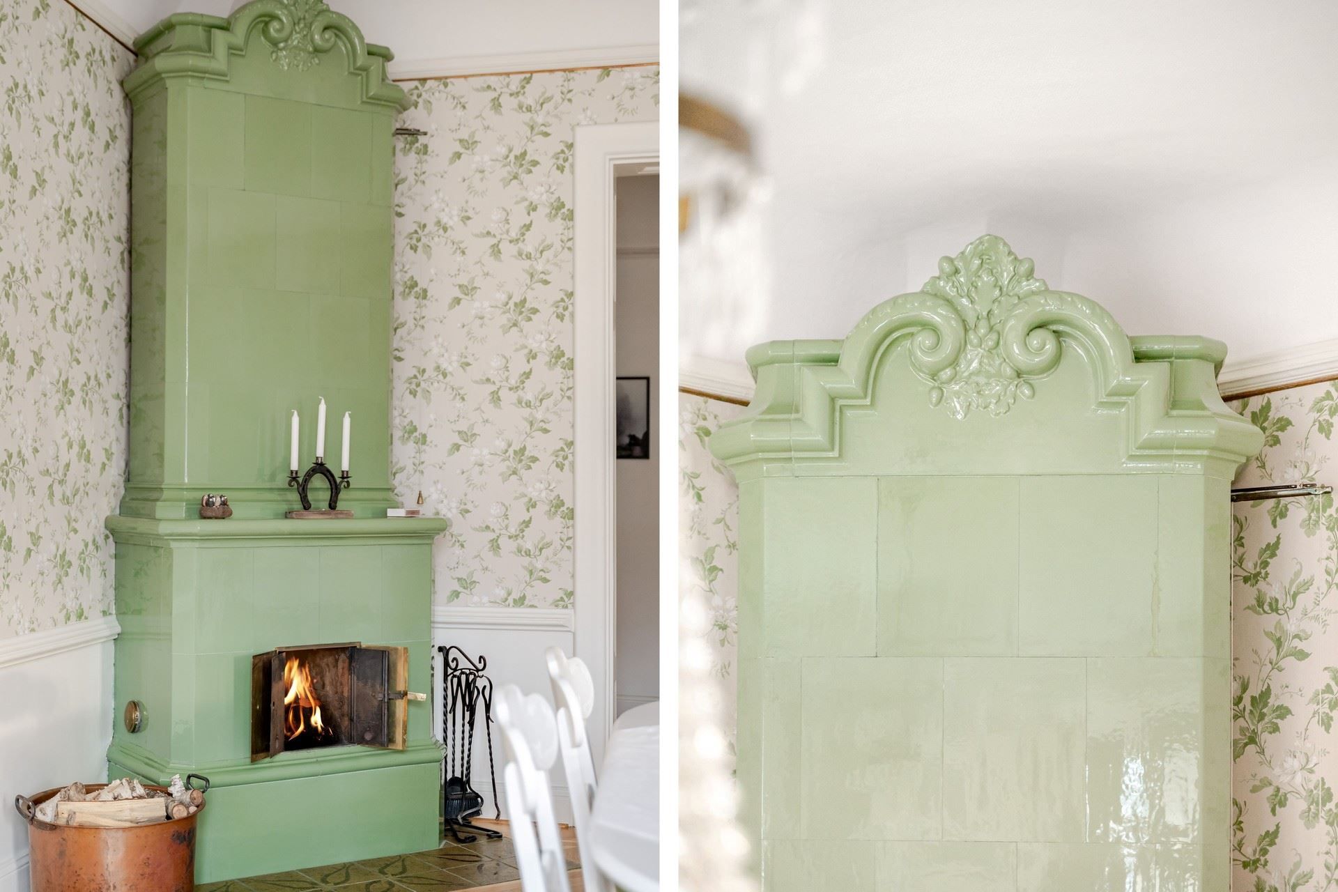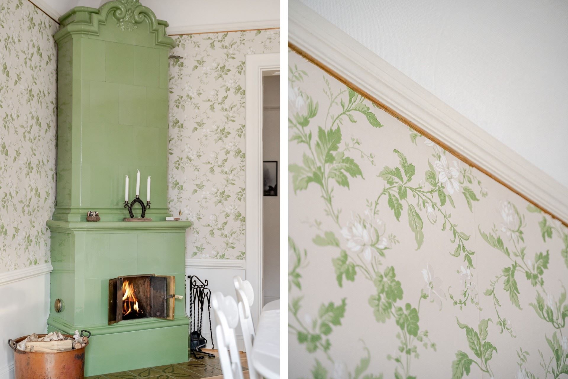 Sekelskiftesdröm högst upp i huset – två kakelugnar, balkong och burspråk