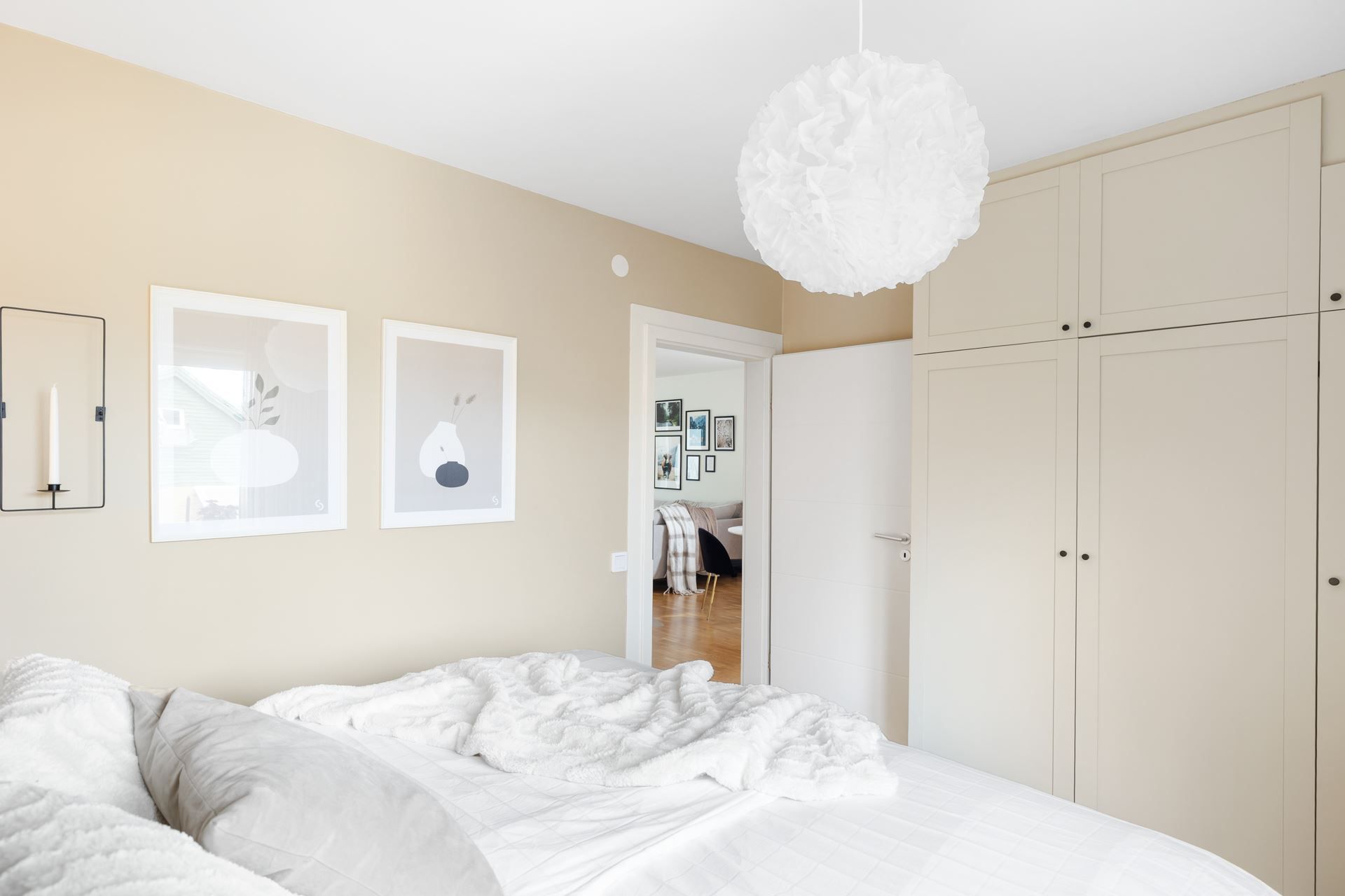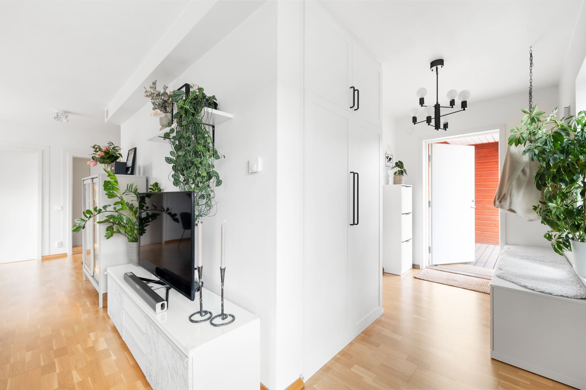 Här välkomnas du, bara en trappa upp från markplan, av en rymlig hall med gott om plats för att hänga av sig ytterkläder i form av klädhängare och garderober. Vidare finner du det luftiga vardagsrummet med plats för både större soffgrupp och matgrupp. Från vardagsrummet når du den inglasade balkongen i soligt söderläge, som enkelt möbleras med loungemöbler eller en mindre matgrupp.