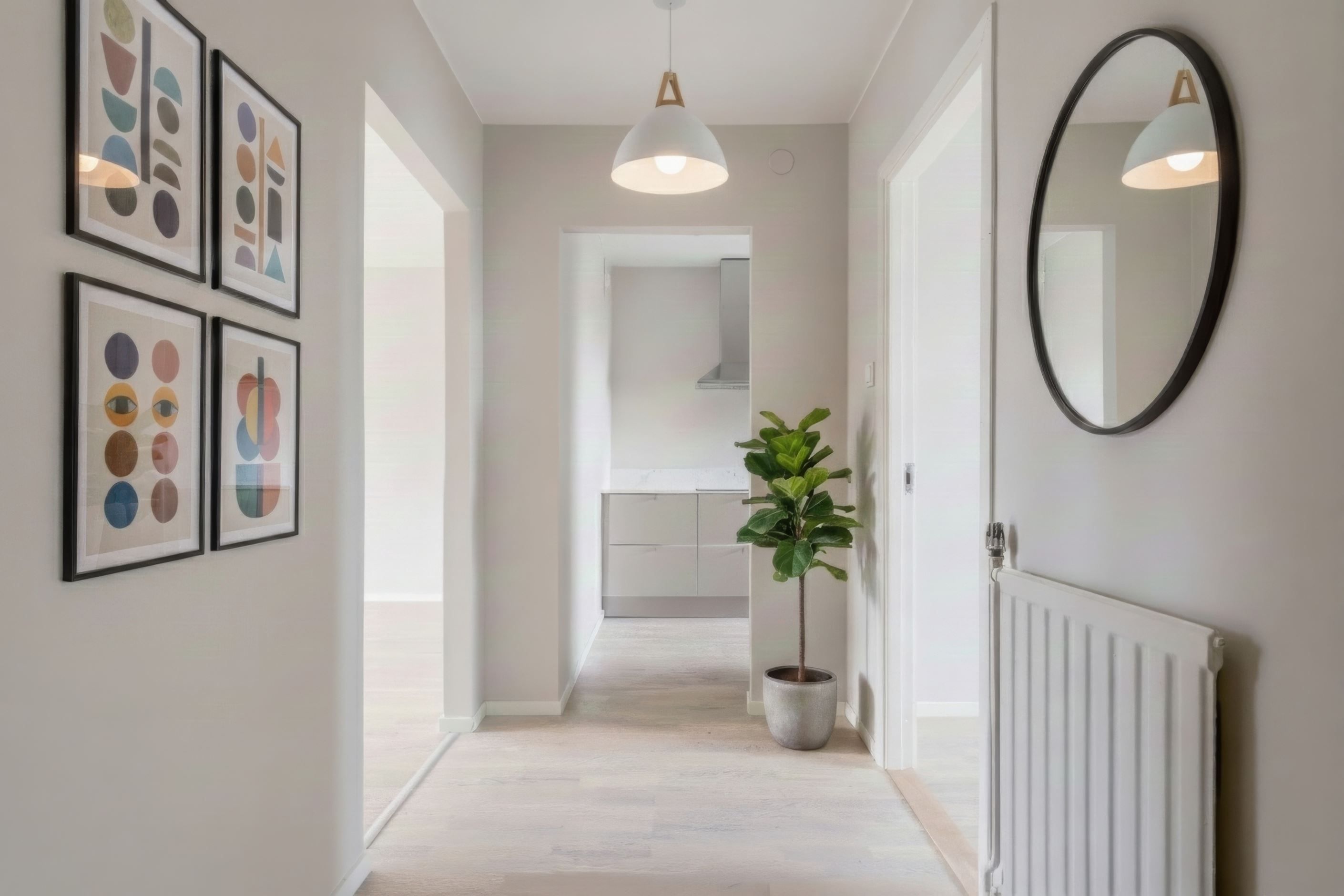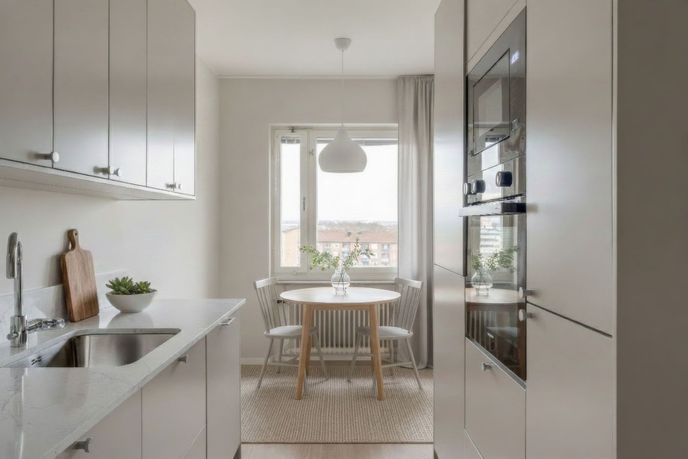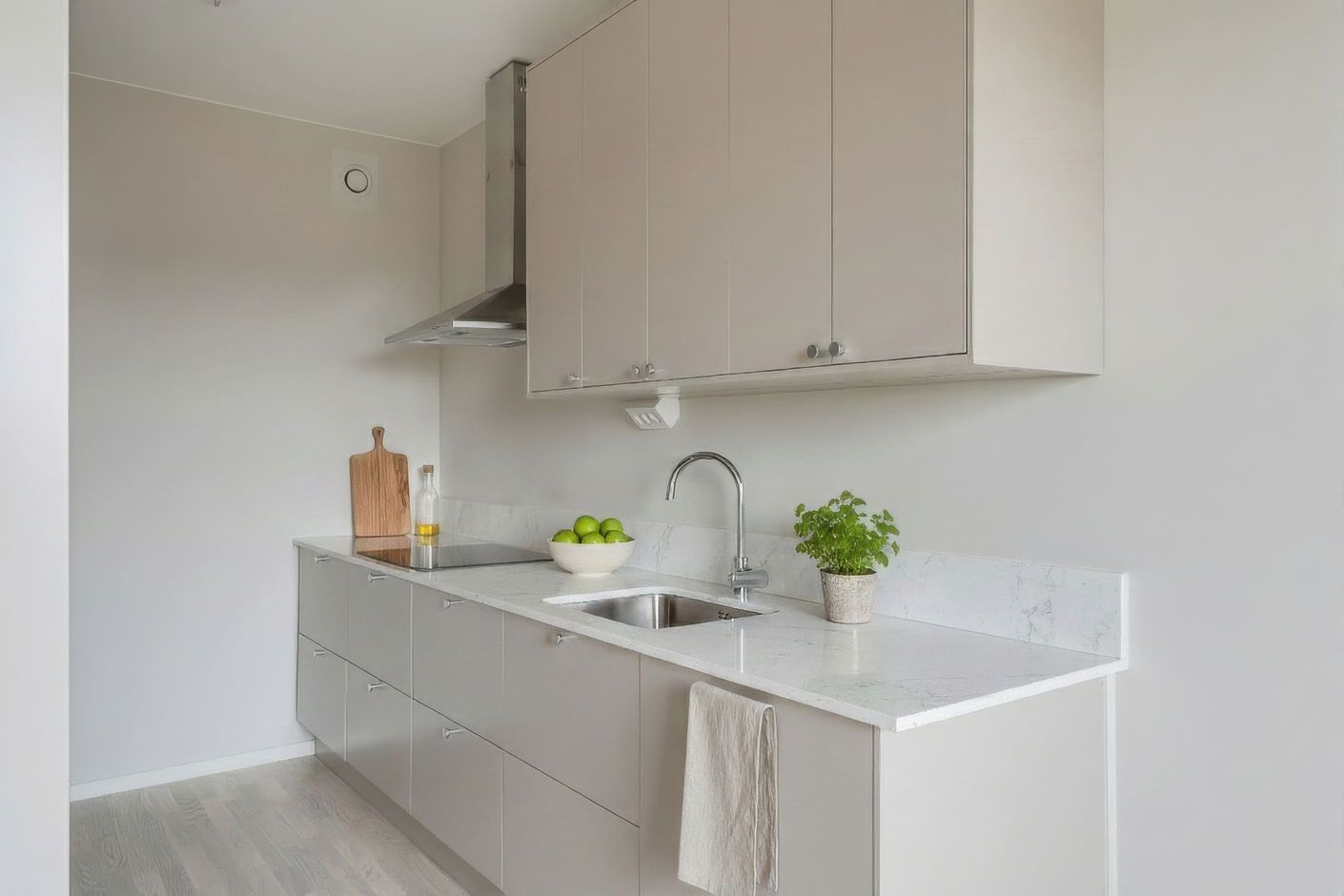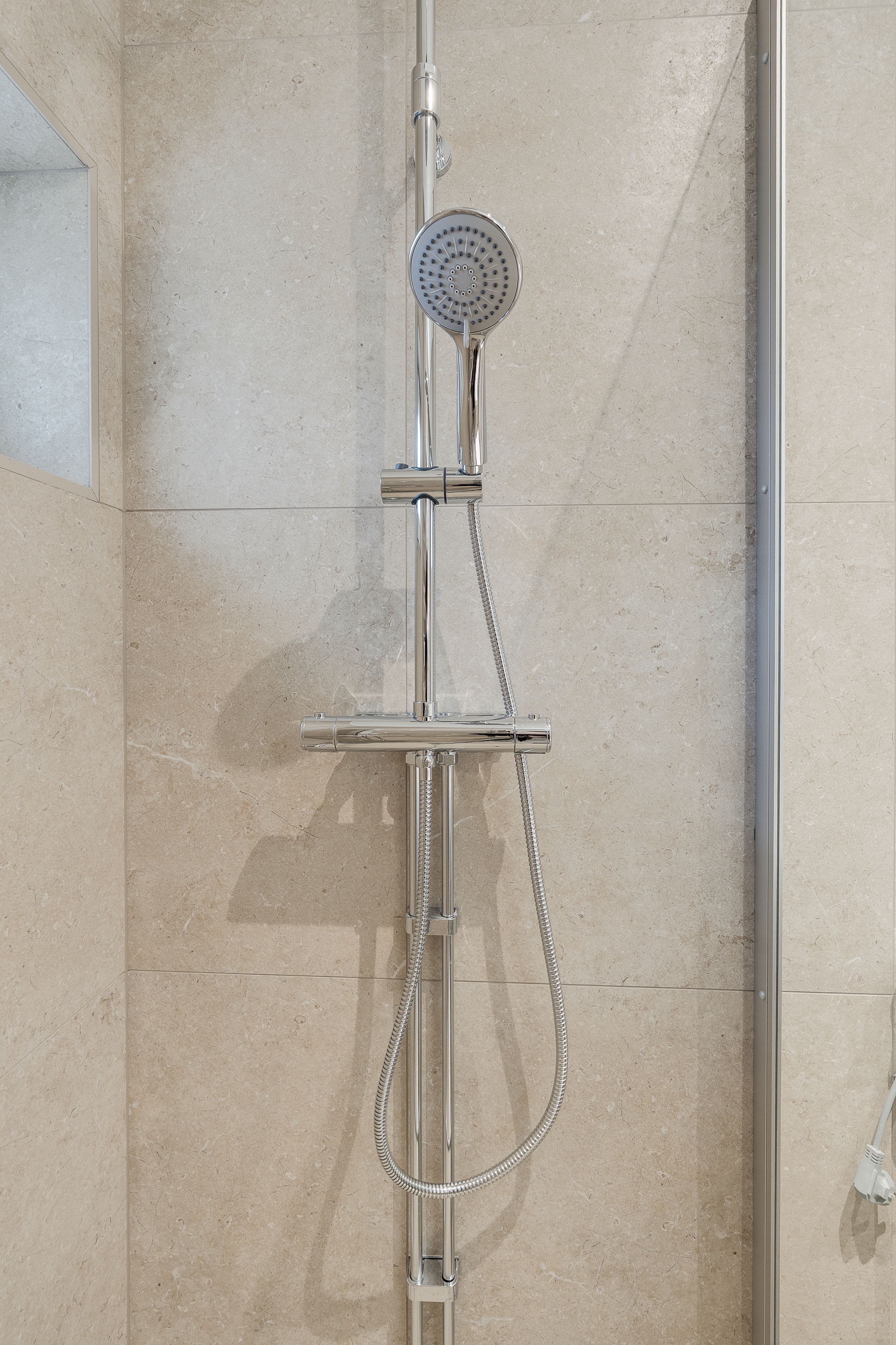 Här bor du högst upp i huset på våning 4/4, i en bostad som känns helt ny från första steget in. Hemmet erbjuder ett helkaklat, fräscht duschrum, nya enhetliga golv och ett stilrent kök med bänkskiva i kompositsten – samma exklusiva material återkommer även i det snygga stänkskyddet. Samtliga ytskikt är omsorgsfullt förbättrade och ger ett genomgående modernt intryck. Förvaring finns generöst i både hall och sovrum.