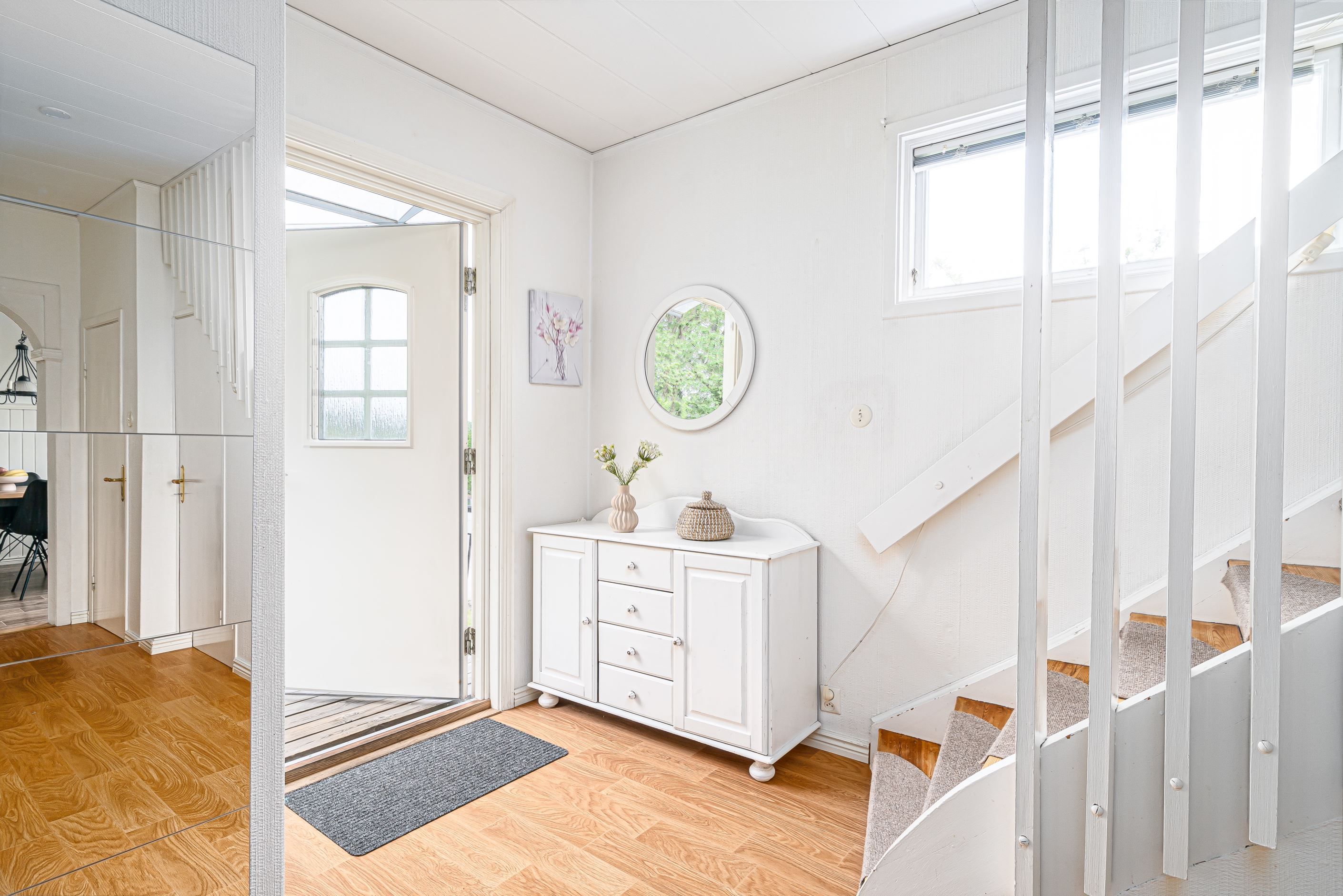 Invändigt möts du av ett stort, ljust vardagsrum med vacker parkett och en öppen spis som blir rummets naturliga samlingspunkt (ej i bruk idag). Husets generösa ytor rymmer flera rymliga sovrum – perfekt för den växande familjen eller för dig som vill kombinera boende med hemmakontor eller hobbyrum.