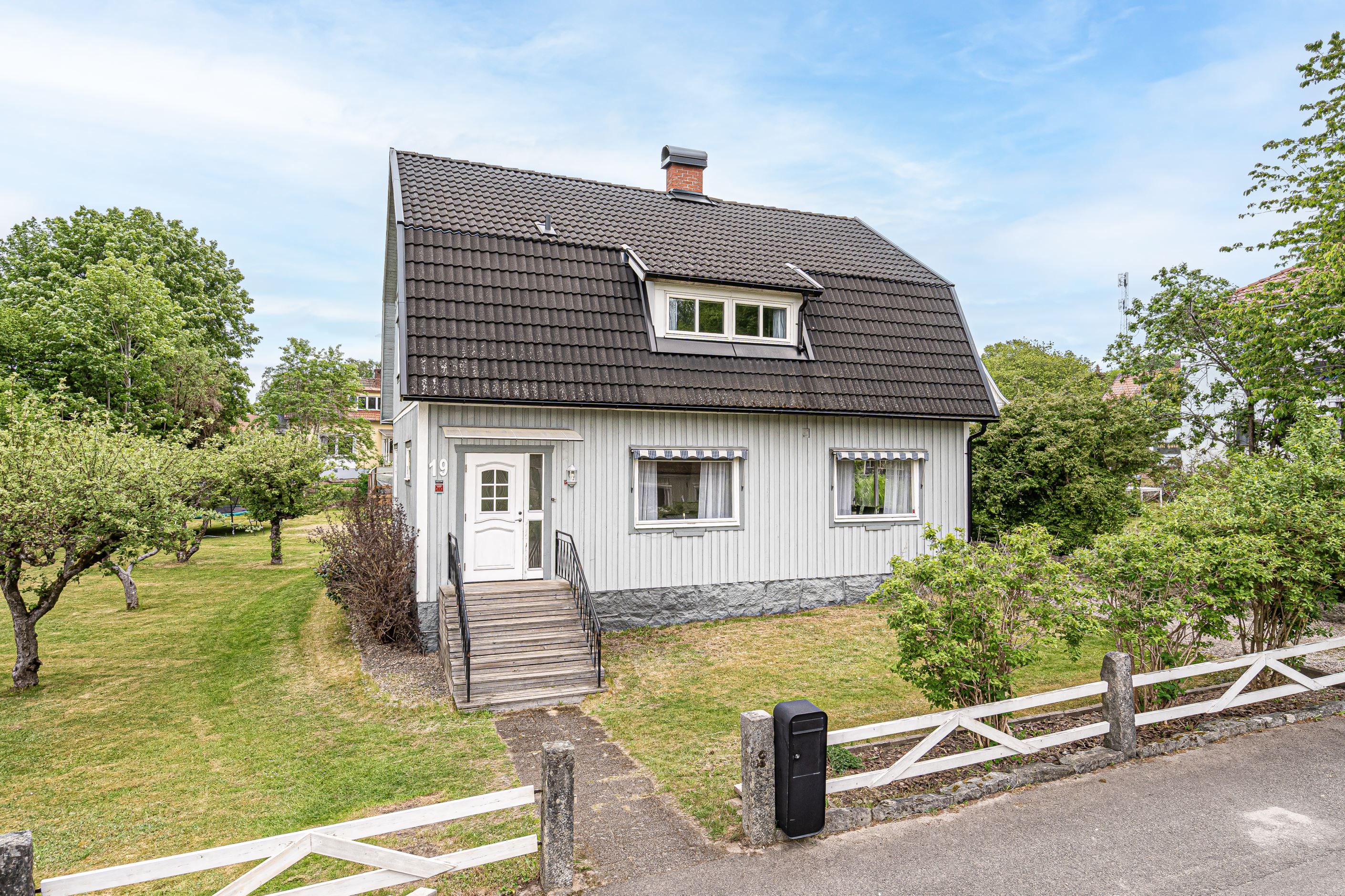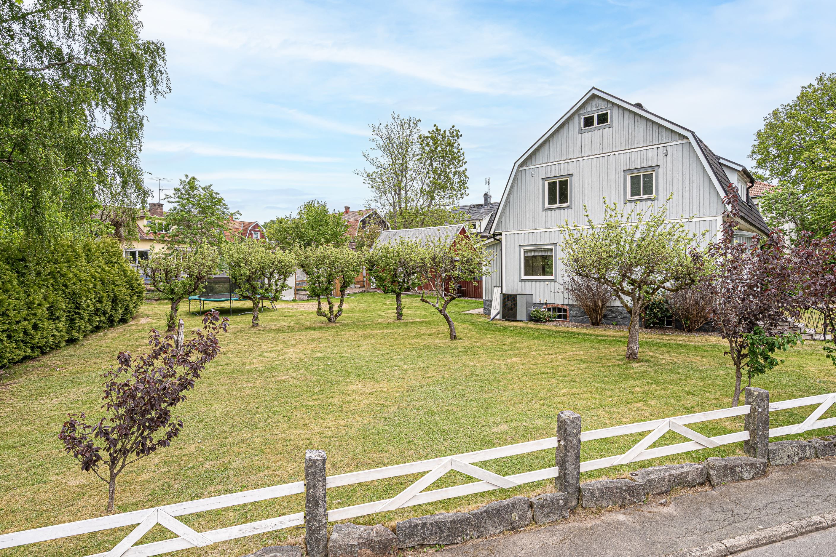 Huset omges av en generös trädgårdstomt som bjuder in till både lek, odling och avkoppling. Här finns öppna gräsytor, fruktträd som blommar vackert under säsong, en insynsskyddande häck och en charmig uteplats under tak – perfekt för sommarens grillkvällar. På tomten står också ett praktiskt uthus med vedbod och förråd.