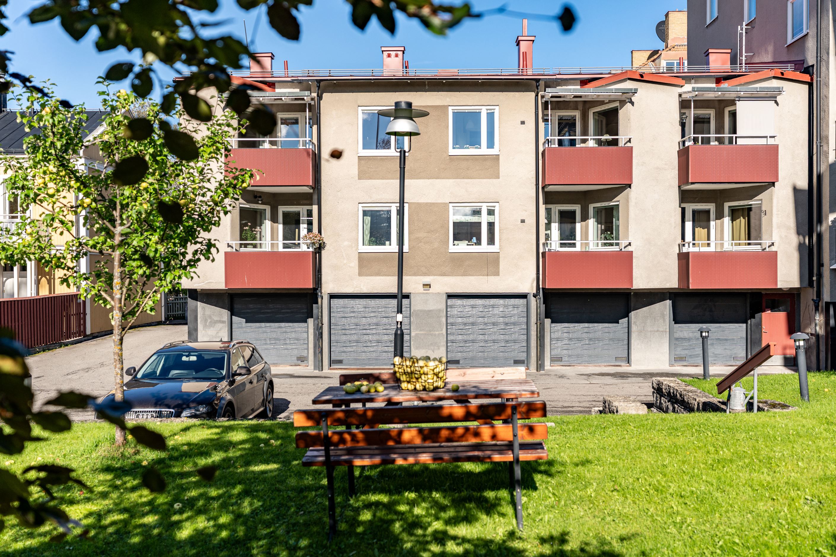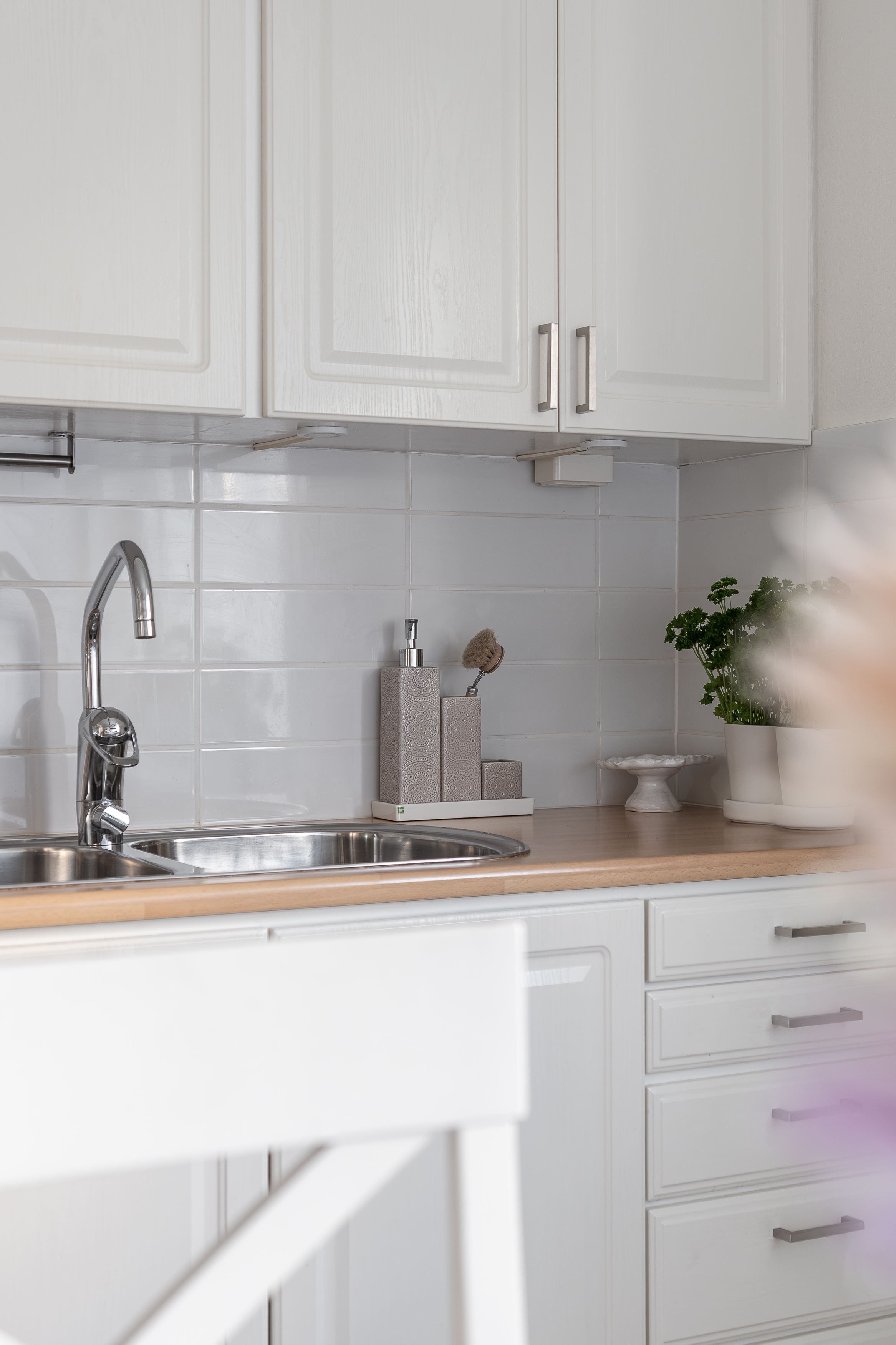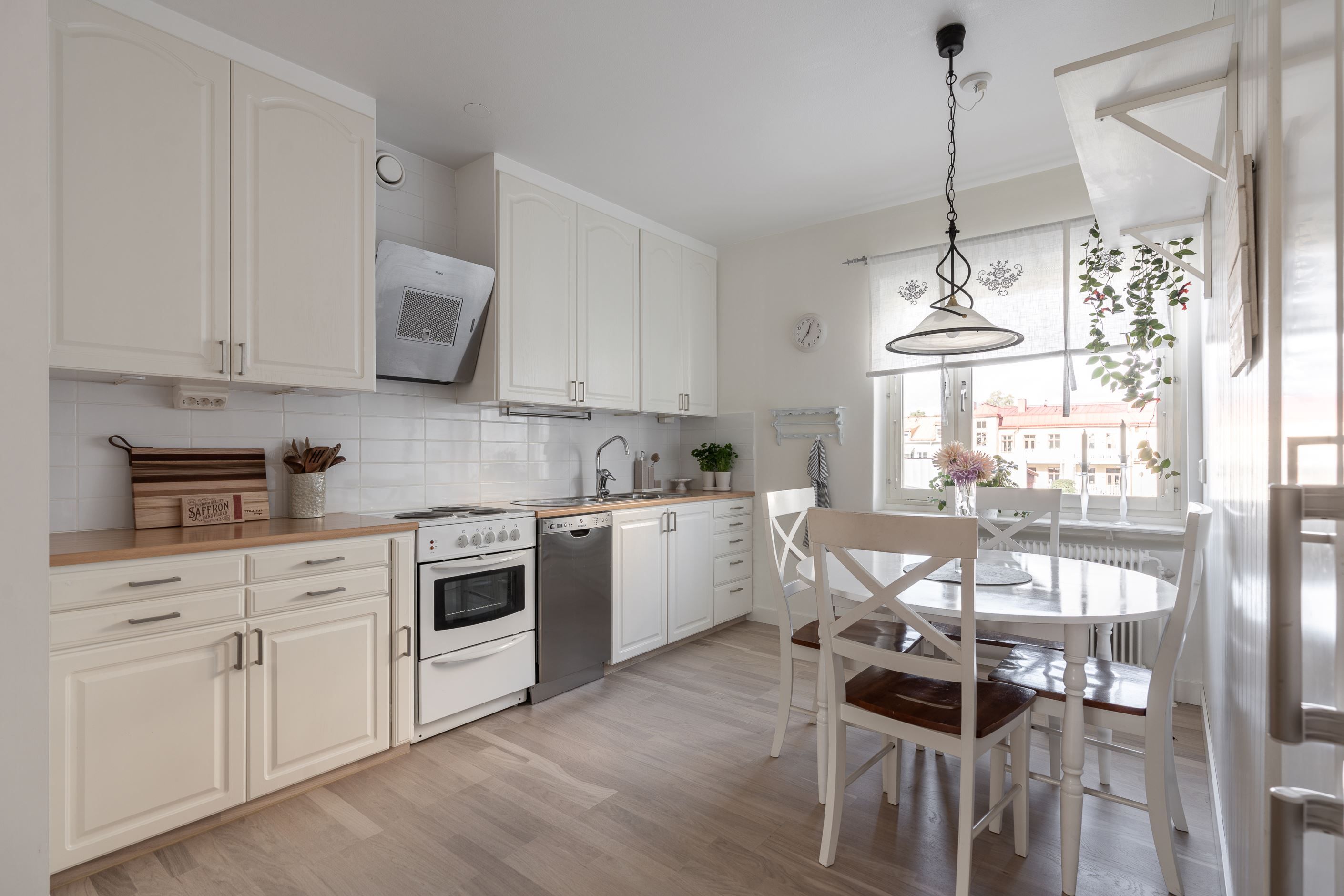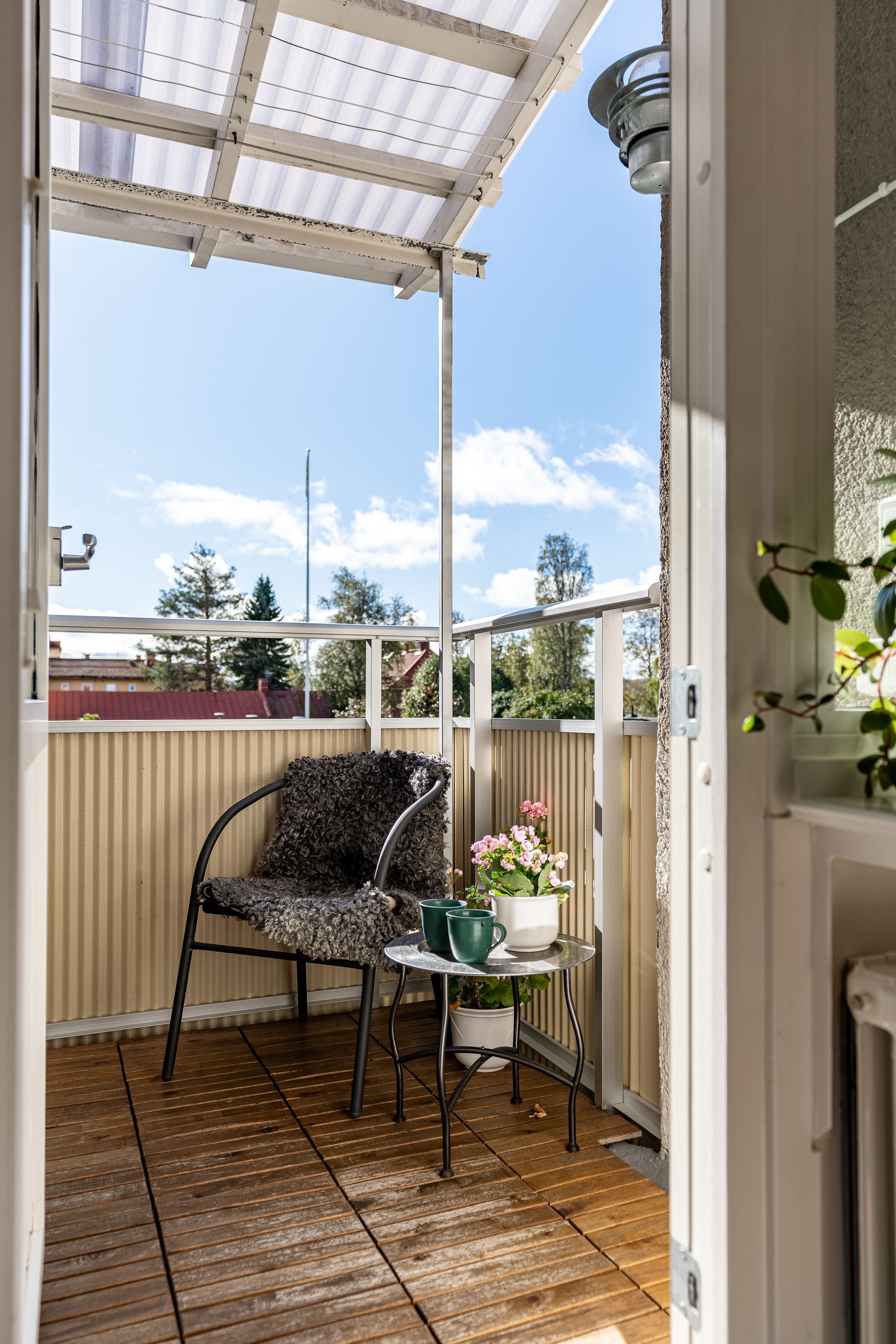 Lägenheten bjuder på en ljus och luftig känsla med enhetliga golv och generös takhöjd. Köket lockar till långfrukostar vid fönstret och middagar med vänner, och även här är stammarna bytta för din trygghet. Vardagsrummet är luftigt och socialt med plats för både soffgrupp och matgrupp. Från vardagsrummet nås balkongen mot föreningens innergård – en grön och privat oas mitt i stan med äppelträd och trivsam gräsyta. Här finns också mysiga uteplatser, både i solen och under tak, där du kan koppla av och njuta av lugnet mitt i citypulsen.