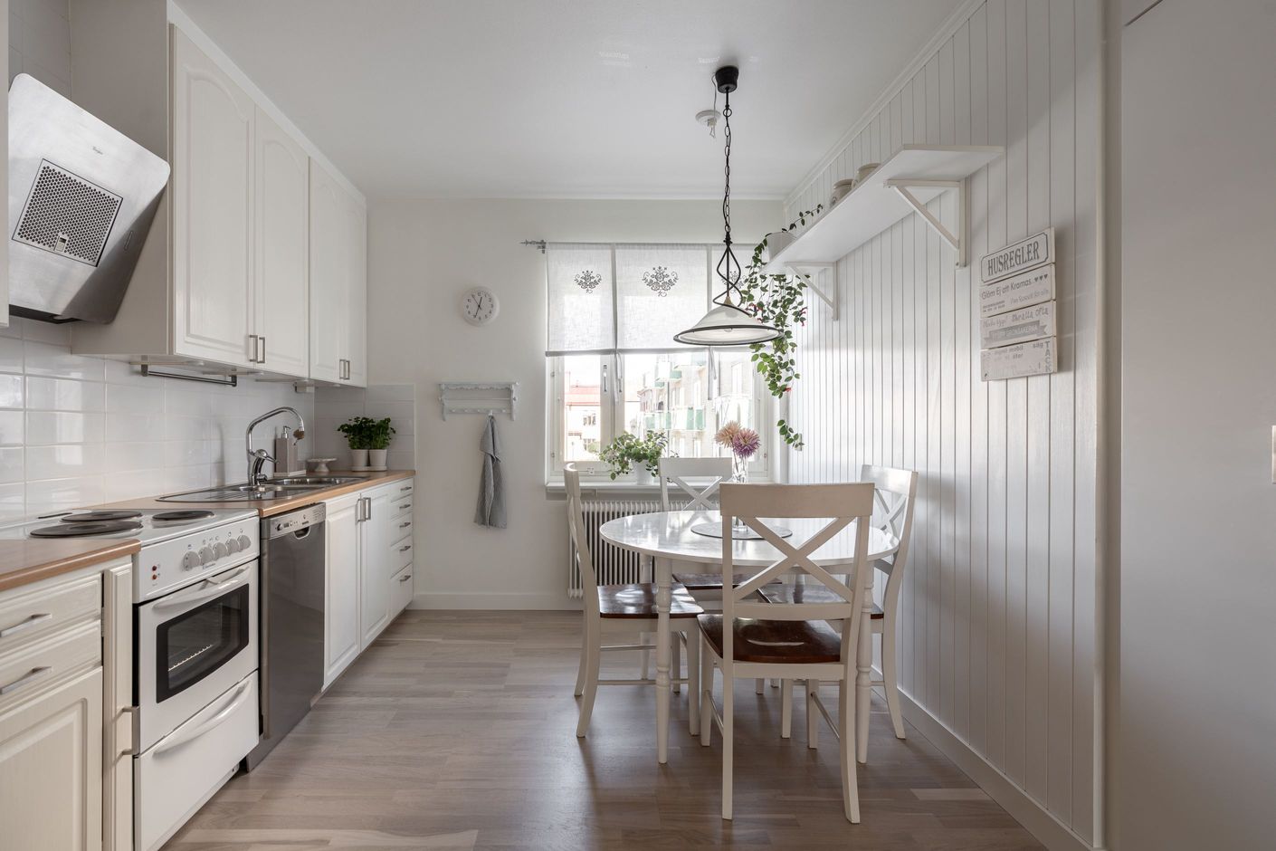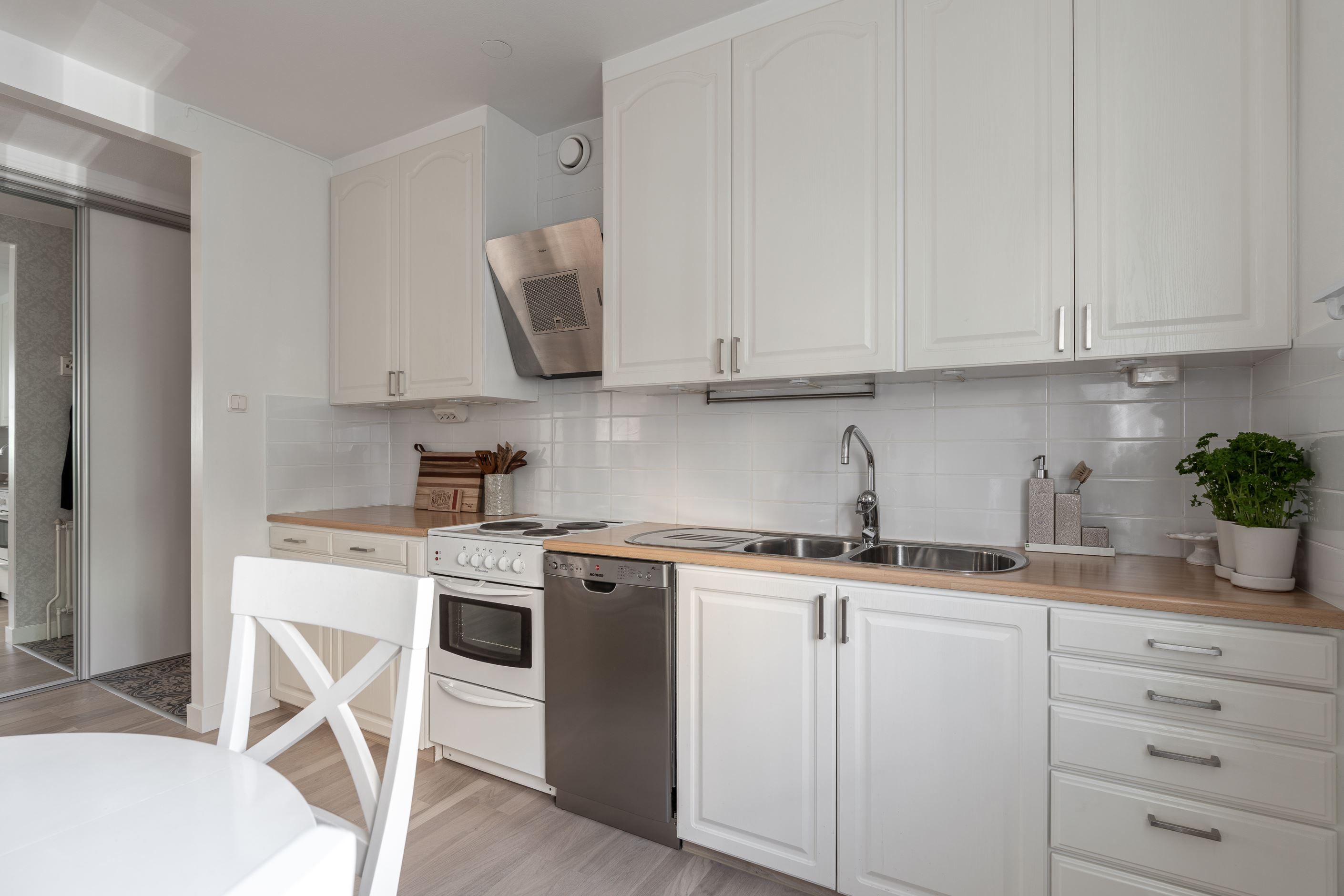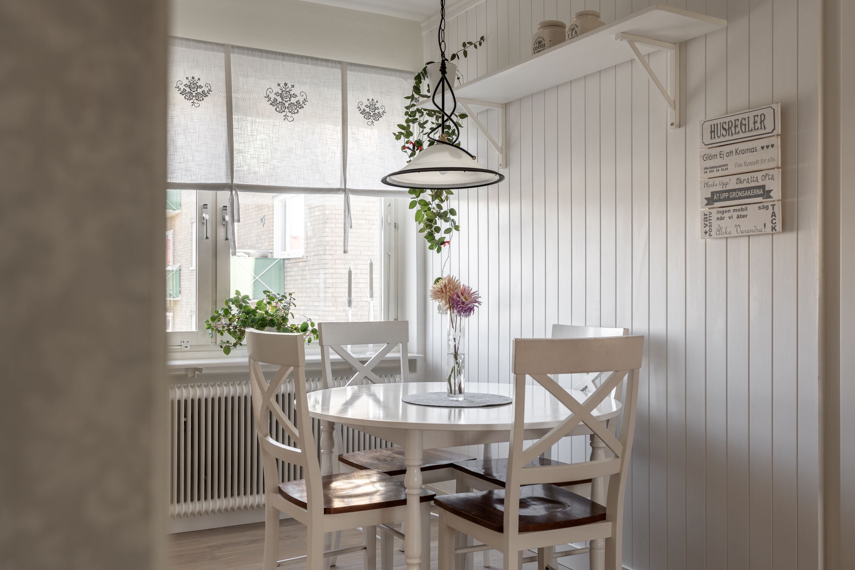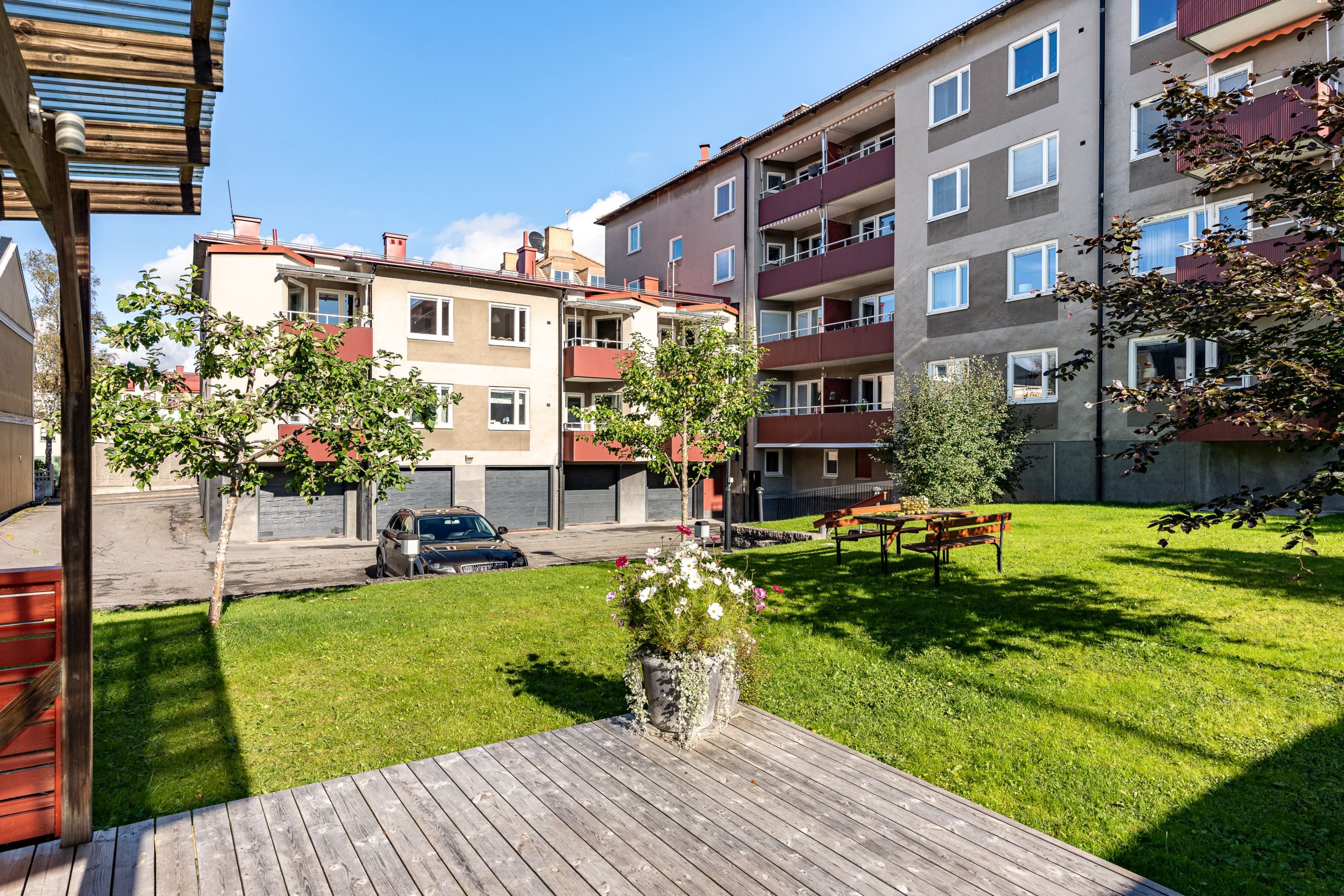 Lägenheten bjuder på en ljus och luftig känsla med enhetliga golv och generös takhöjd. Köket lockar till långfrukostar vid fönstret och middagar med vänner, och även här är stammarna bytta för din trygghet. Vardagsrummet är luftigt och socialt med plats för både soffgrupp och matgrupp. Från vardagsrummet nås balkongen mot föreningens innergård – en grön och privat oas mitt i stan med äppelträd och trivsam gräsyta. Här finns också mysiga uteplatser, både i solen och under tak, där du kan koppla av och njuta av lugnet mitt i citypulsen.