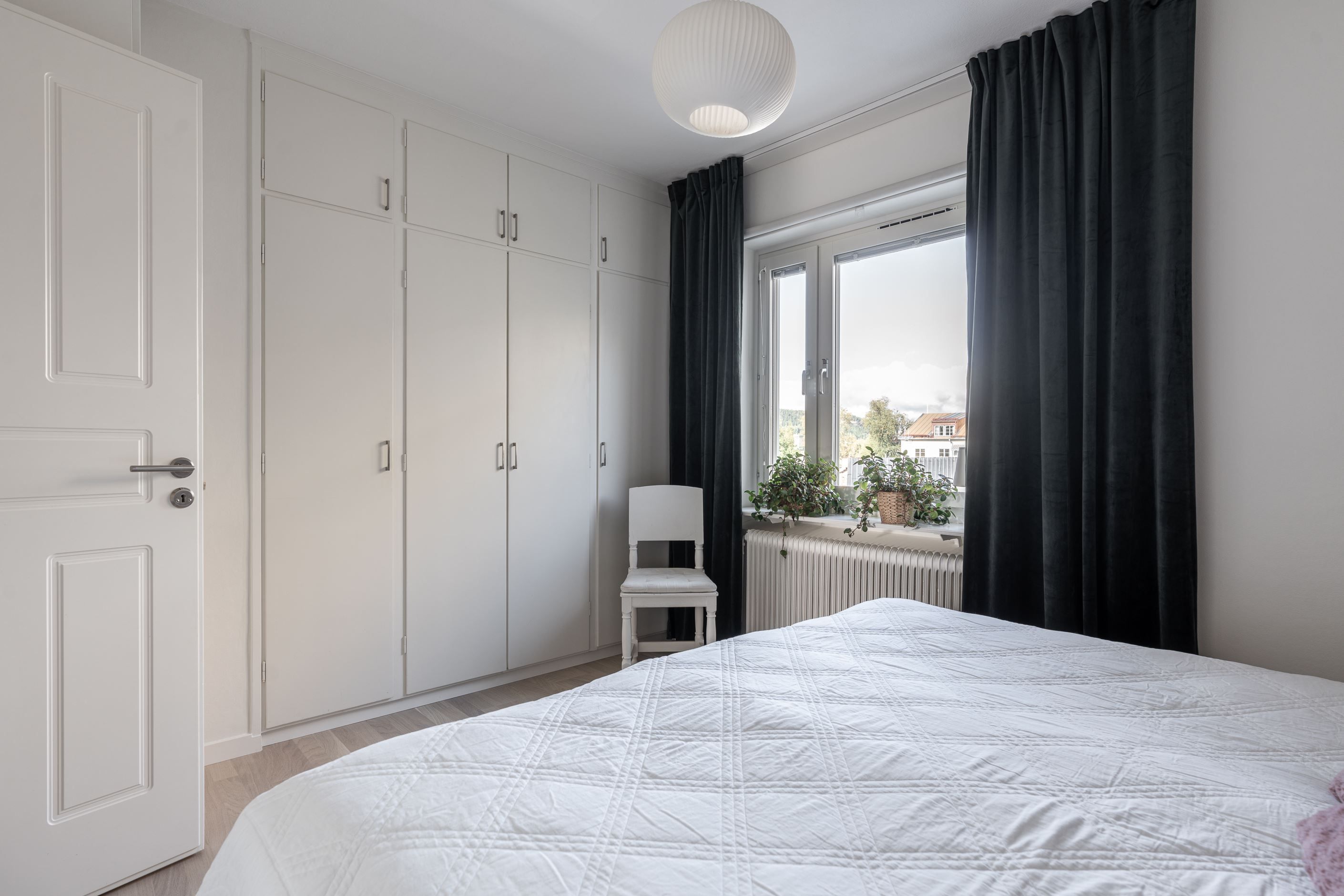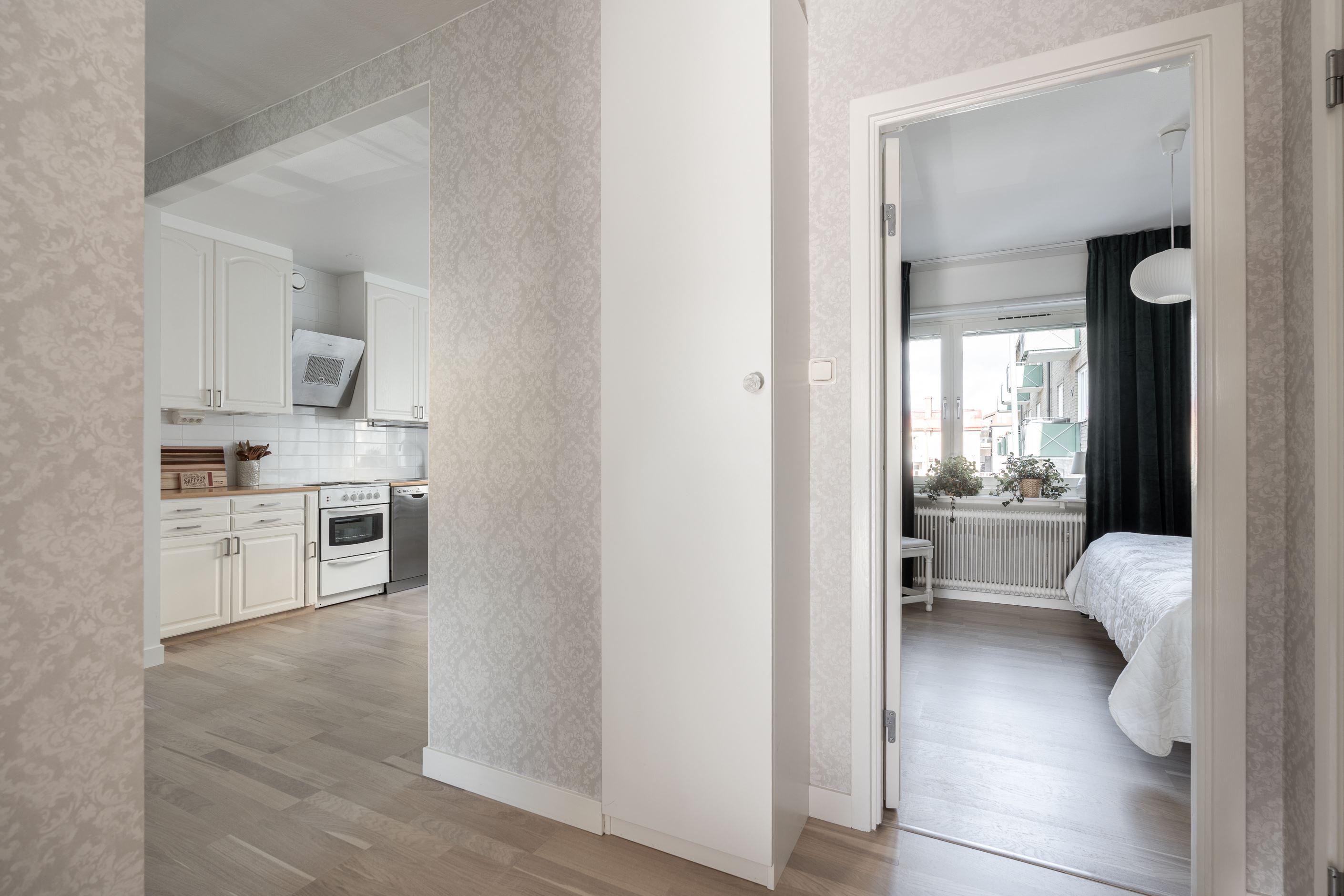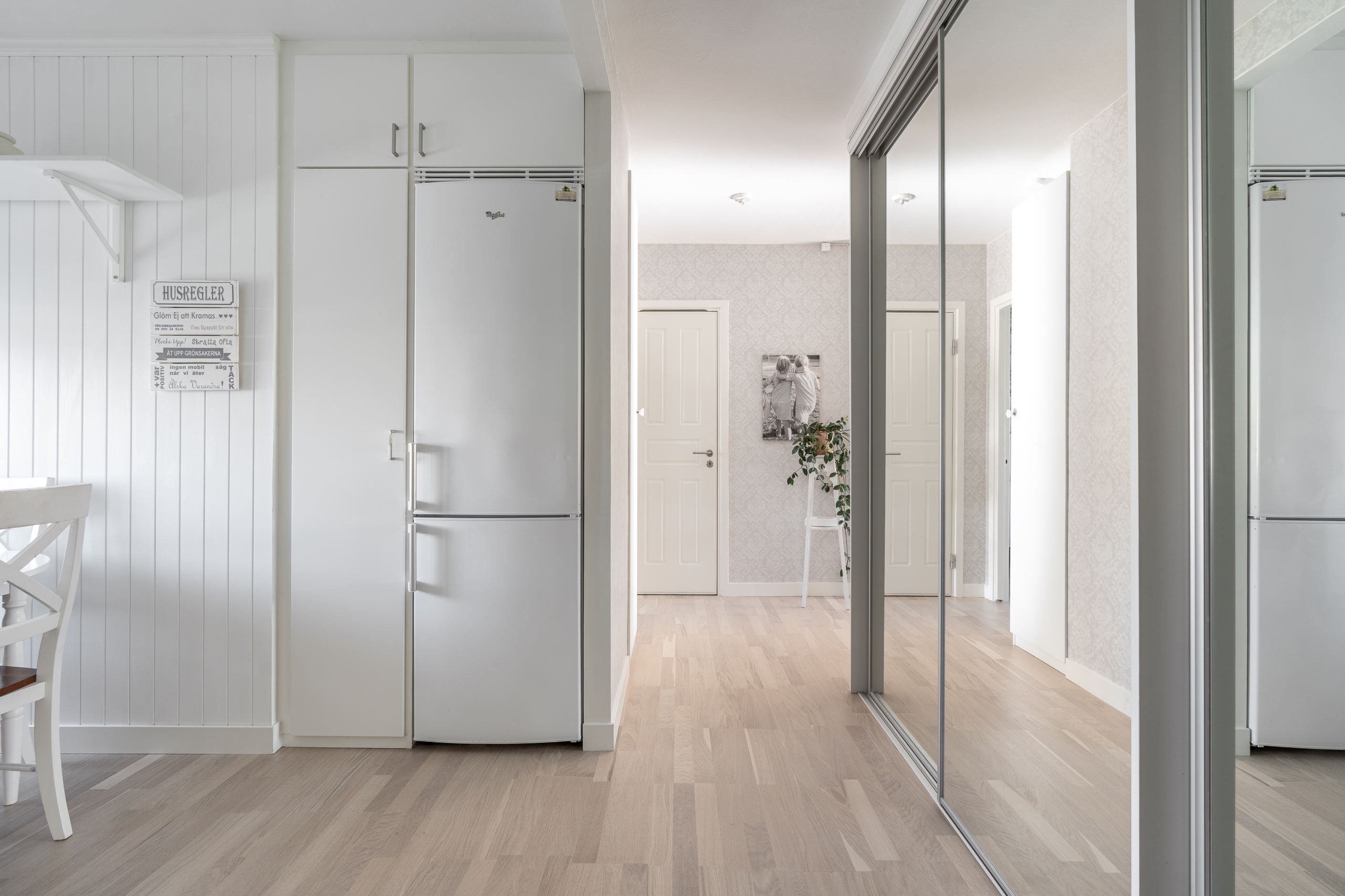 I hallen möts du av praktiska spegelgarderober med bra förvaring, och sovrummet erbjuder dessutom gott om plats för både vila och klädförvaring. Badrummet totalrenoverades i samband med stambytet och kombinerar stil och funktion med dusch, toppmatad tvättmaskin, vägghängd wc och kommod.