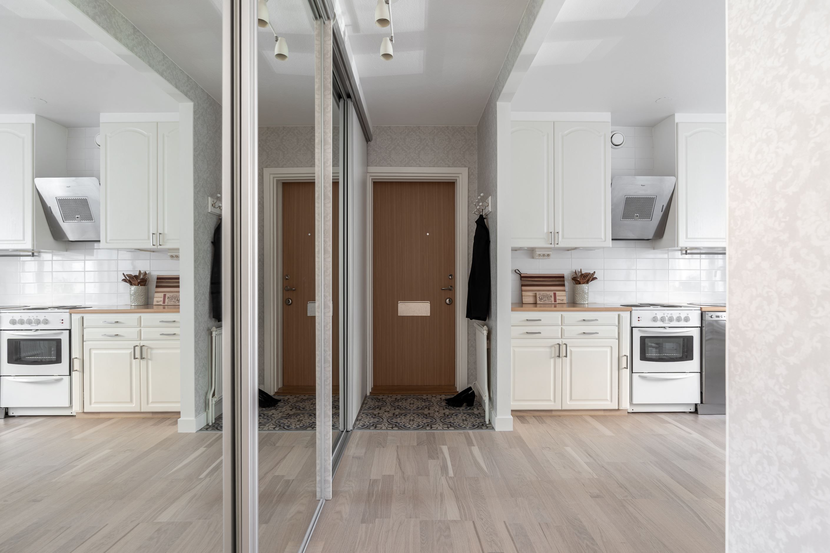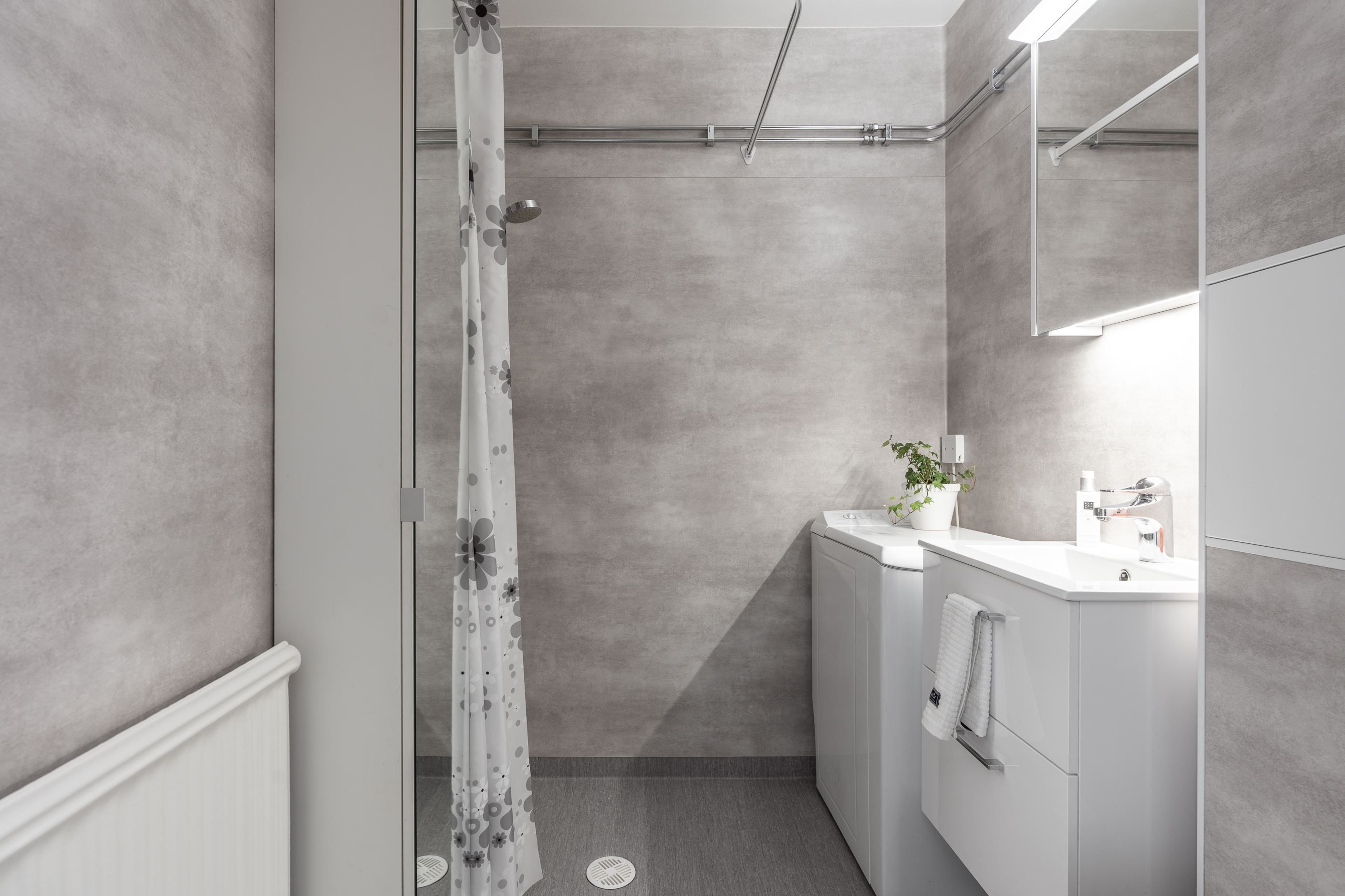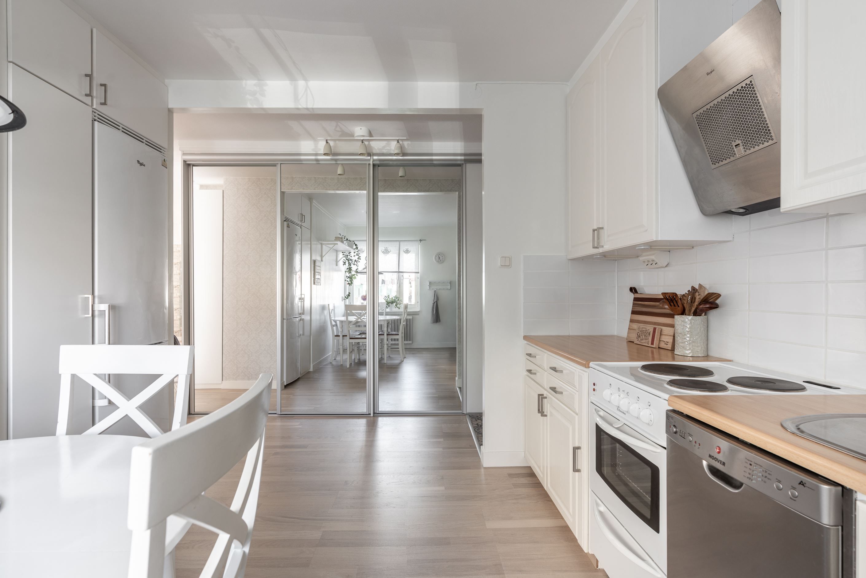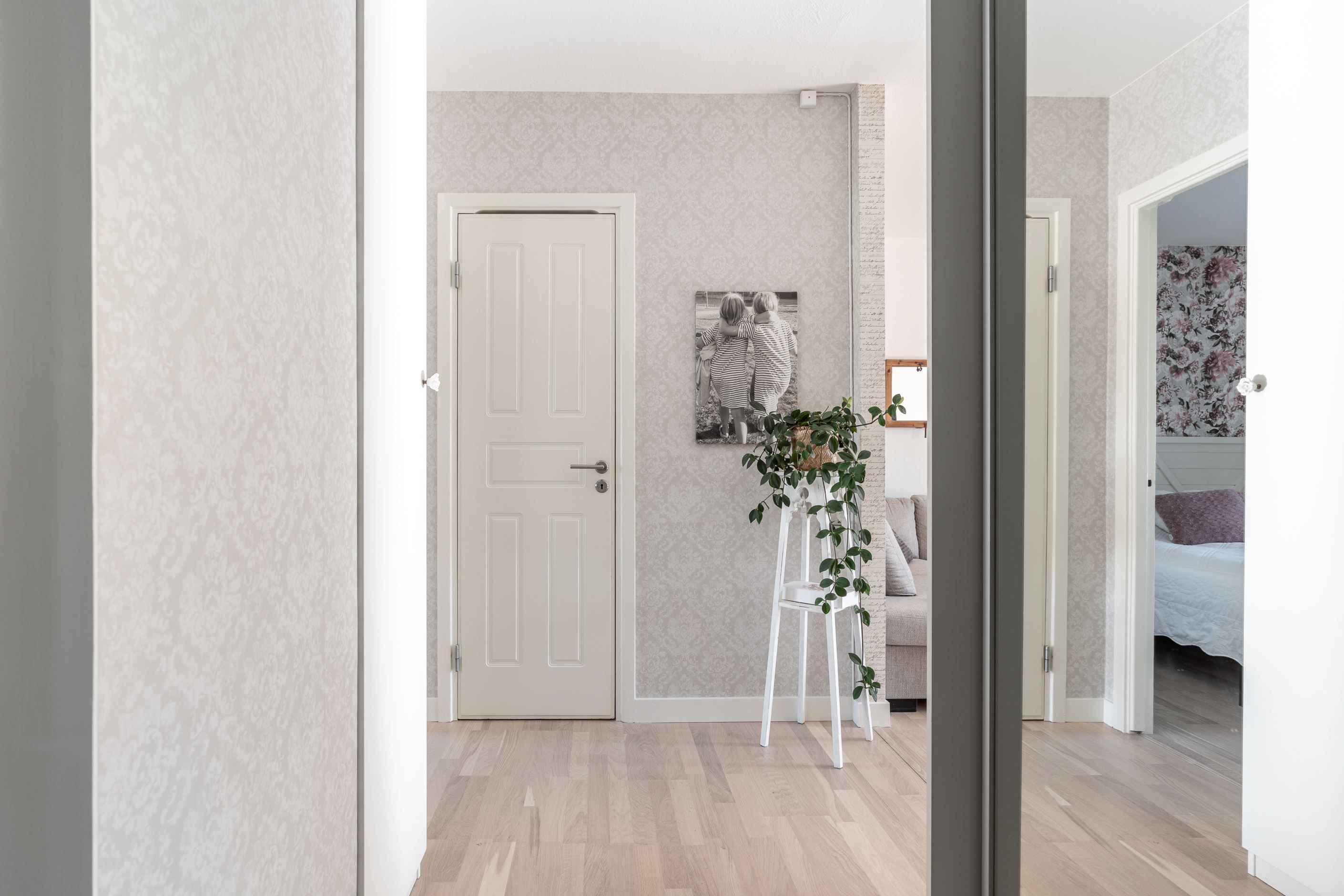 I hallen möts du av praktiska spegelgarderober med bra förvaring, och sovrummet erbjuder dessutom gott om plats för både vila och klädförvaring. Badrummet totalrenoverades i samband med stambytet och kombinerar stil och funktion med dusch, toppmatad tvättmaskin, vägghängd wc och kommod.