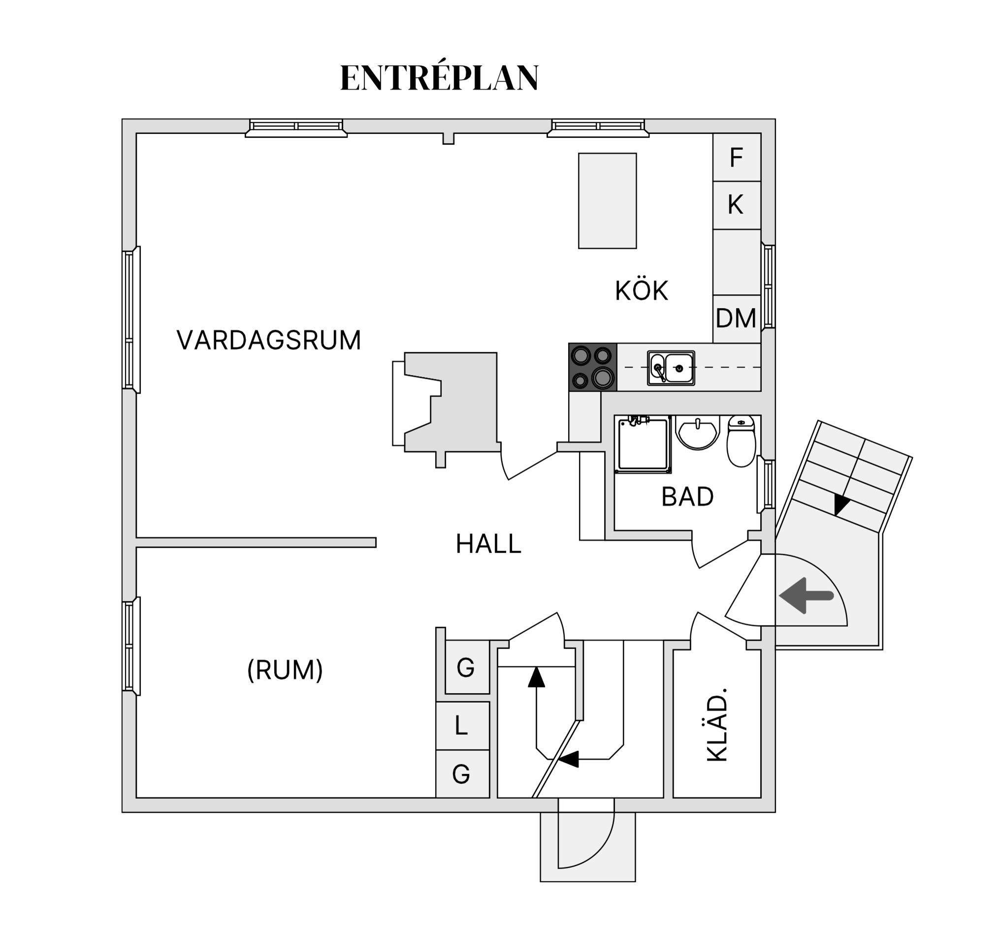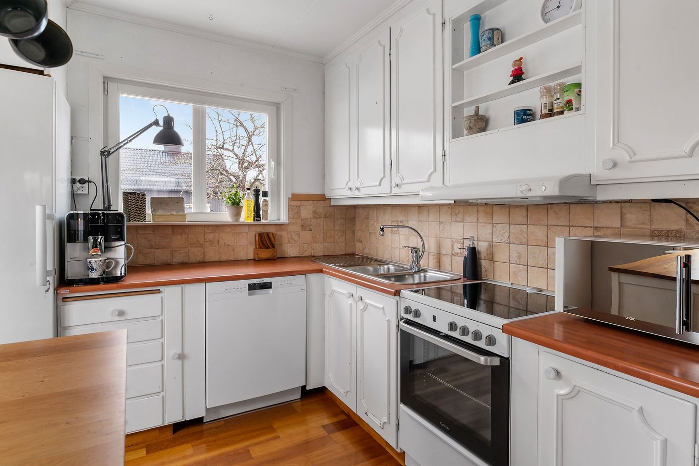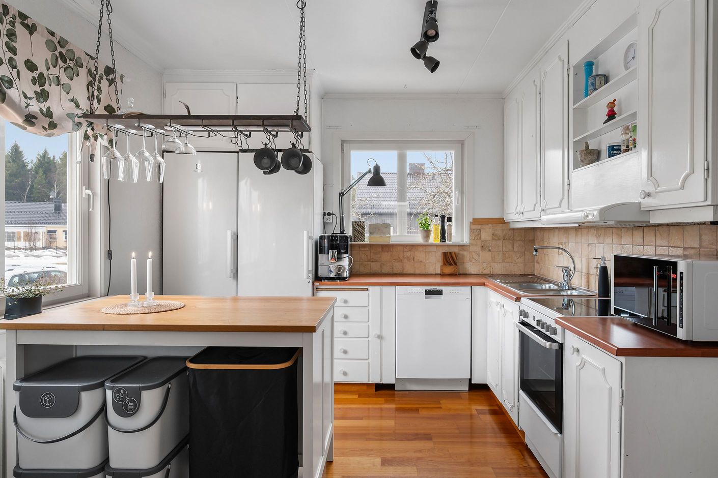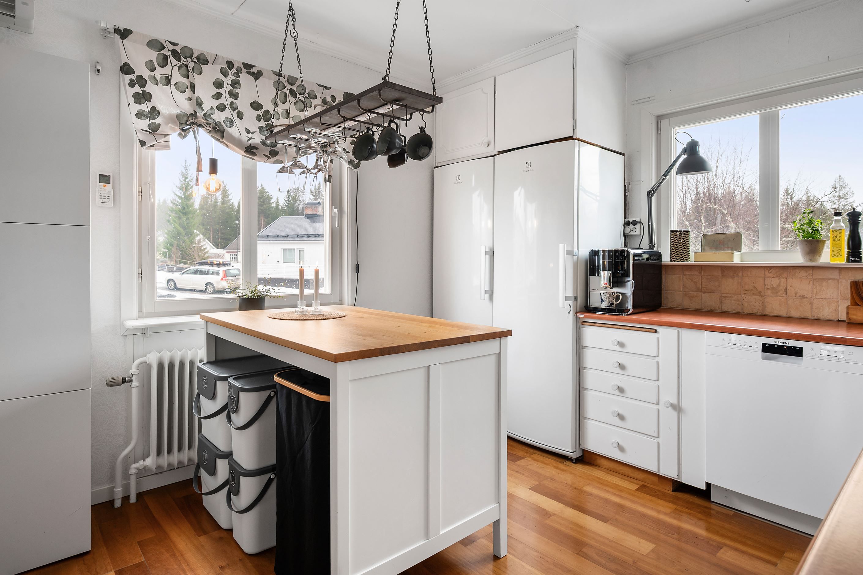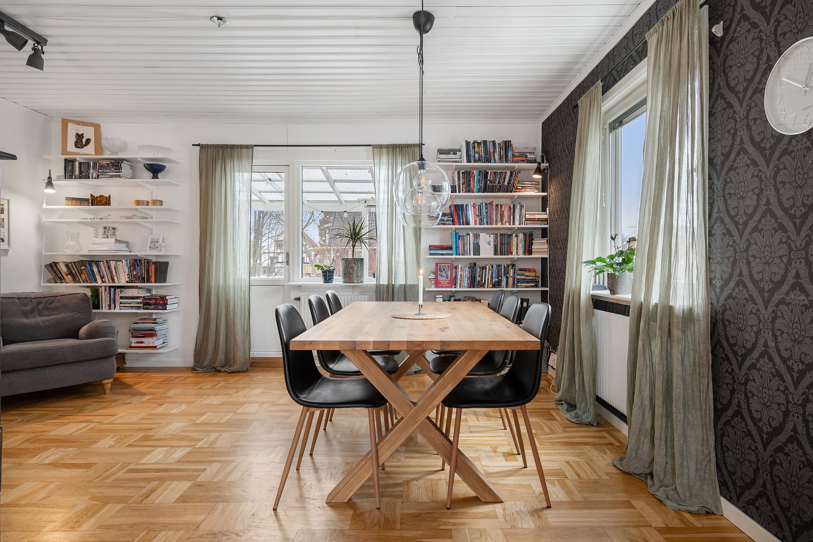 Entréplanet erbjuder ett trivsamt kök med fint ljusinsläpp från två håll. Här finns en praktisk köksö som skapar extra arbetsyta och naturlig samlingspunkt – perfekt för vardagsmiddagar. Vitvarorna byttes 2019 och ger en modern funktion i det charmiga originalköket. På entréplanet finns även ett renoverat badrum (2012, inklusive stambyte), samt vardagsrum med gott om plats för både soffgrupp och matplats.