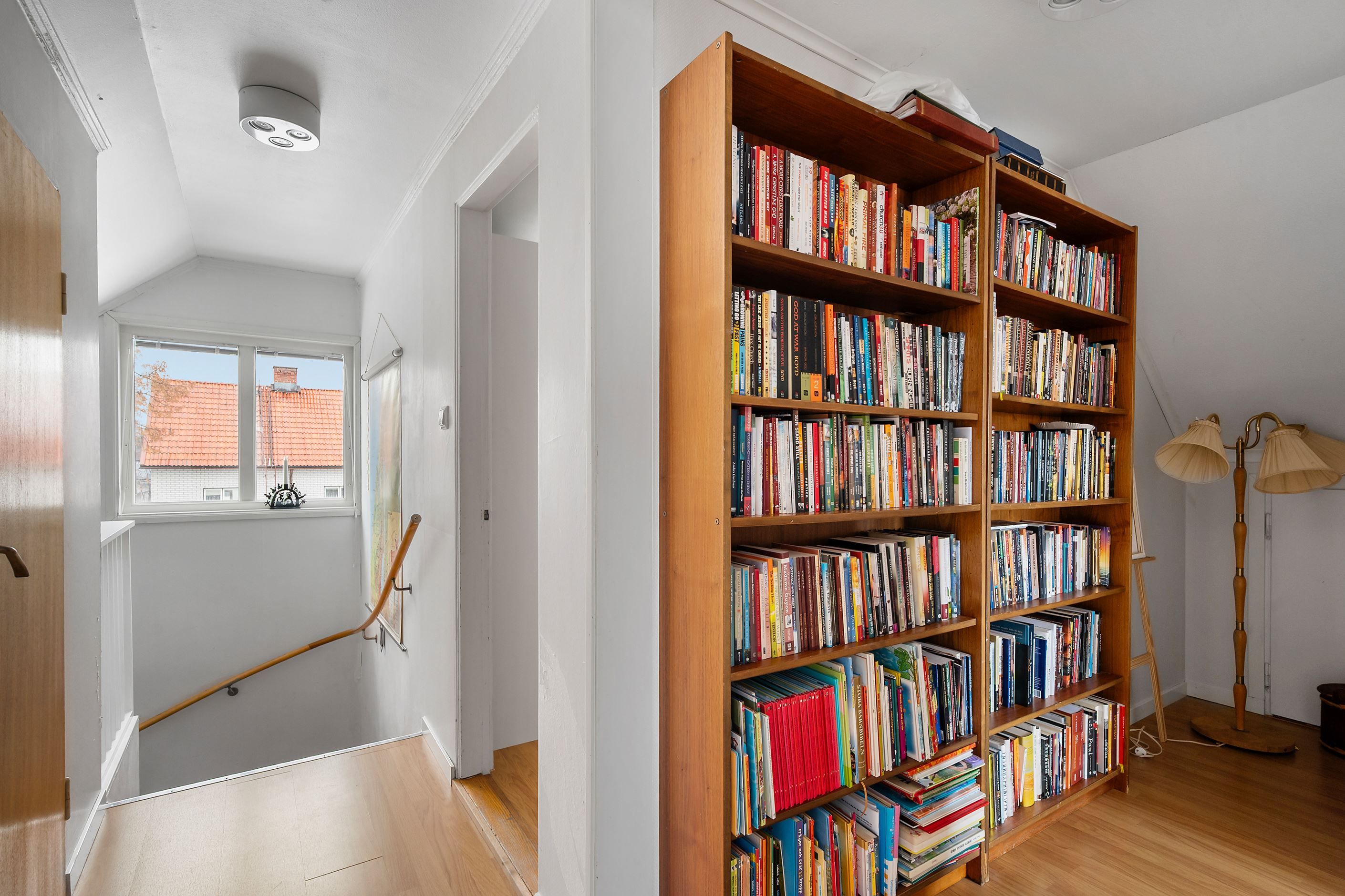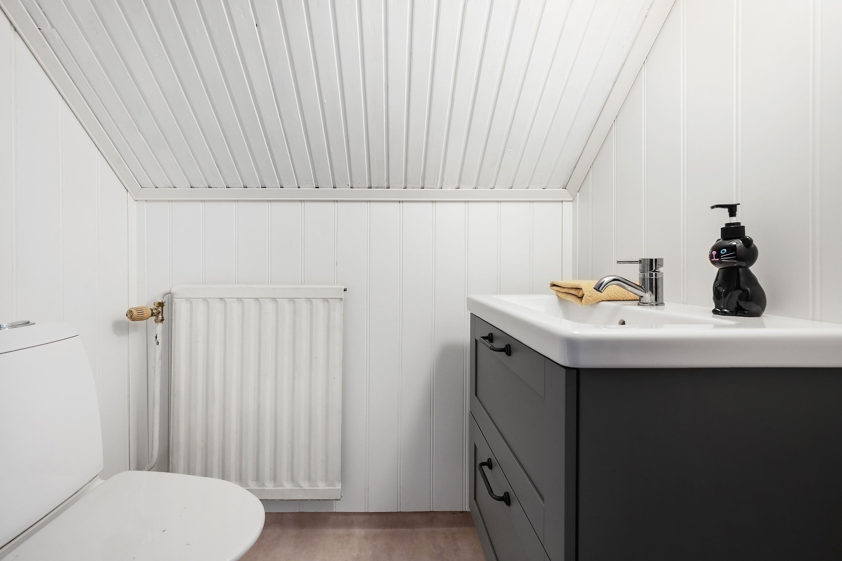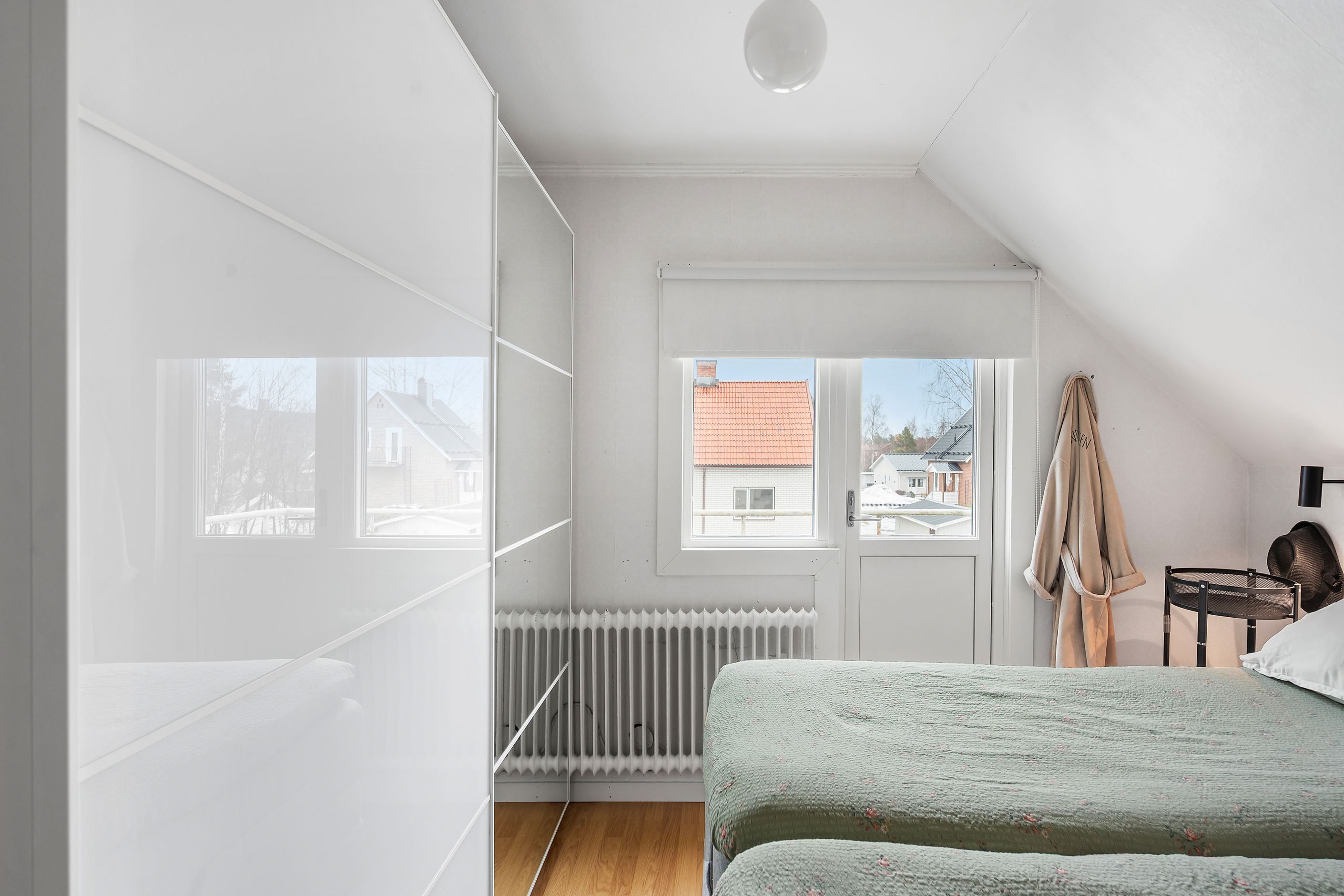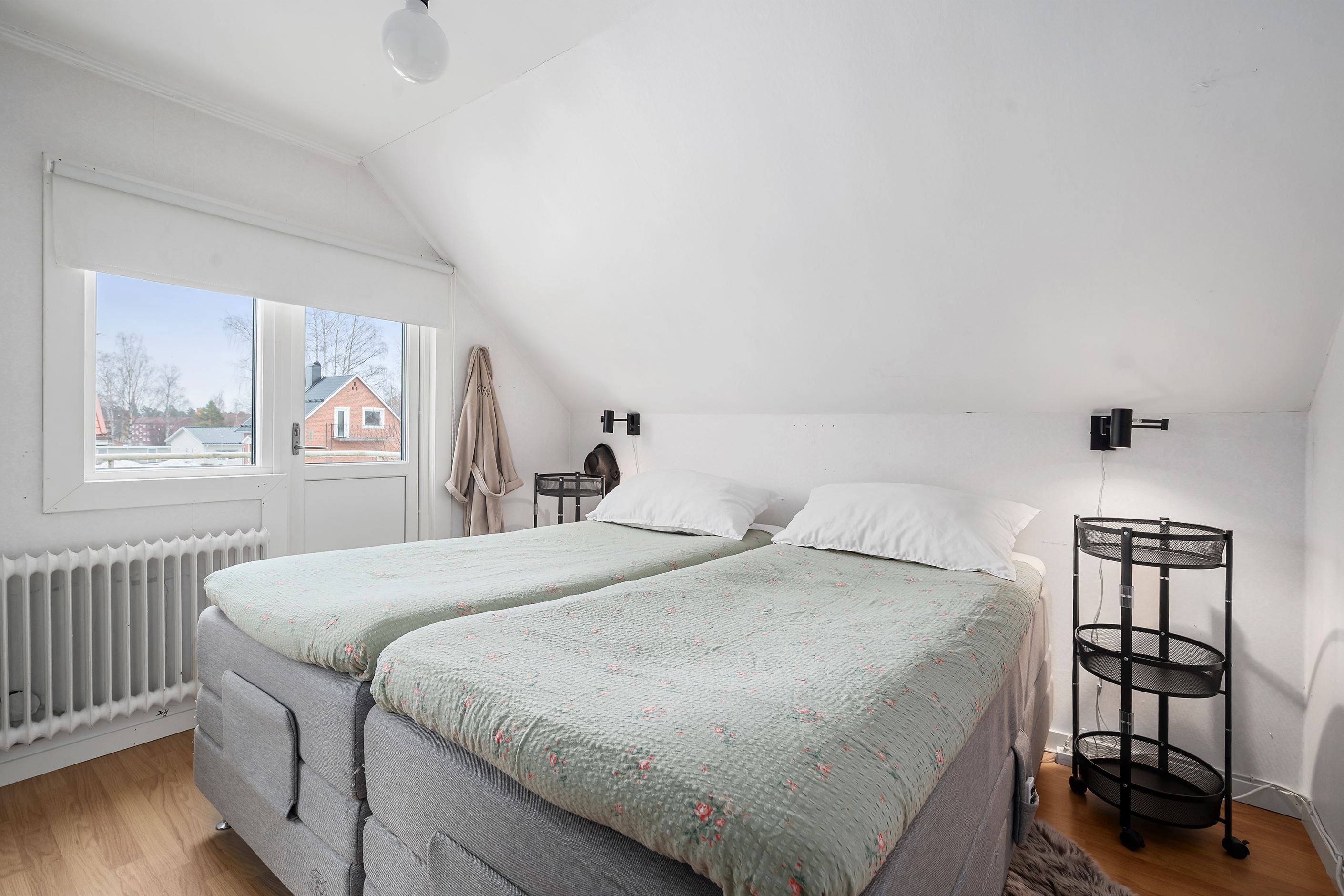 På övre plan finns två sovrum samt en renoverad toalett (februari 2026). I samband med detta byttes även stammar från kök upp till toaletten – en trygg och värdefull uppdatering. Ett större sovrum har tidigare delats av för att skapa två mindre (2012), vilket ger totalt fyra sovrum i huset – perfekt för barnfamiljen eller för dig som vill kombinera sovrum och hemmakontor.