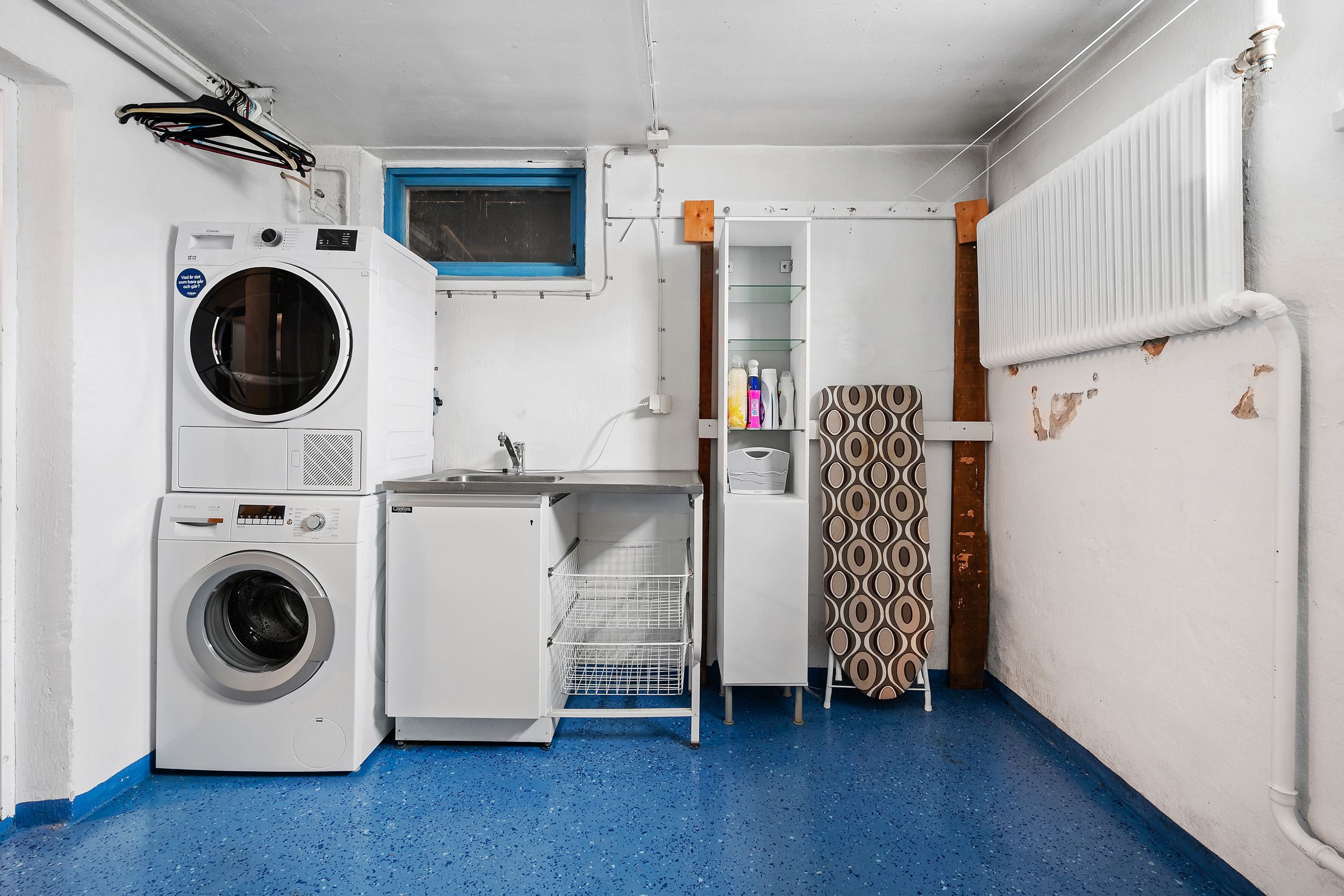 Källaren ger gott om extra utrymme. Här finns tvättstuga med maskiner från 2016 samt ett rum som färdigställdes 2019 – perfekt som gästrum, hobbyrum eller tonårsdel.