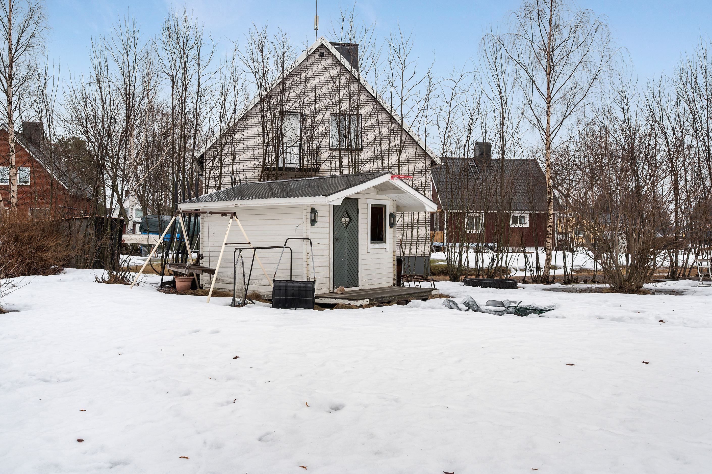 Den plana tomten om 788 kvm ger fina möjligheter för lek, odling eller framtida uteplats. Runt huset löper en grusgång och på tomten finns även en friggebod för extra förvaring.
