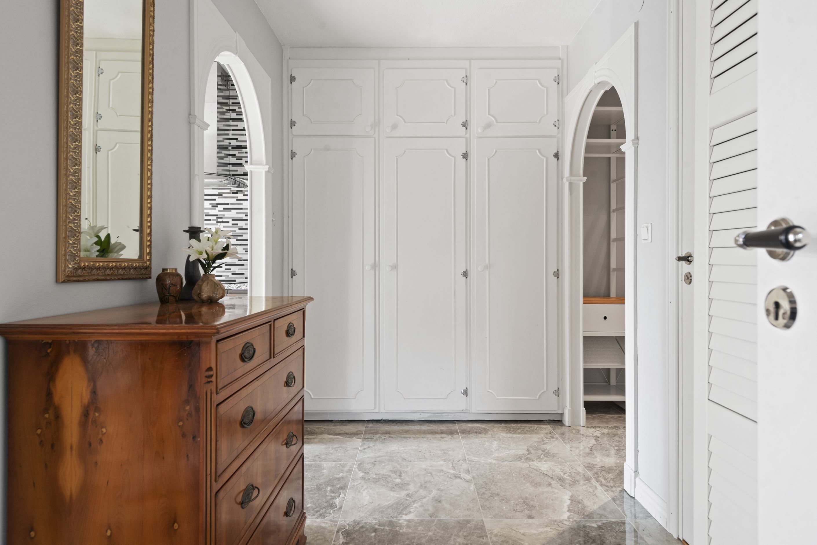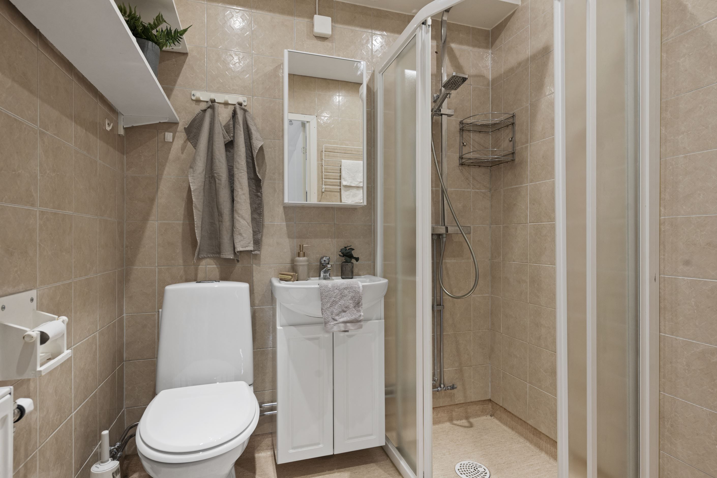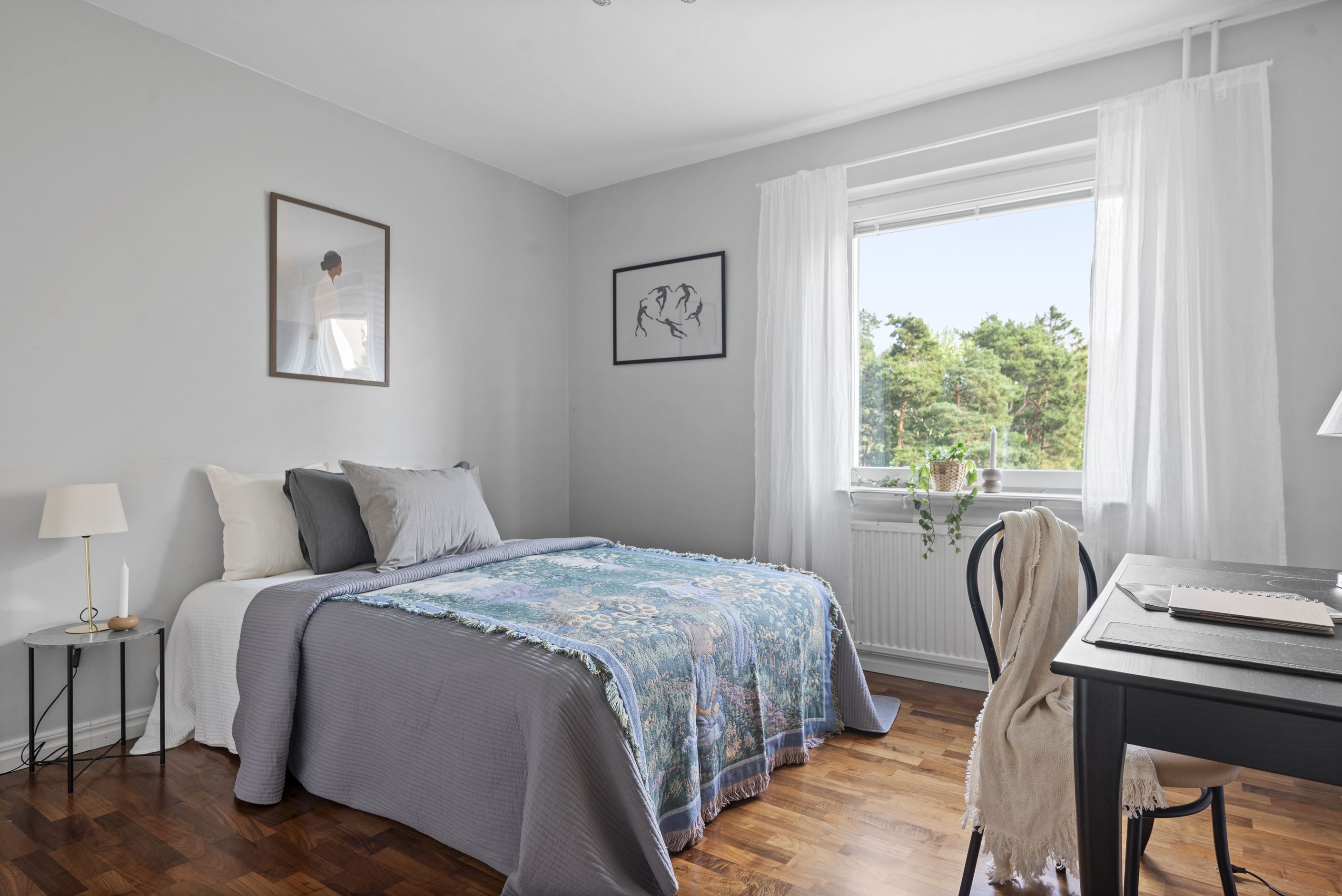 Det rogivande sovrummet har plats för dubbelsäng och sängbord. Gott om förvaring i flera garderober. I entrén finns plats för avhängning samt flera garderober, perfekt för både skor och ytterkläder. Badrummet är helkaklat med plastmatta på golvet och dusch.
