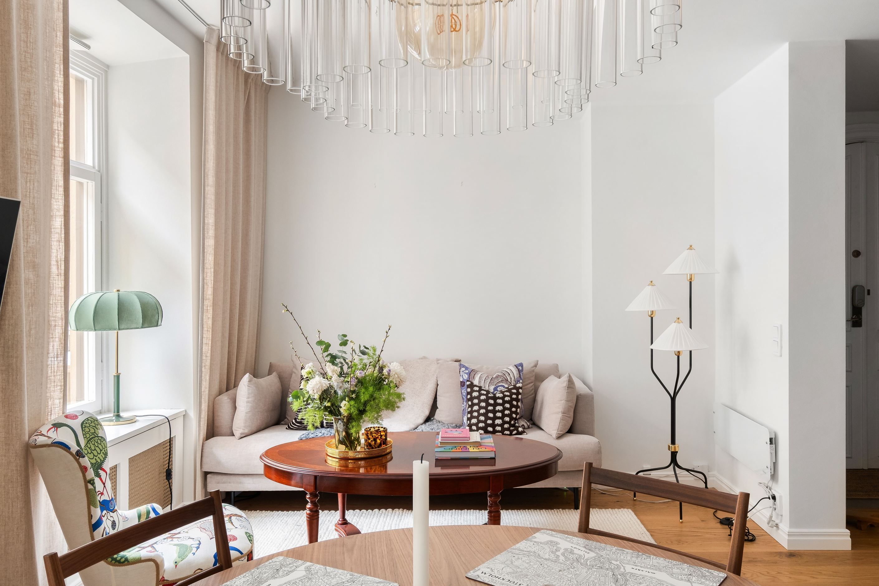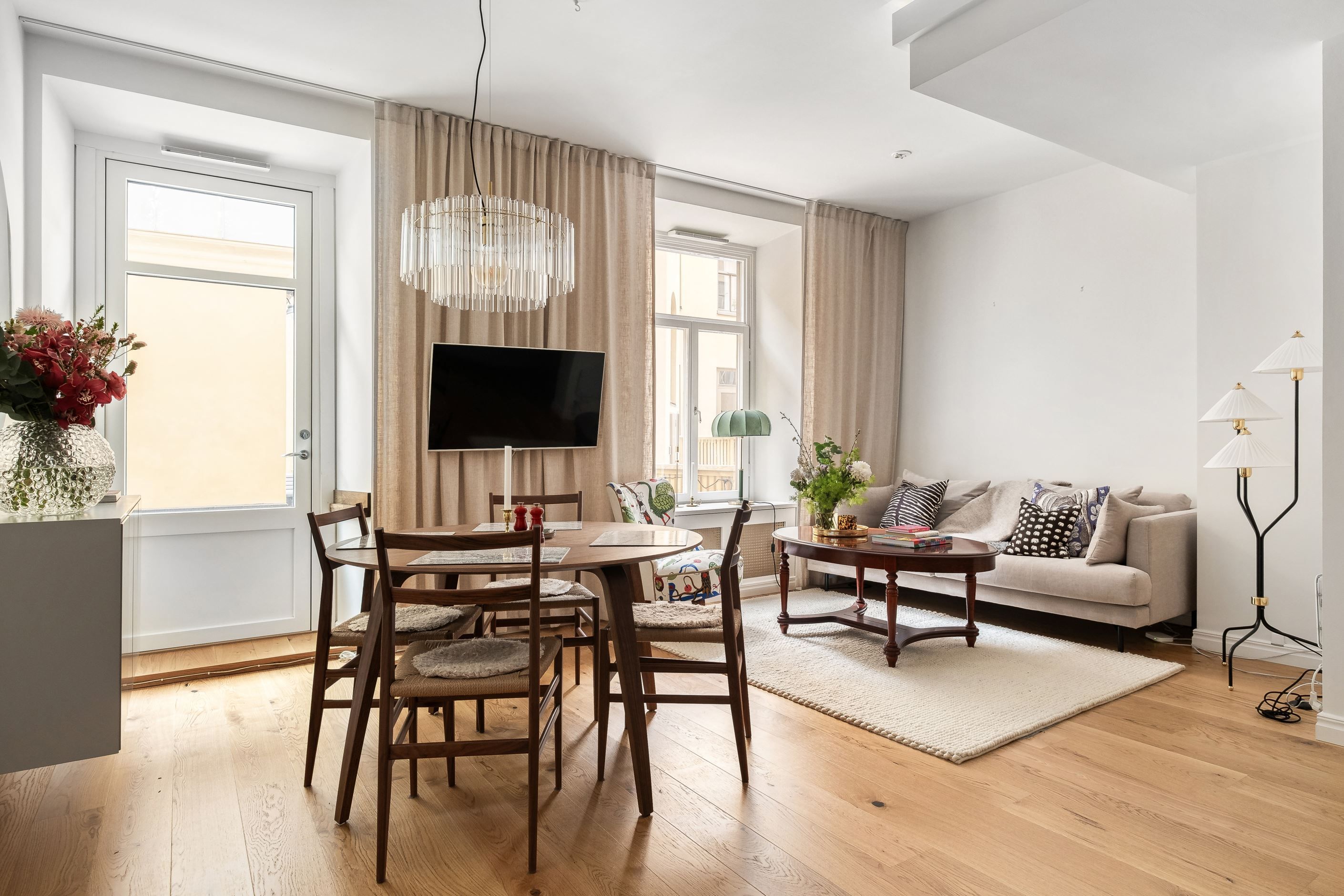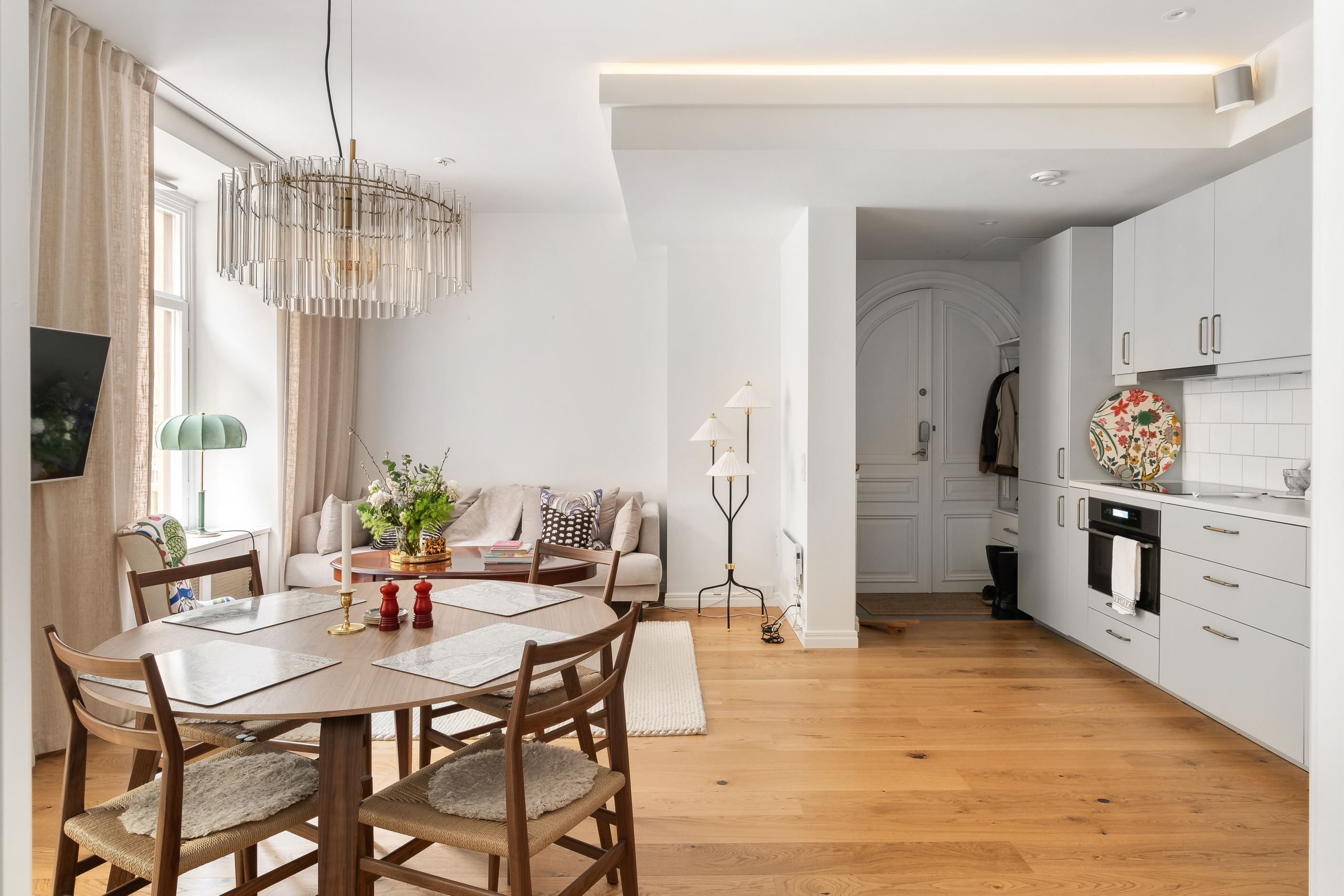 Bostaden är stilfullt renoverad med stor omsorg och präglas av noggrant utvalda materialval, harmoniska färgtoner och ett vackert trägolv som löper enhetligt genom hela hemmet. Generösa fönsterpartier mot innergården ger ett fantastiskt ljusinsläpp och skapar en luftig och trivsam atmosfär. Den smarta och genomtänkta planlösningen binder samman kök och vardagsrum i en social och inbjudande yta – perfekt för både vardagsliv och umgänge.