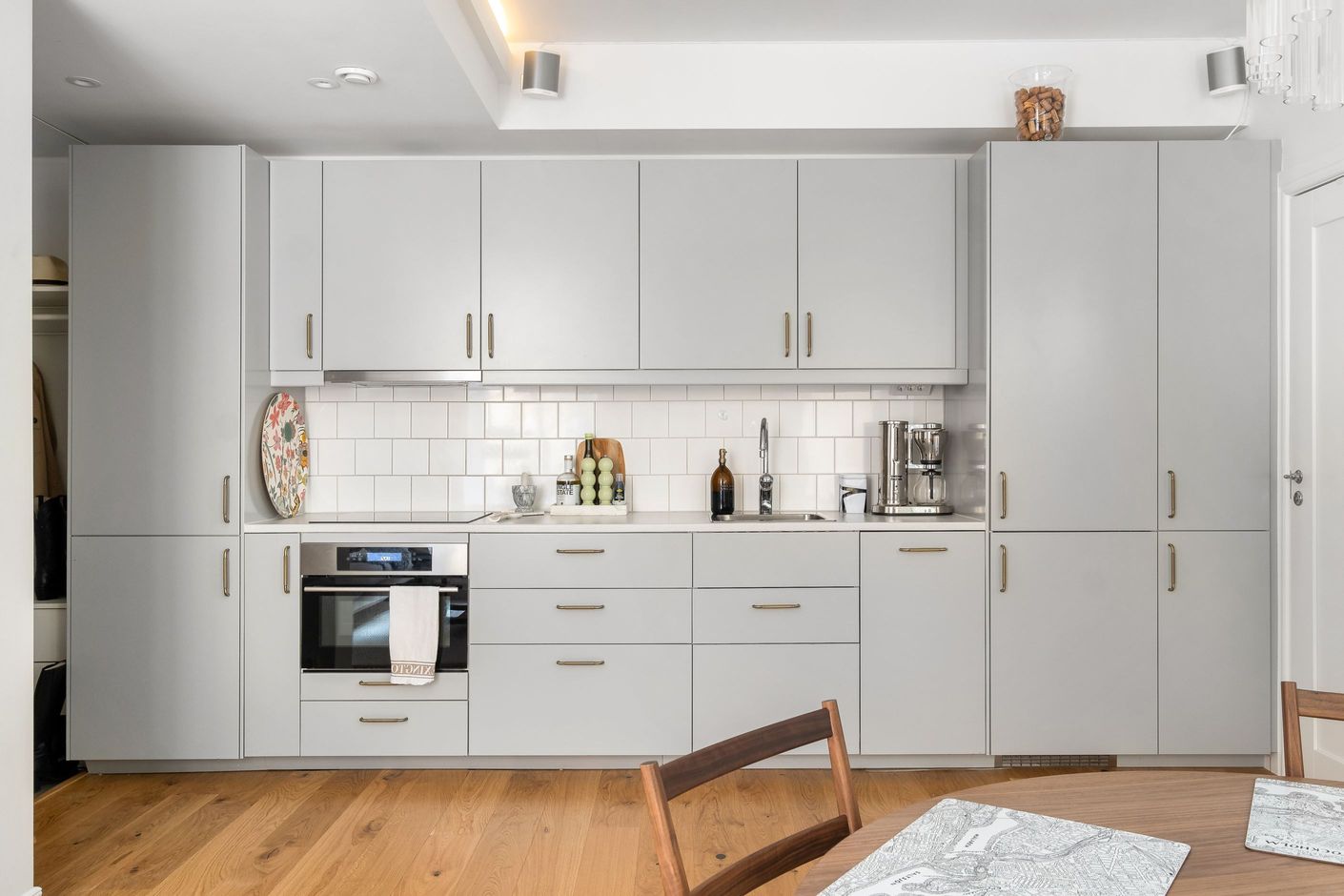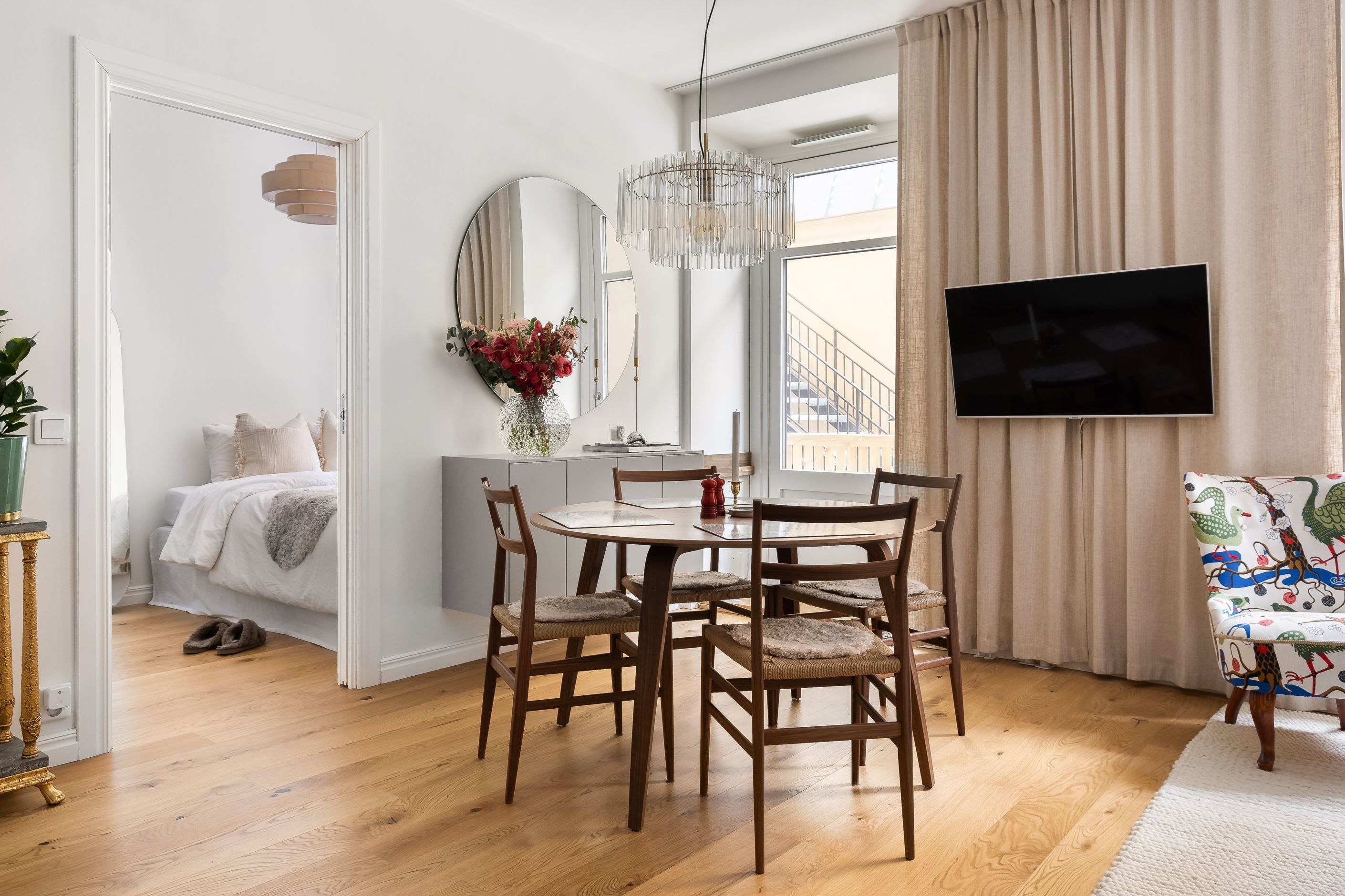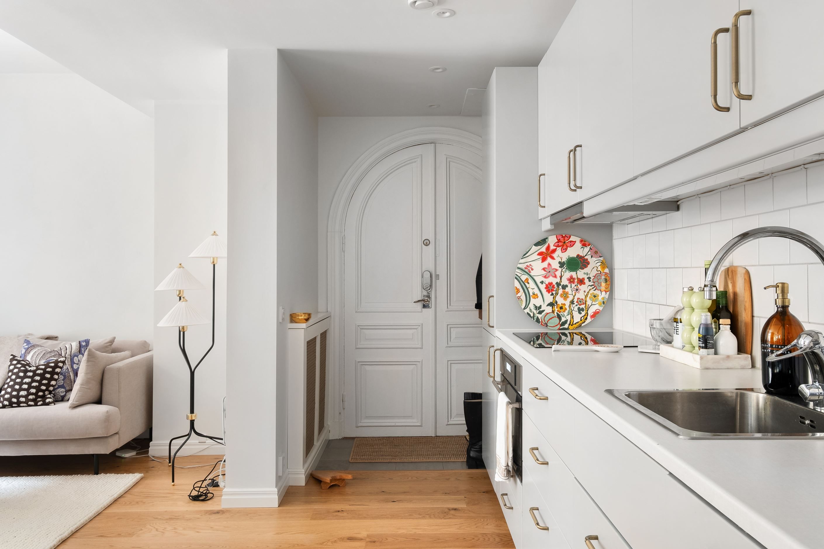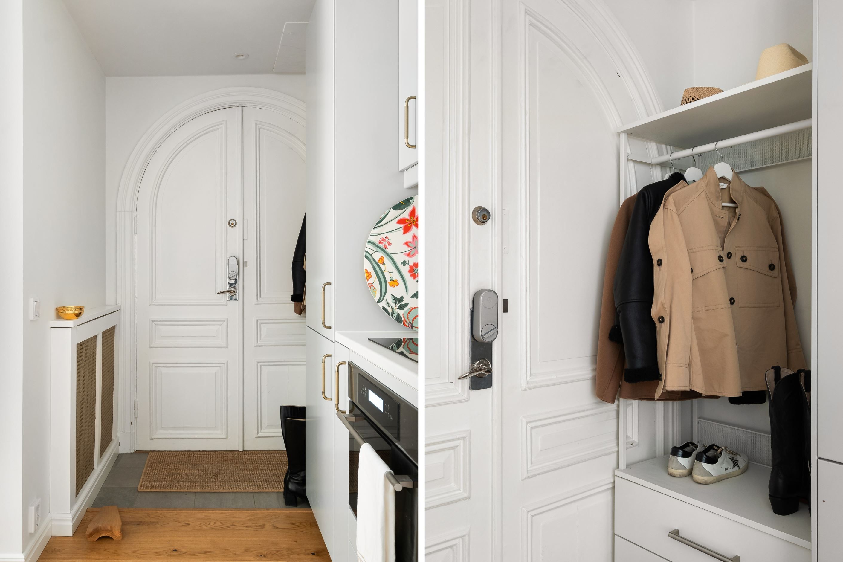 Bostaden är stilfullt renoverad med stor omsorg och präglas av noggrant utvalda materialval, harmoniska färgtoner och ett vackert trägolv som löper enhetligt genom hela hemmet. Generösa fönsterpartier mot innergården ger ett fantastiskt ljusinsläpp och skapar en luftig och trivsam atmosfär. Den smarta och genomtänkta planlösningen binder samman kök och vardagsrum i en social och inbjudande yta – perfekt för både vardagsliv och umgänge.