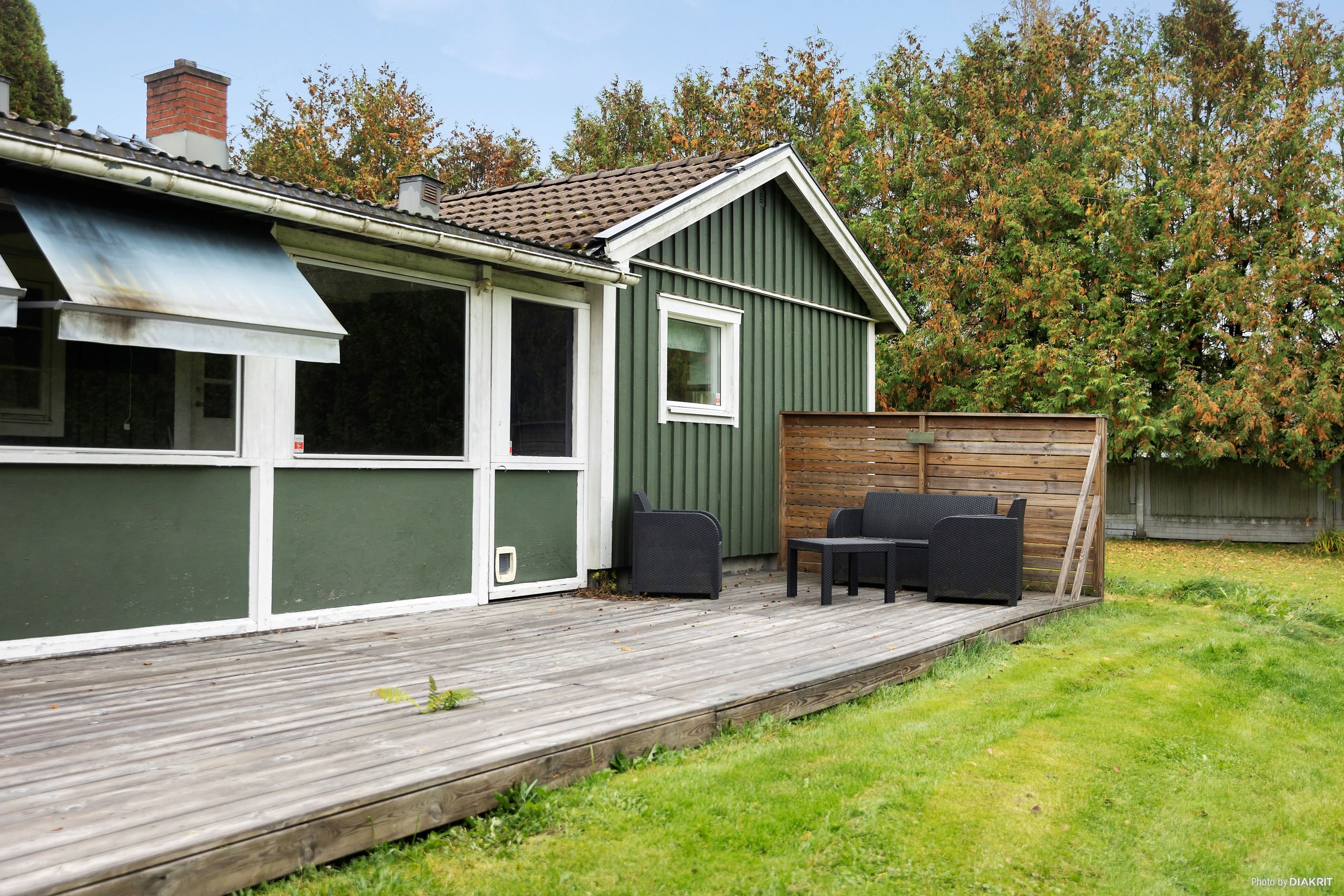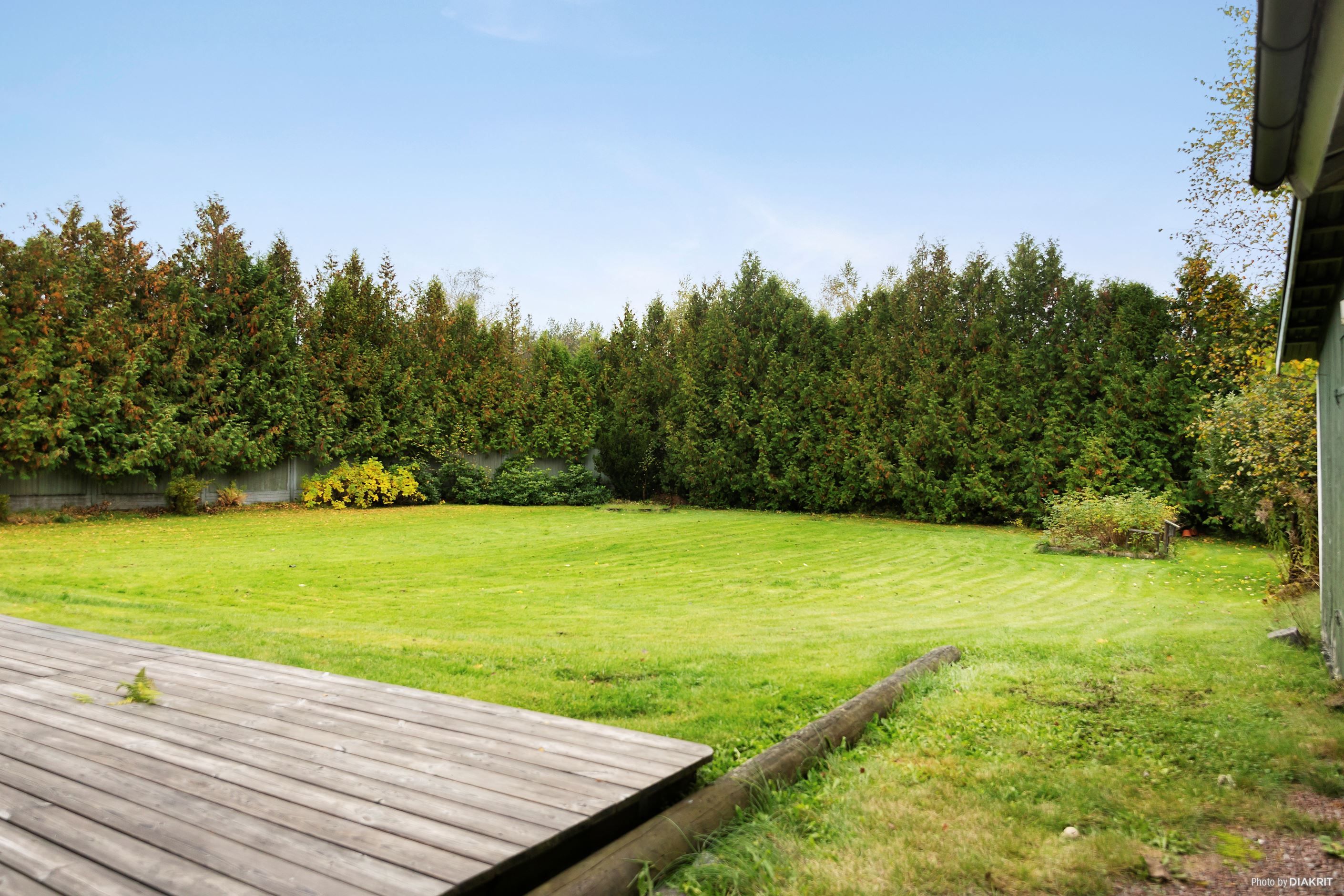 Huset ligger på en stor hörntomt och ramas in med en thujahäck vilket ger din en näst intill helt insynsskyddad trädgård.