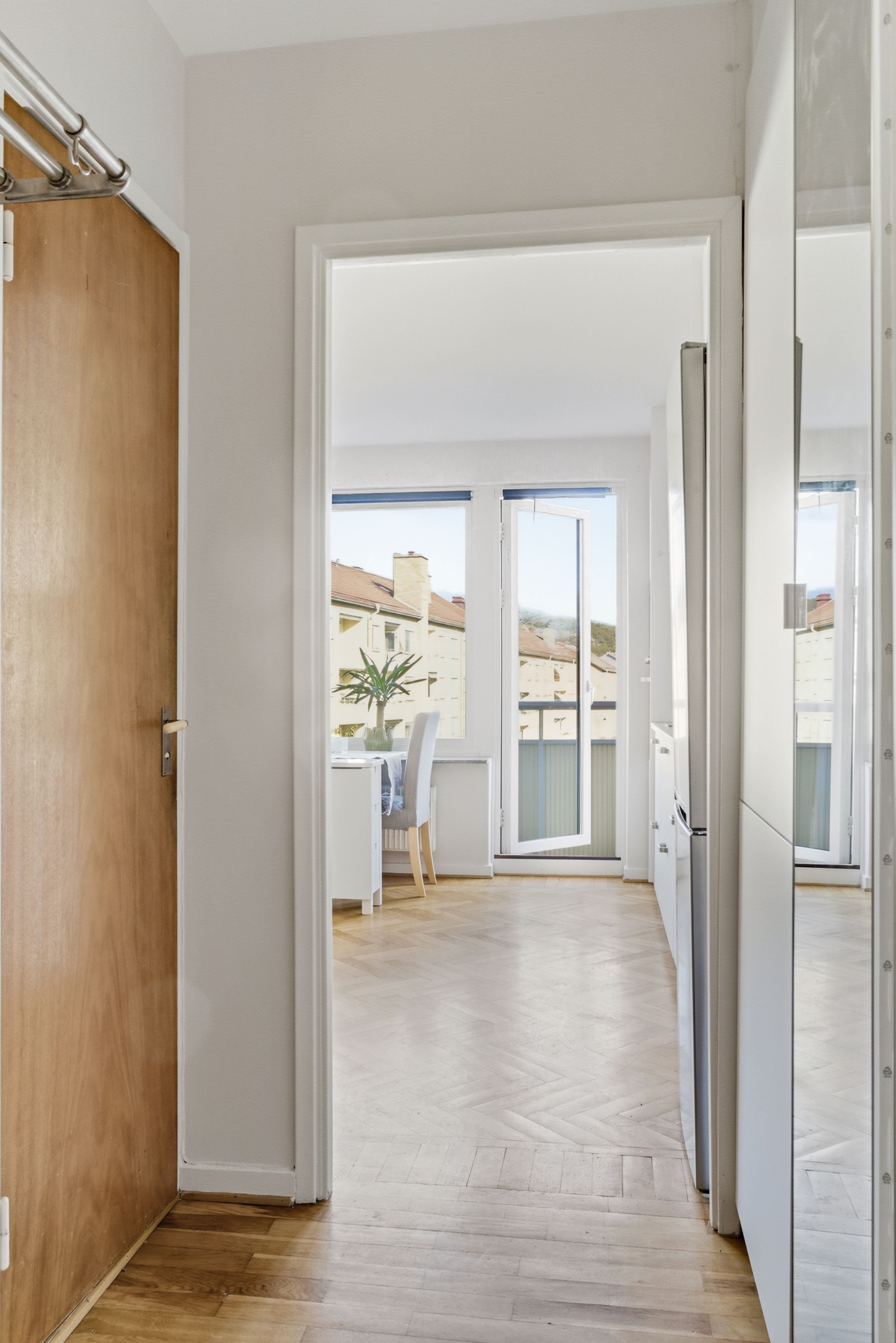 Det nyrenoverade köket går i stilrena färger och är fullt utrustat med kyl/frys, diskmaskin, micro/ugn, diskho och induktionshäll. Vardagsrum/sovrum är nymålat och pryds av vacker fiskbensparkett.