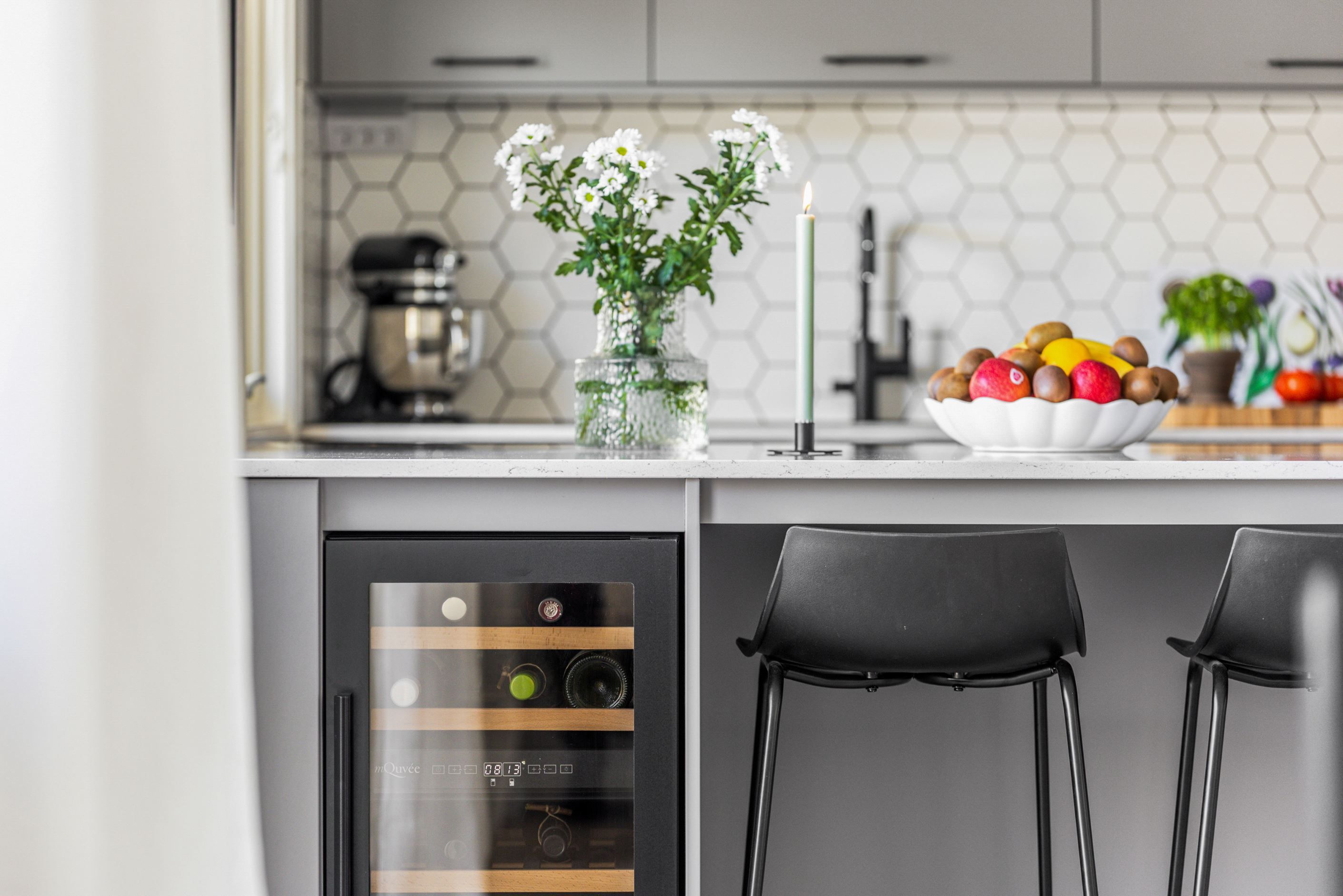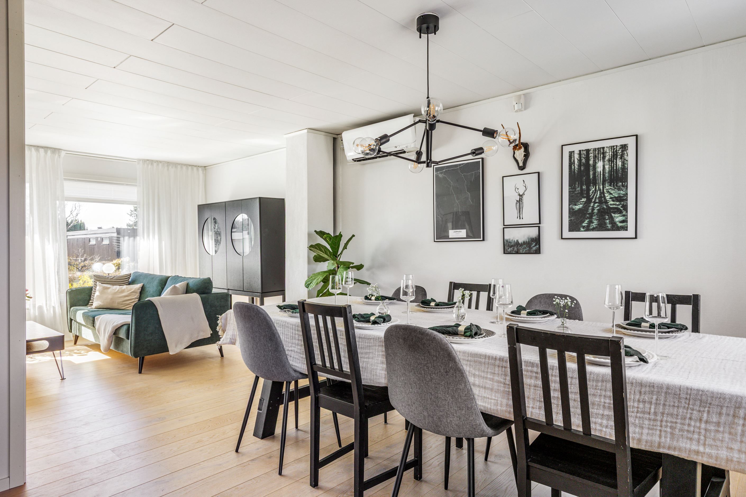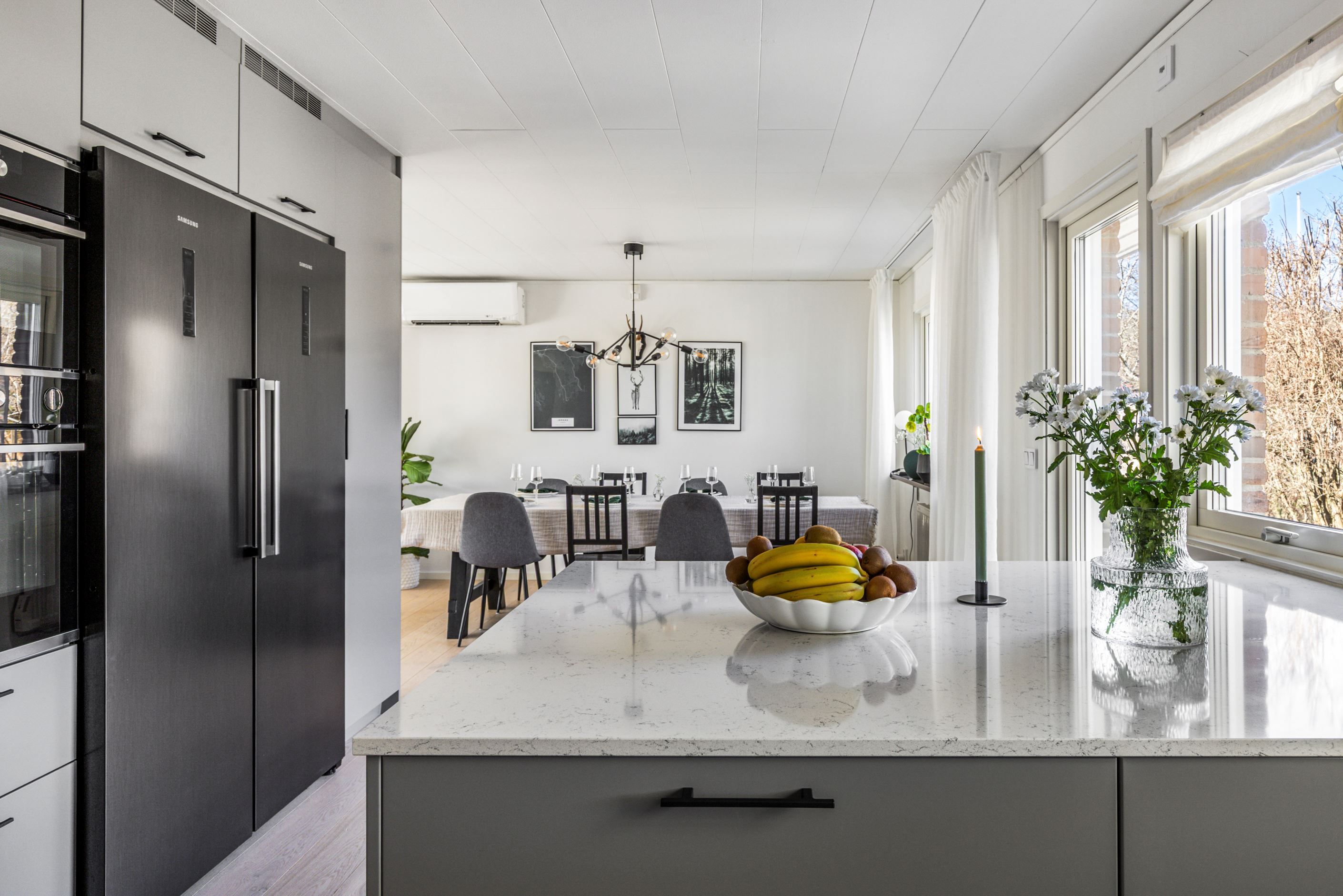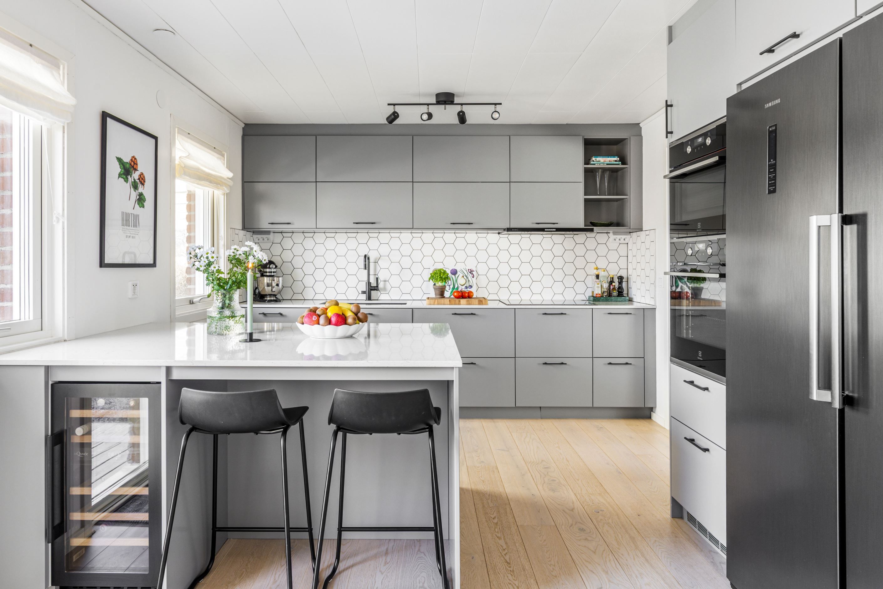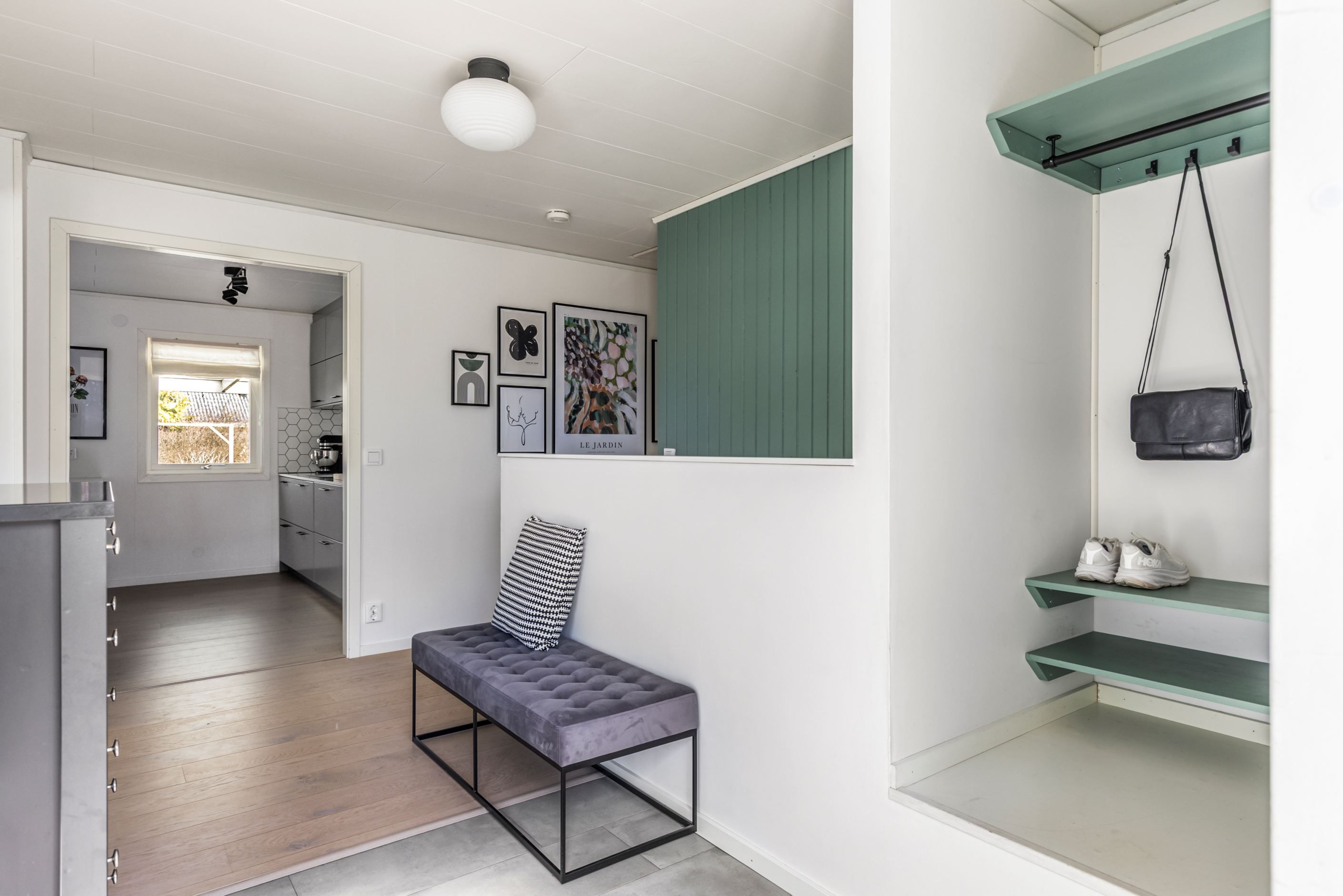 Redan i entrén möts du av ett enhetligt och stilrent intryck där det genomgående parkettgolvet sätter tonen. Bostaden öppnar därefter upp sig i en ljus och social yta där kök och vardagsrum samspelar på ett naturligt sätt.