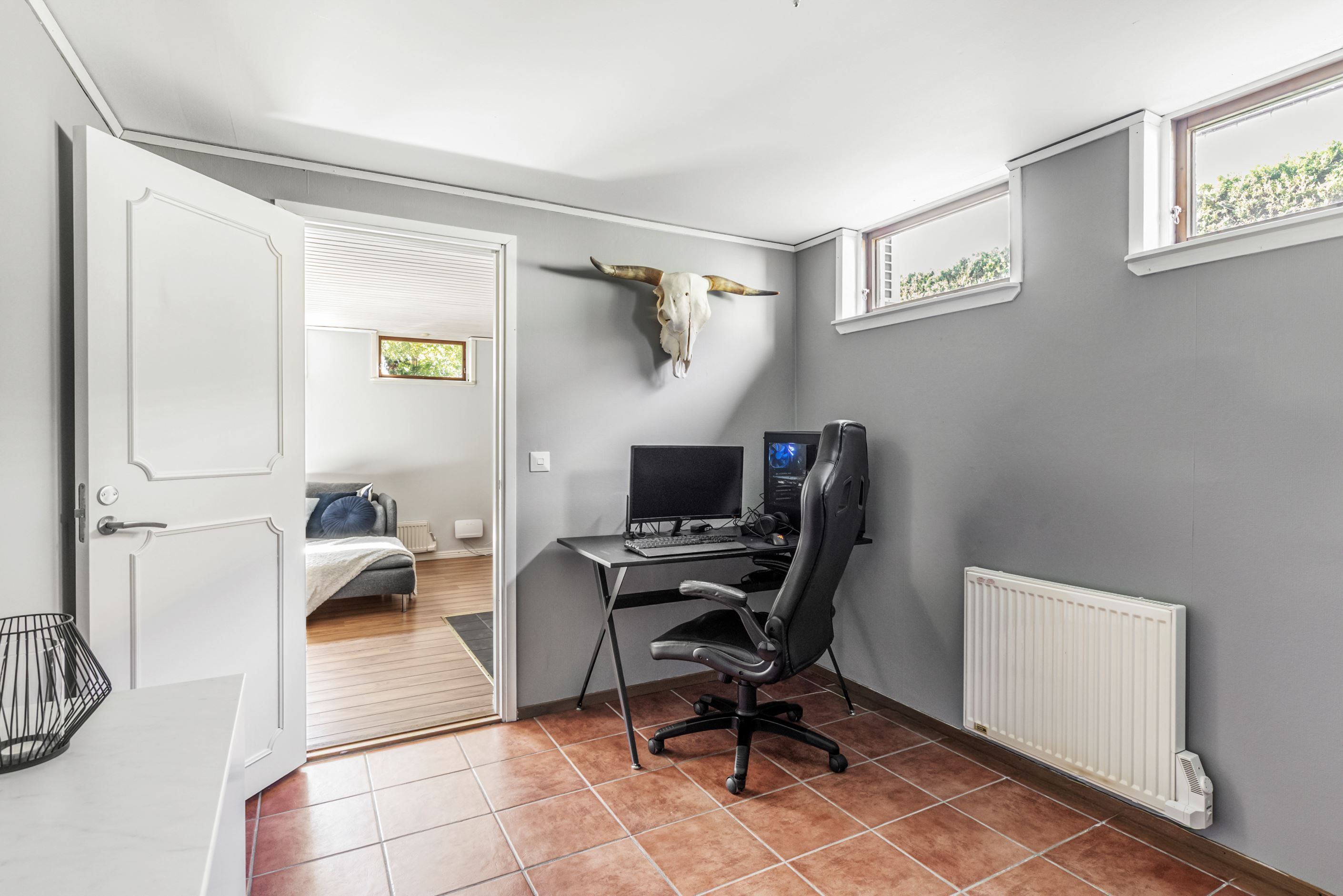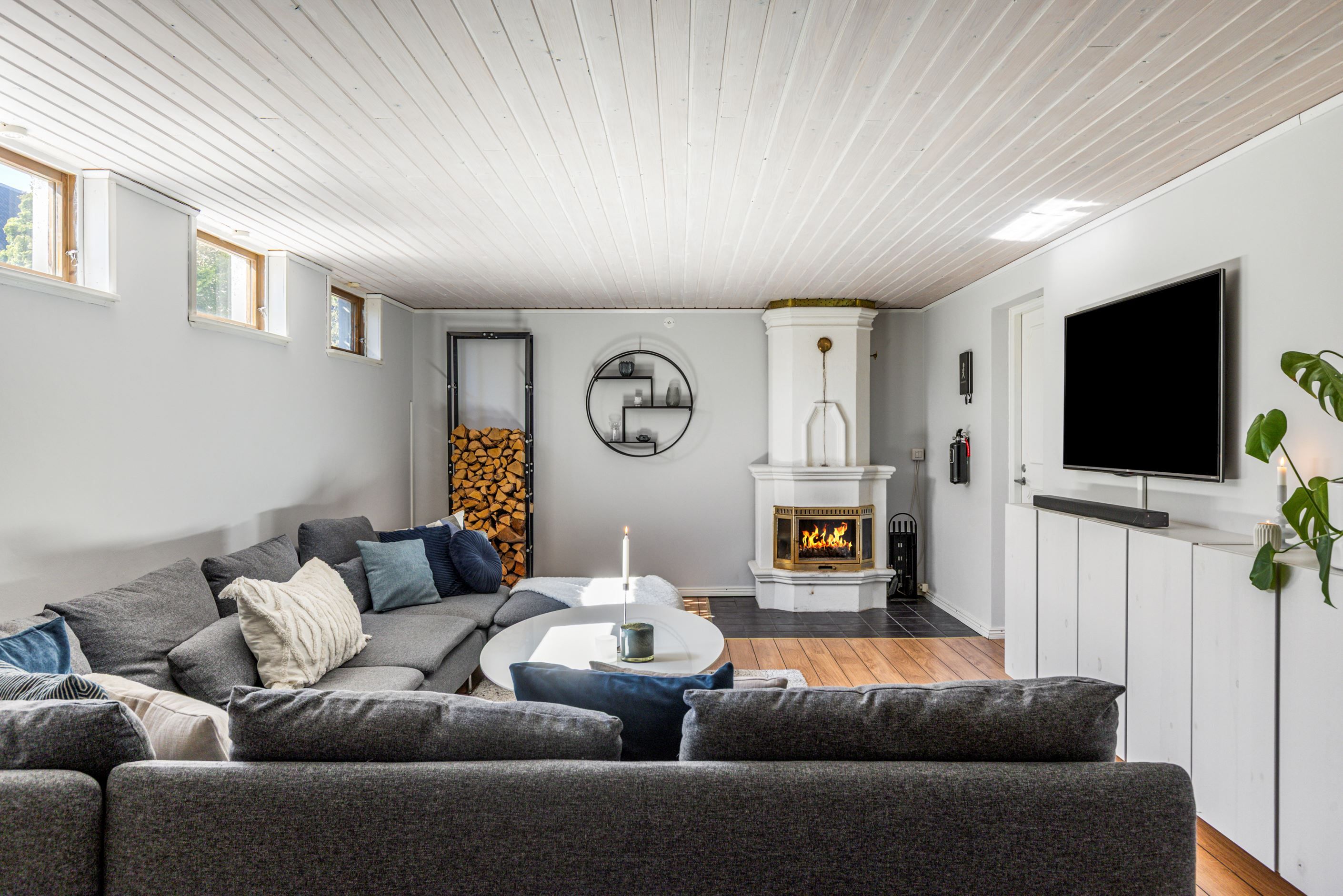 Källarplanet, som sträcker sig under hela huset, erbjuder stora och flexibla ytor. Här finns en trivsam gillestuga med eldstad, ytterligare rum som passar som sovrum, gästrum eller hobbyrum samt tvättstuga med dusch och bastu. Därtill finns separat WC, torkrum och gott om förvaring.