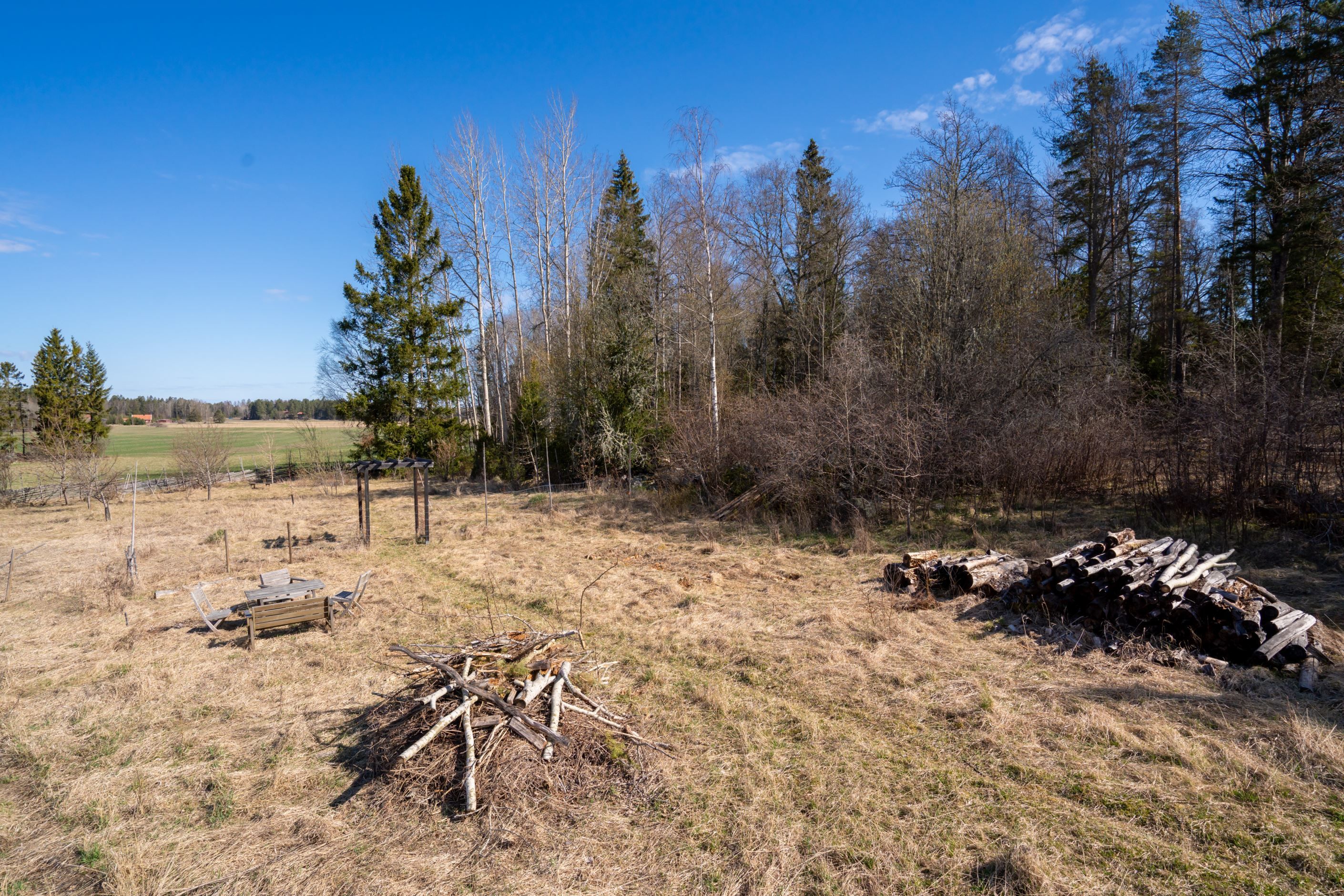 På tomten finns redan fruktträd och bärbuskar planterade, vilket ger en härlig grund för dig som vill odla och njuta av egen skörd.