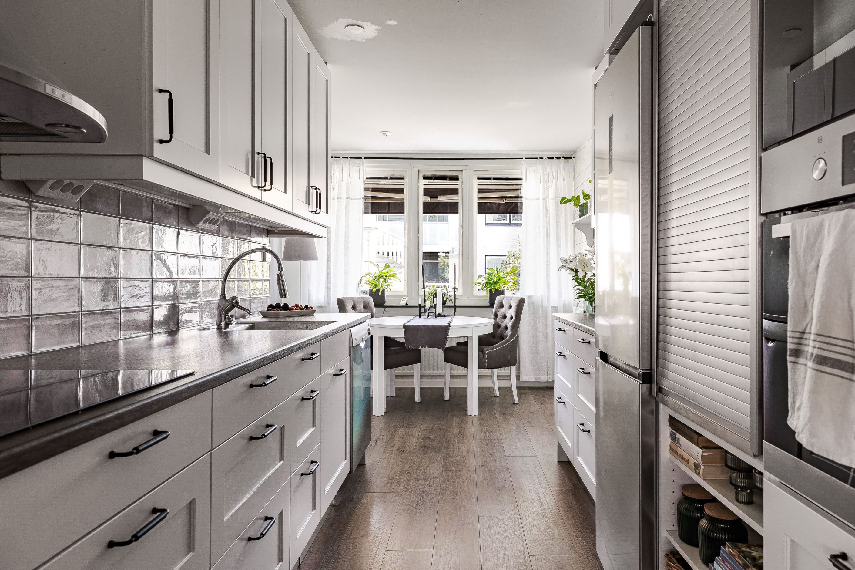 Bostaden erbjuder två rymliga sovrum, varav det ena har en praktisk walk-in-closet med gott om förvaringsmöjligheter. Det moderna köket är fullt utrustat med alla bekvämligheter man kan önska – bland annat diskmaskin, ugn, spishäll, fläkt och kyl/frys. I köket finns det dessutom plats för en matgrupp.