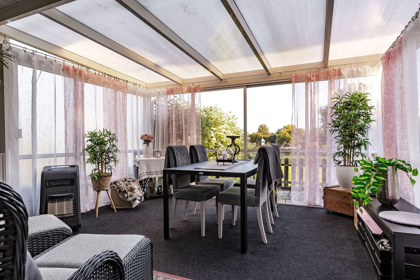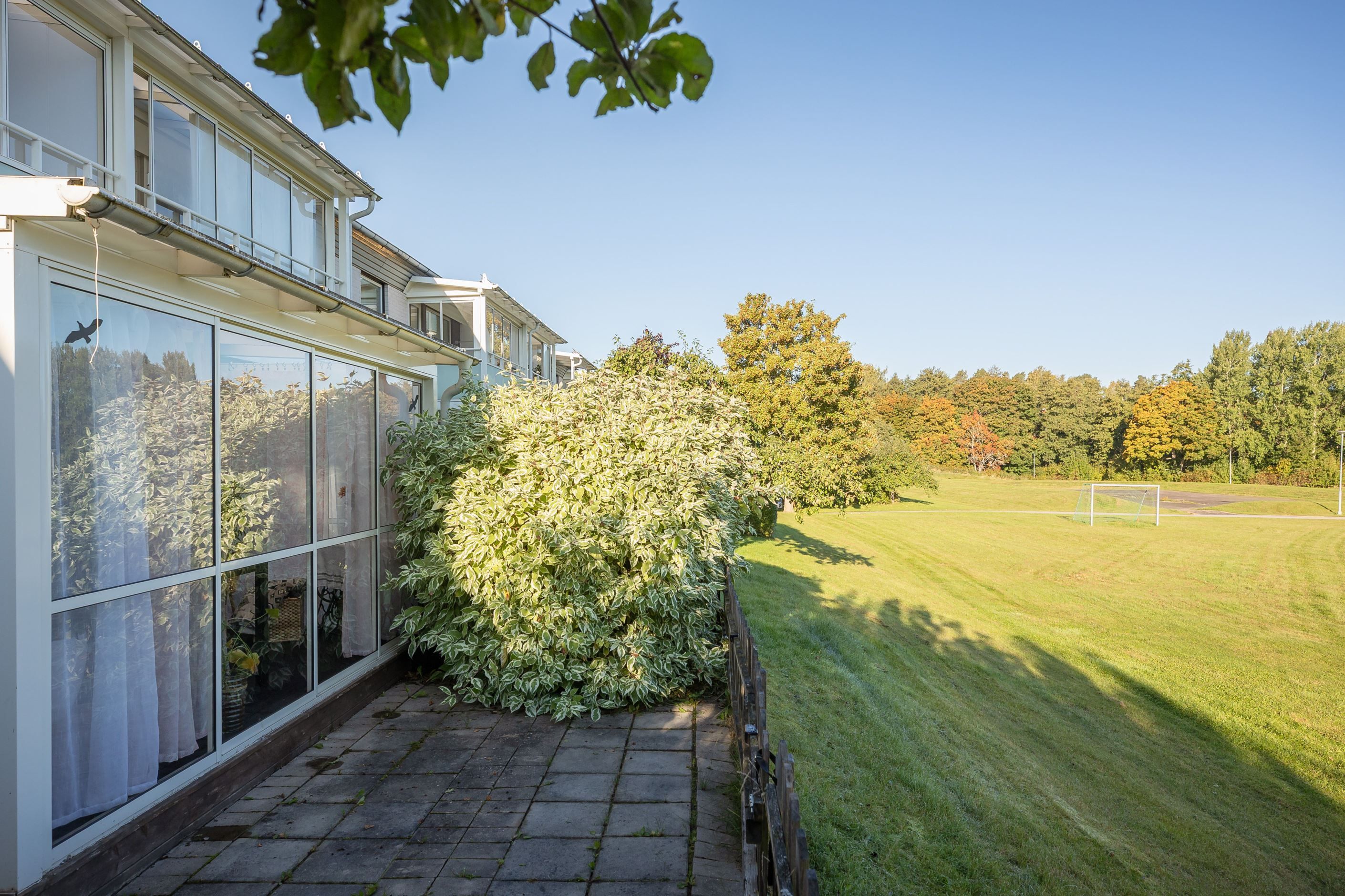 Från vardagsrummet nås det inglasade uterummet som förlänger säsongen och ger en trivsam plats att njuta av under större delen av året. Härifrån har du direkt tillgång till den gröna ytan på baksidan, vilket ger en härlig känsla. På framsidan finns dessutom ett generöst altandäck med plats för utemöbler och plantering – en idealisk plats för morgonkaffet eller sommarens grillkvällar.