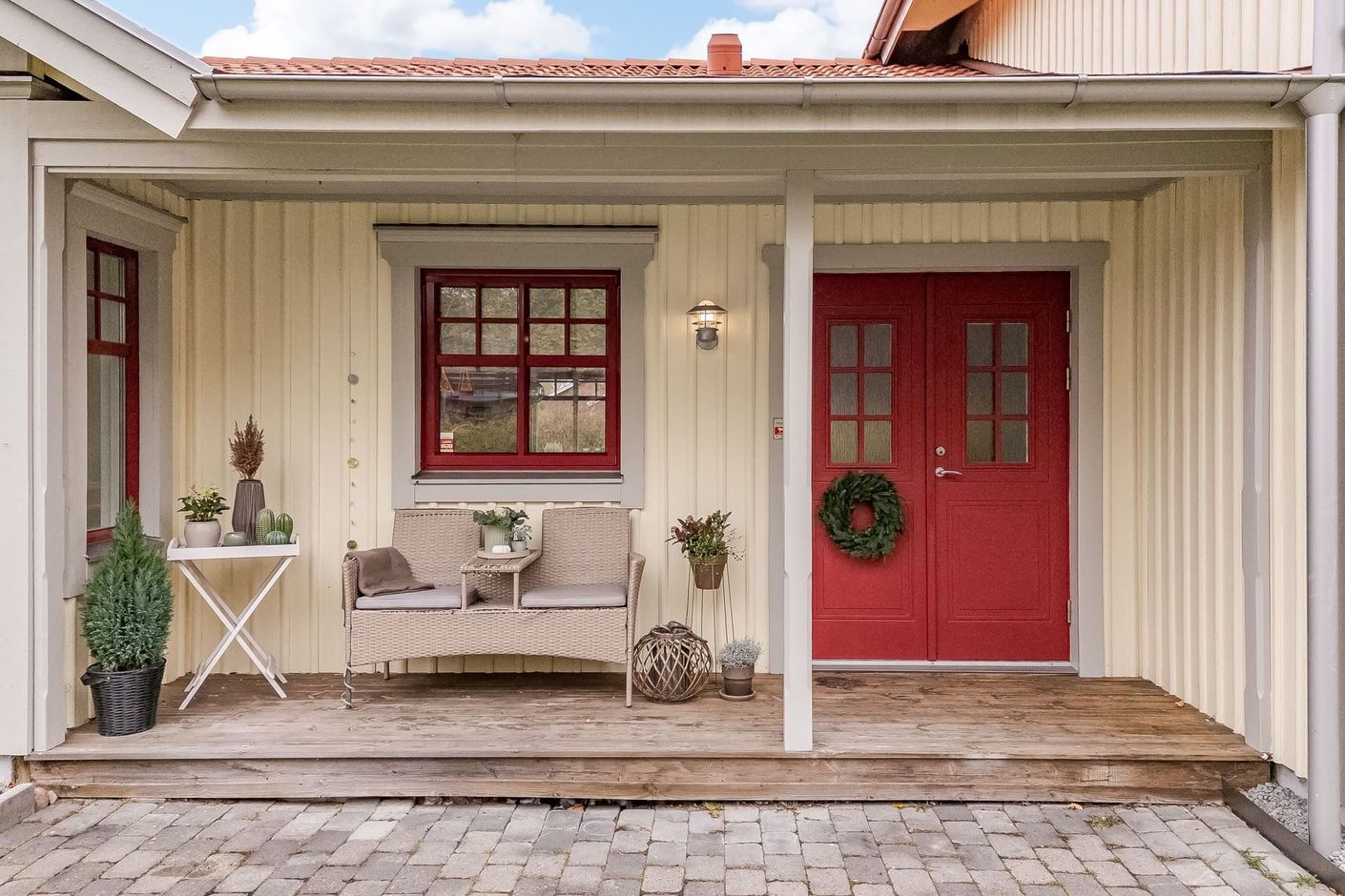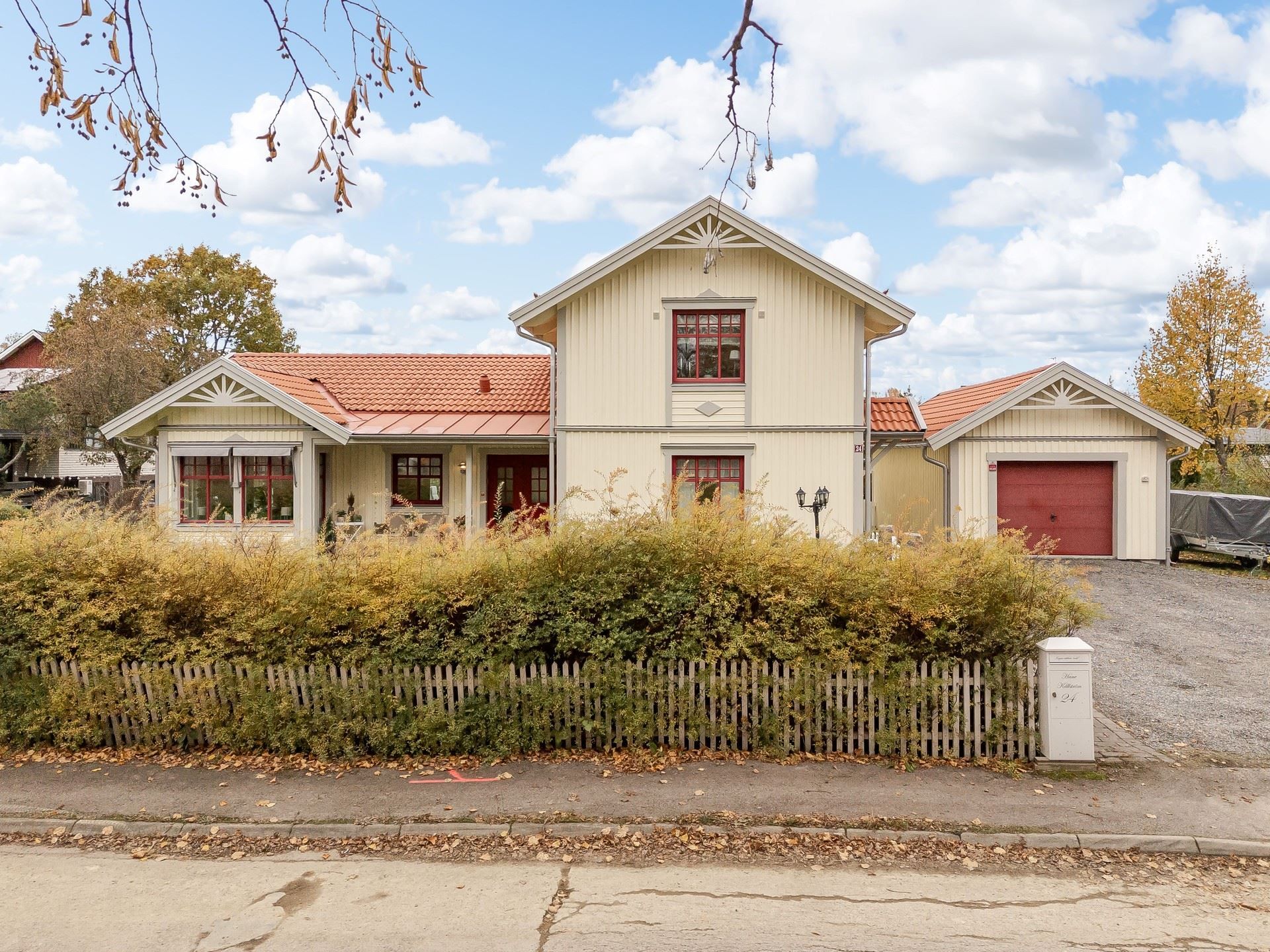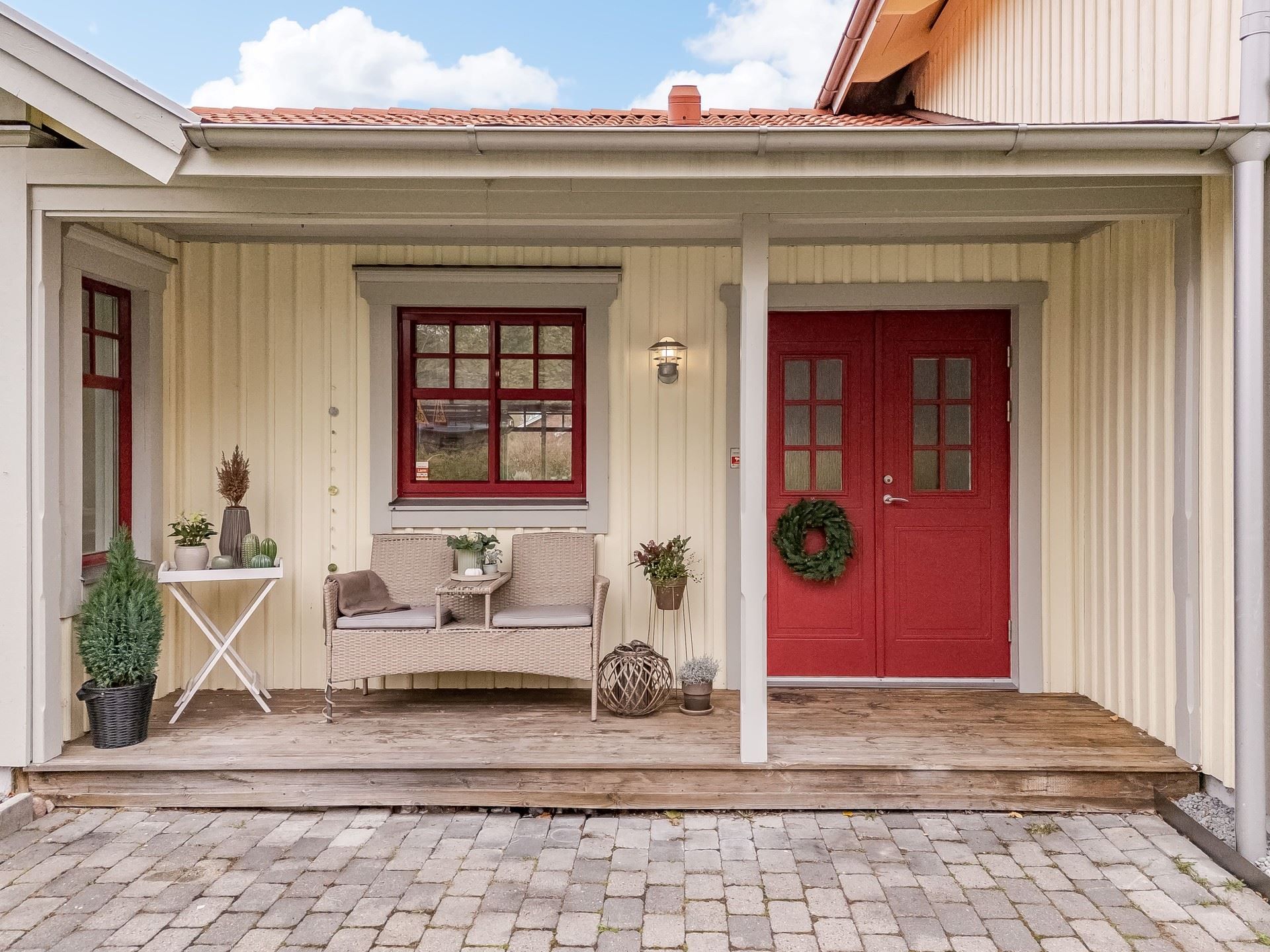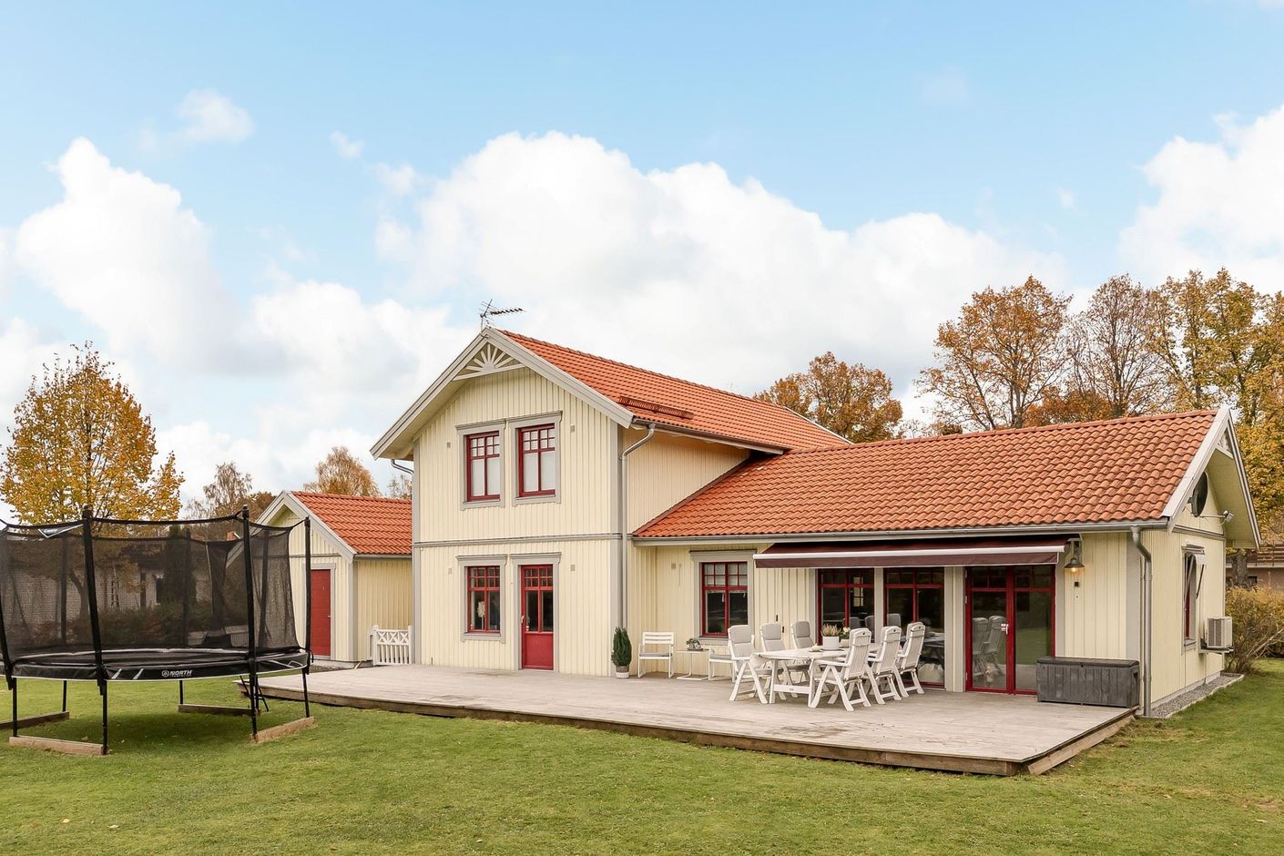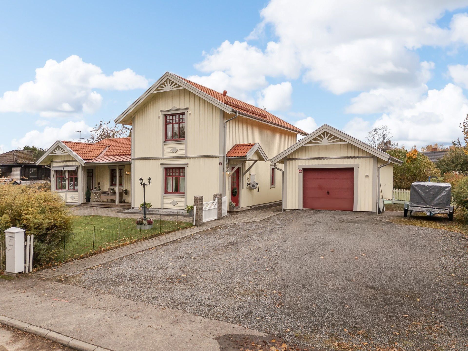 Tomten är lättskött med gräsmatta och uteplatser både på fram och baksida – perfekt för sommarens grillkvällar eller barnens lek. Garage och förråd.