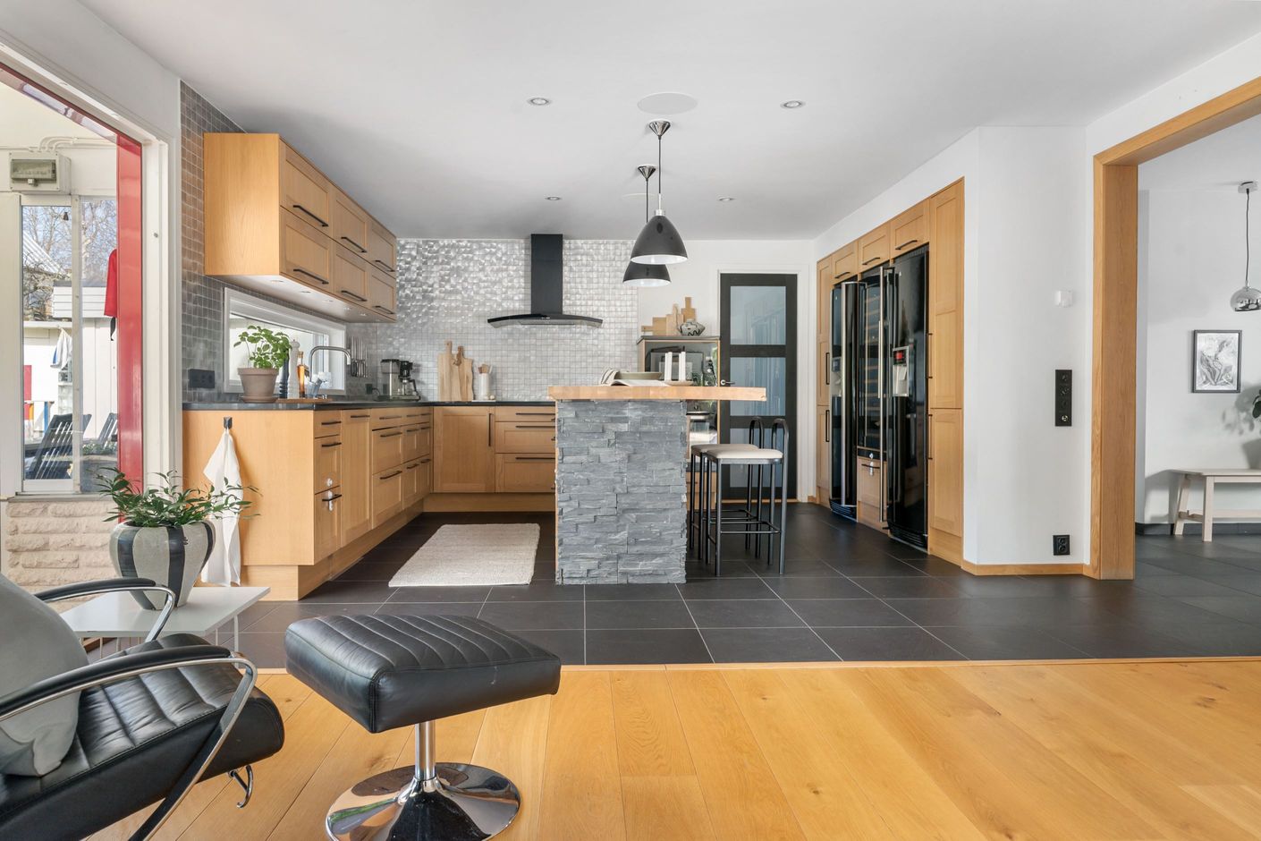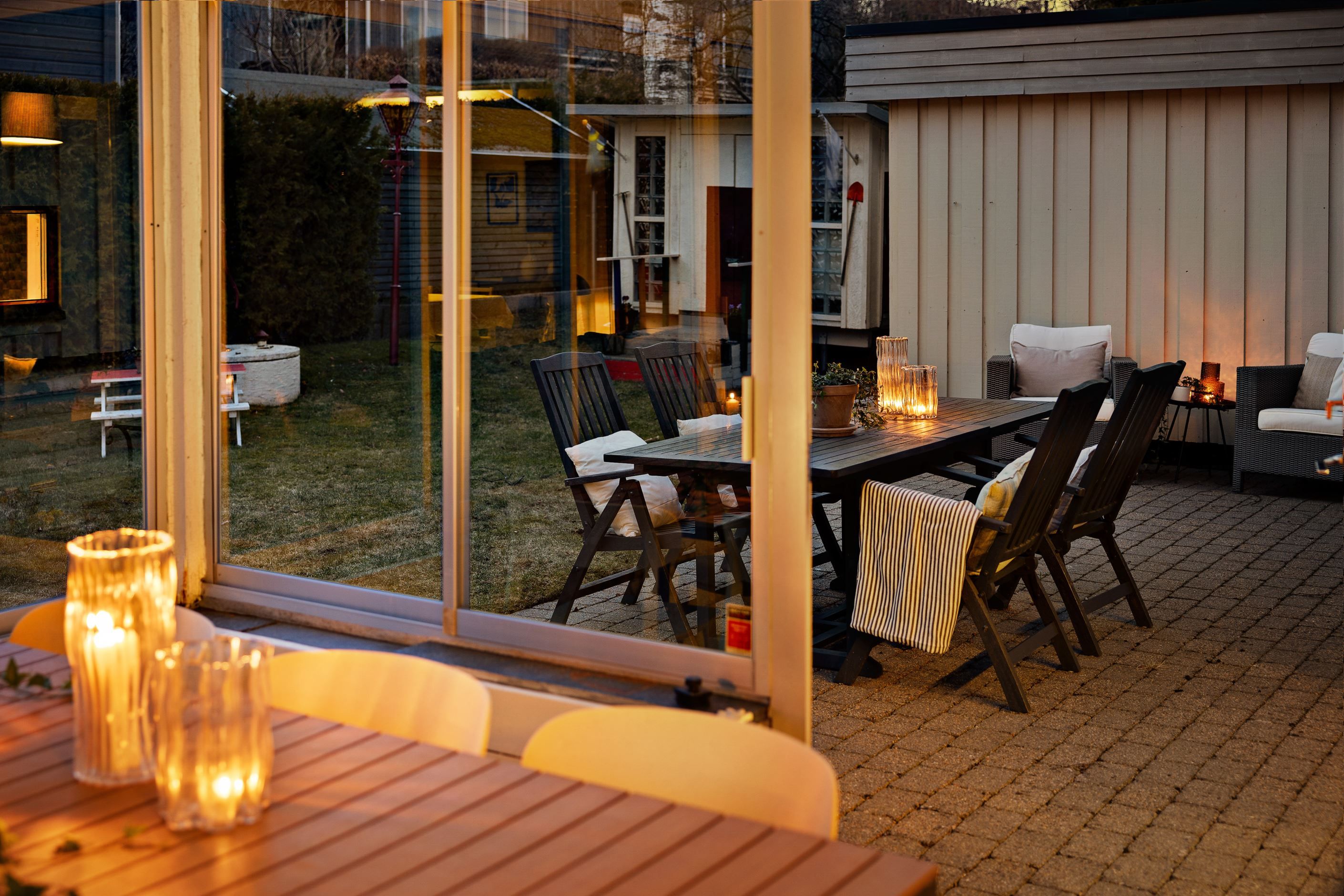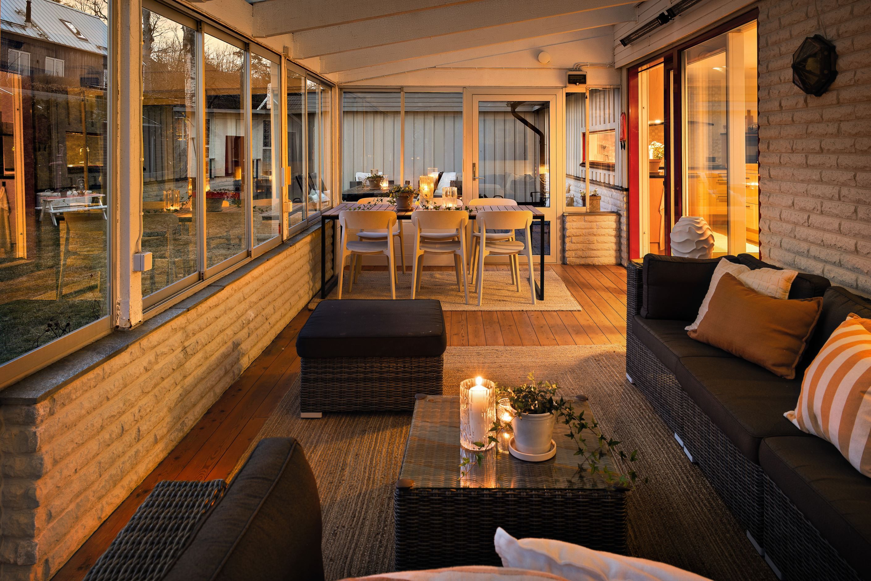 Köket och vardagsrummet samspelar på ett naturligt sätt och skapar fina sociala ytor för såväl familjeliv som umgänge med släkt och vänner. Från köket nås det stora uterummet som förlänger utesäsongen och skapar en extra yta att njuta av från tidig vår till sen höst. På husets baksida skapas dessutom ett speciellt och mycket behagligt mikroklimat. Den är vindskyddad och omgiven av cirka tre meter höga buskar, vilket ger en privat känsla med mycket begränsad insyn. Under soliga dagar upplevs ofta en tydlig temperaturskillnad mellan fram- och baksidan, vilket ger baksidan en nästan utländsk känsla.