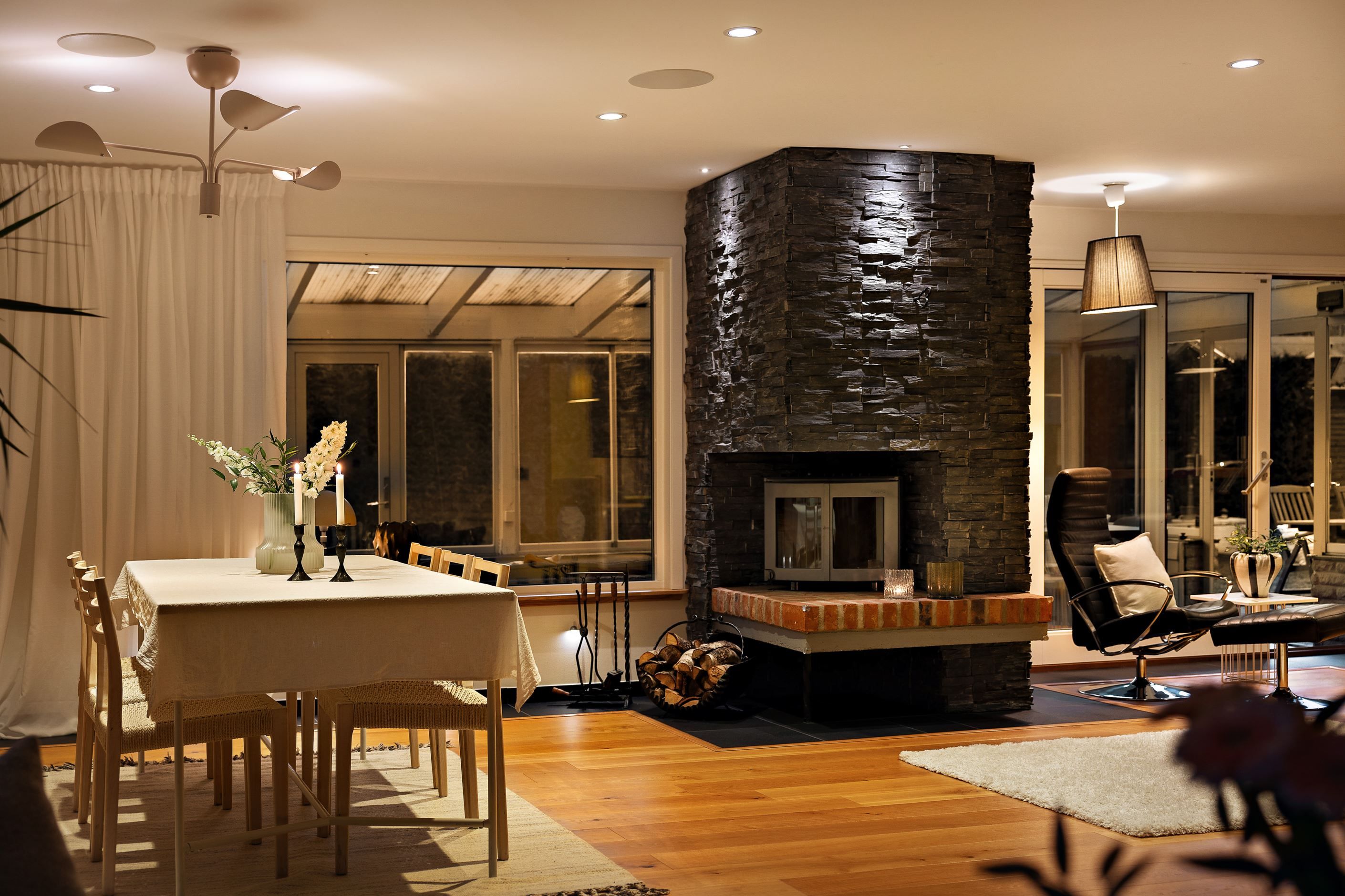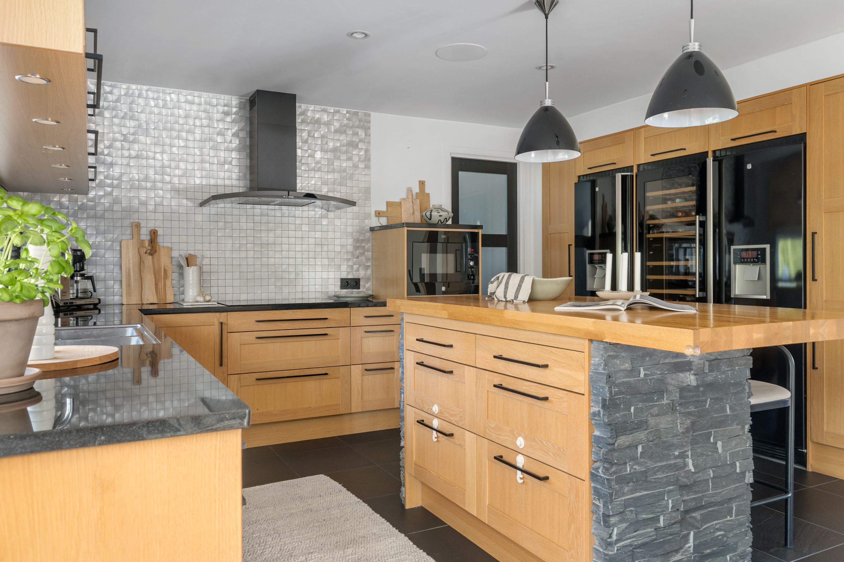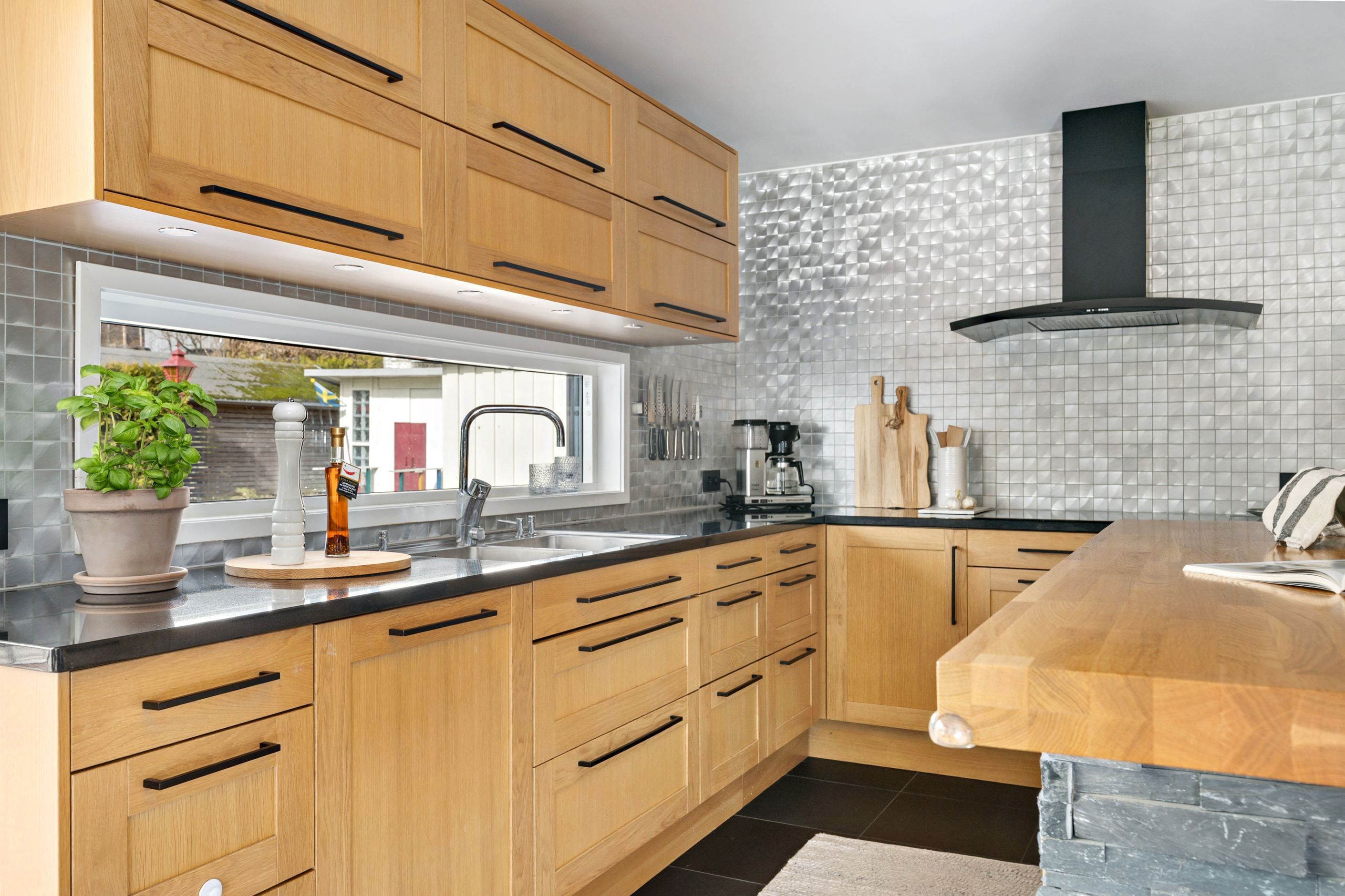 Köket och vardagsrummet samspelar på ett naturligt sätt och skapar fina sociala ytor för såväl familjeliv som umgänge med släkt och vänner. Från köket nås det stora uterummet som förlänger utesäsongen och skapar en extra yta att njuta av från tidig vår till sen höst. På husets baksida skapas dessutom ett speciellt och mycket behagligt mikroklimat. Den är vindskyddad och omgiven av cirka tre meter höga buskar, vilket ger en privat känsla med mycket begränsad insyn. Under soliga dagar upplevs ofta en tydlig temperaturskillnad mellan fram- och baksidan, vilket ger baksidan en nästan utländsk känsla.