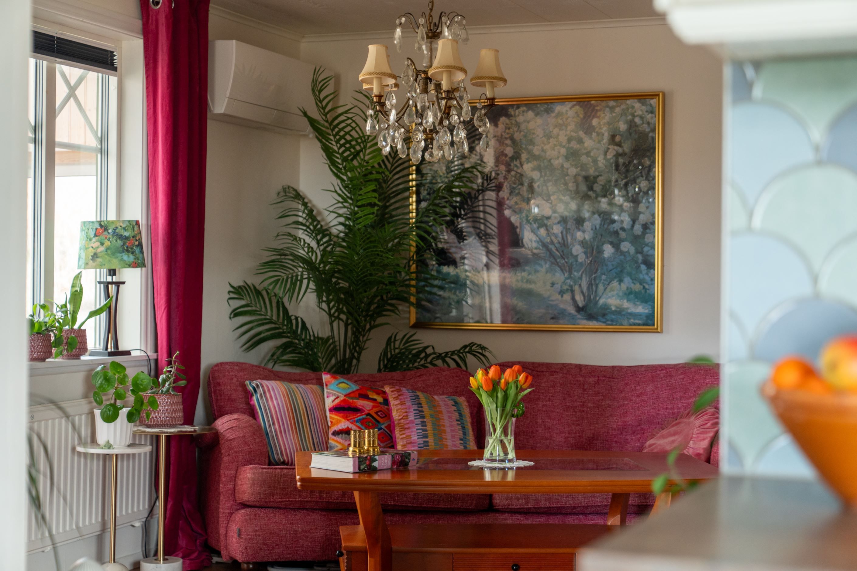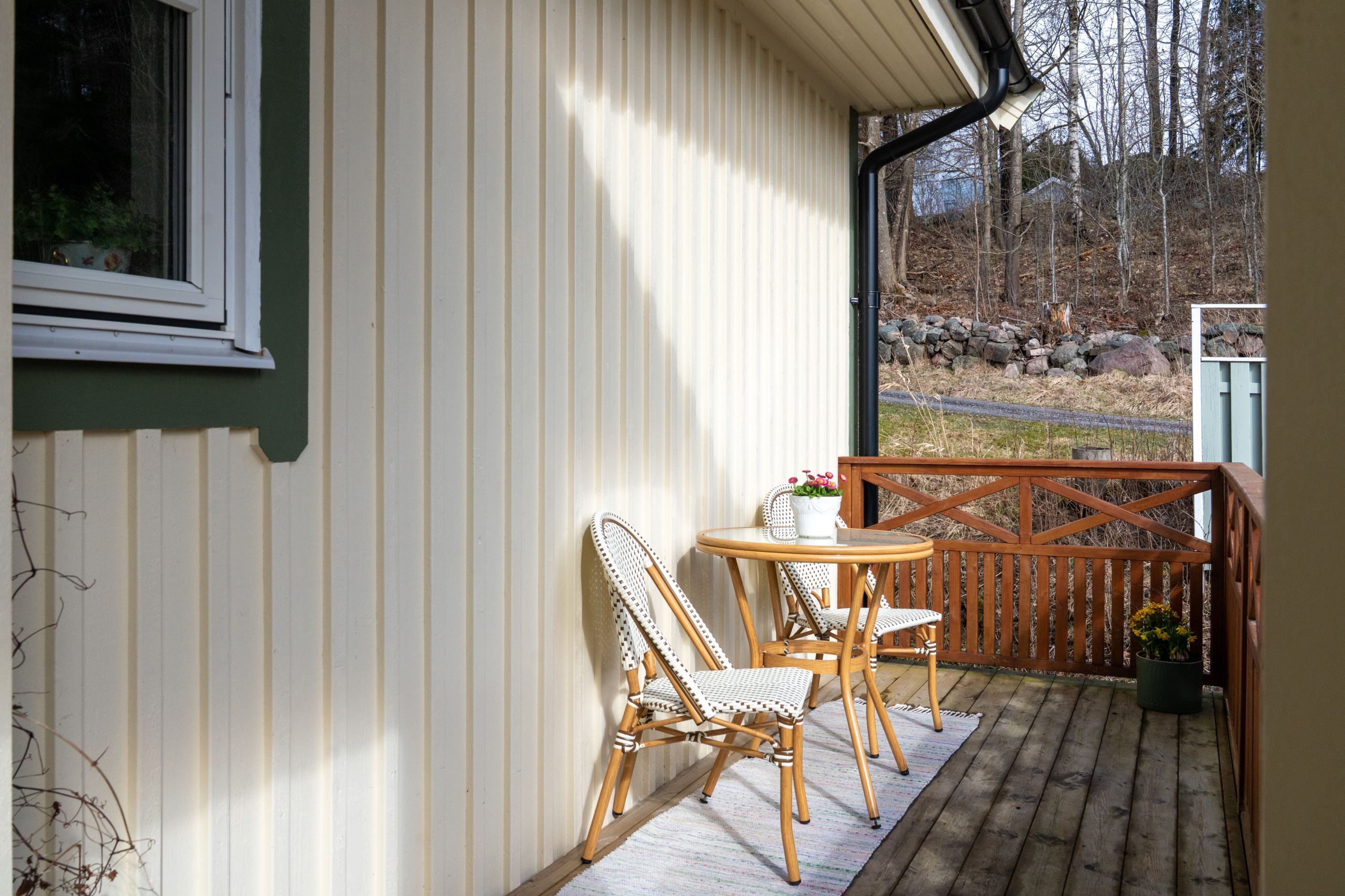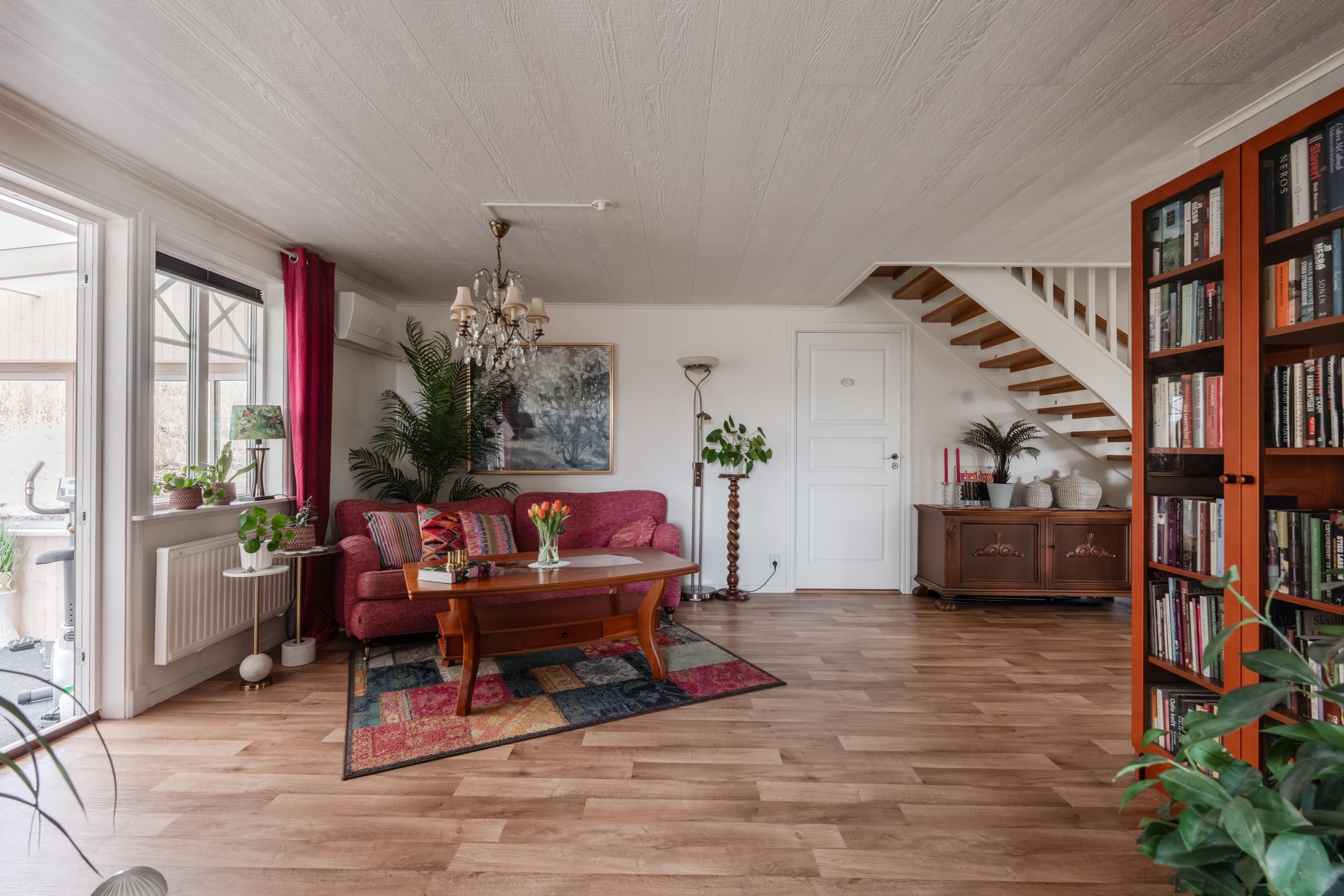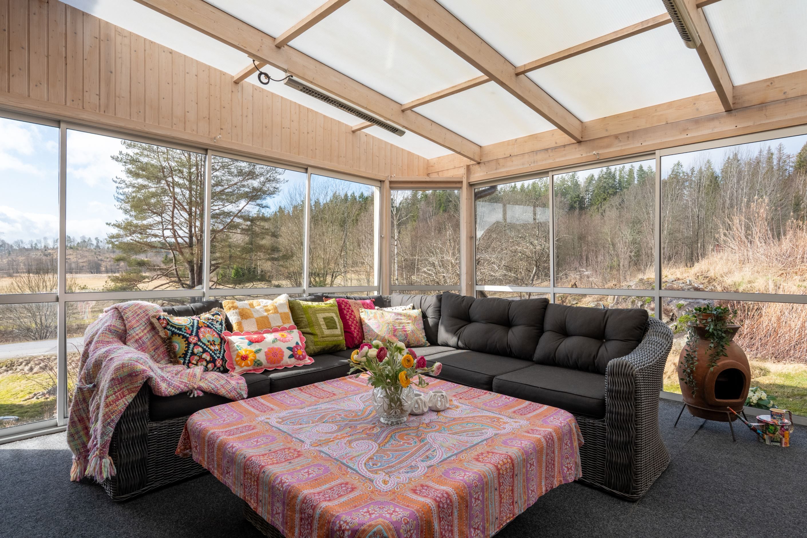 Vardagsrummet är rymligt med direkt utgång till den stora uterummet - perfekt för sociala tillställningar eller lugna kvällar hemma. Det inglasade uterummet blir snabbt en favoritplats i hemmet, en naturlig förlängning av bostaden som kan nyttjas året runt. Under sommarhalvåret öppnas glaspartierna upp, medan värmelampor gör det lika trivsamt under kyligare dagar.