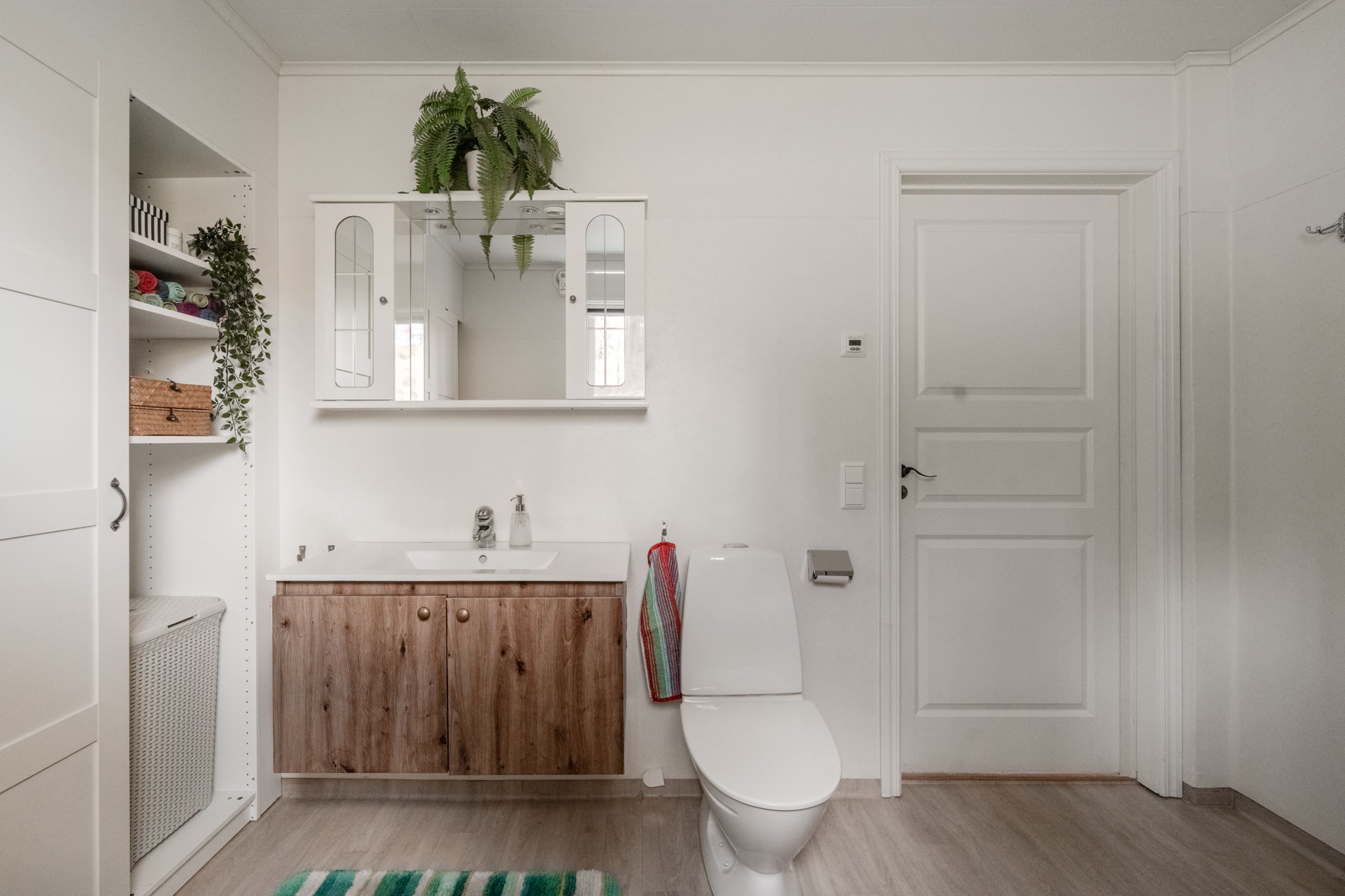 Badrummet på entréplan är fräscht och rymligt, utrustat med både tvättmaskin och smart förvaring.