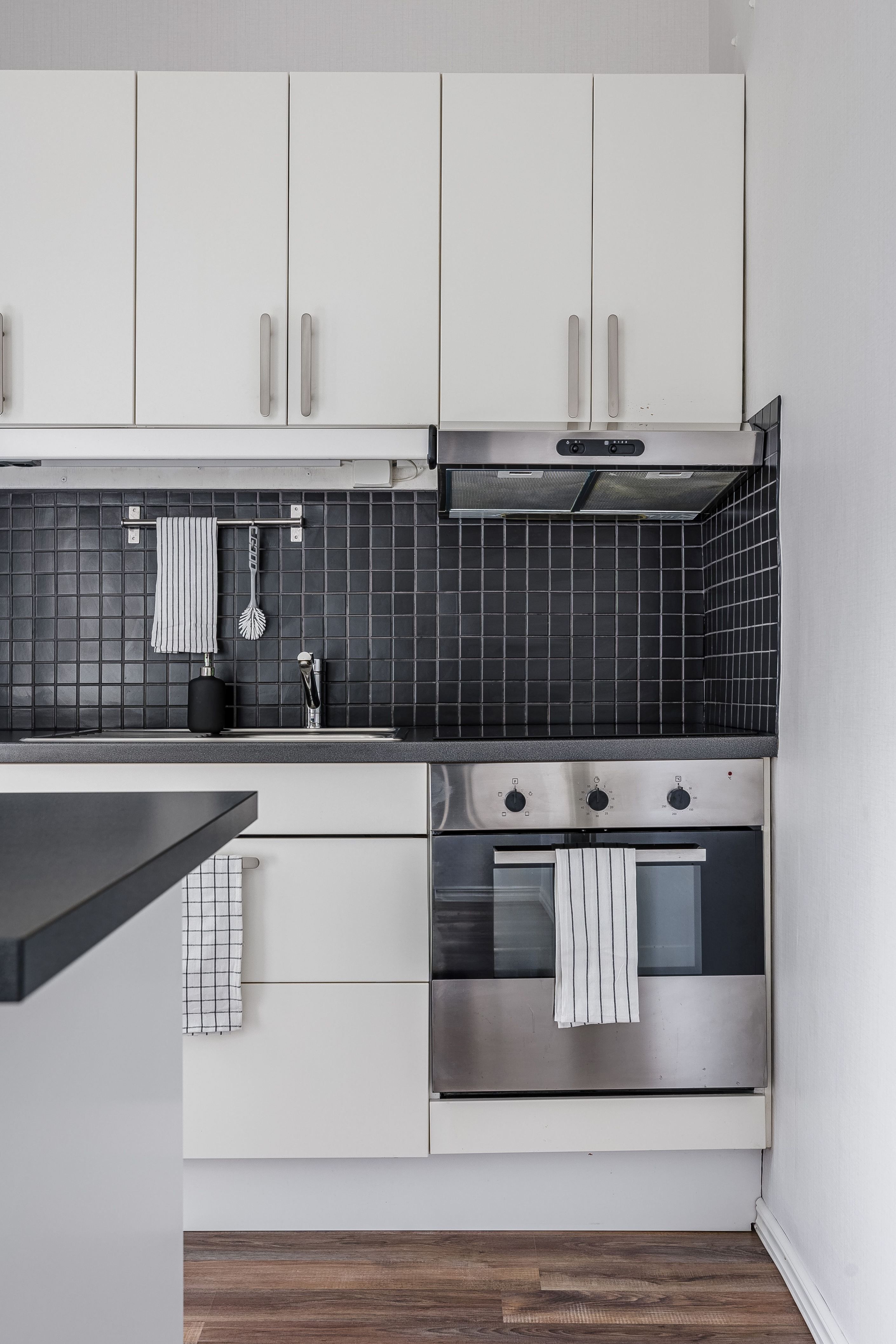 Kök i vitt, snyggt mörkt kakel och laminatbänkskiva i mörk granit. Köket är utrustat med ugn, spishäll, kyl samt fläkt. Gott om förvaring och plats.