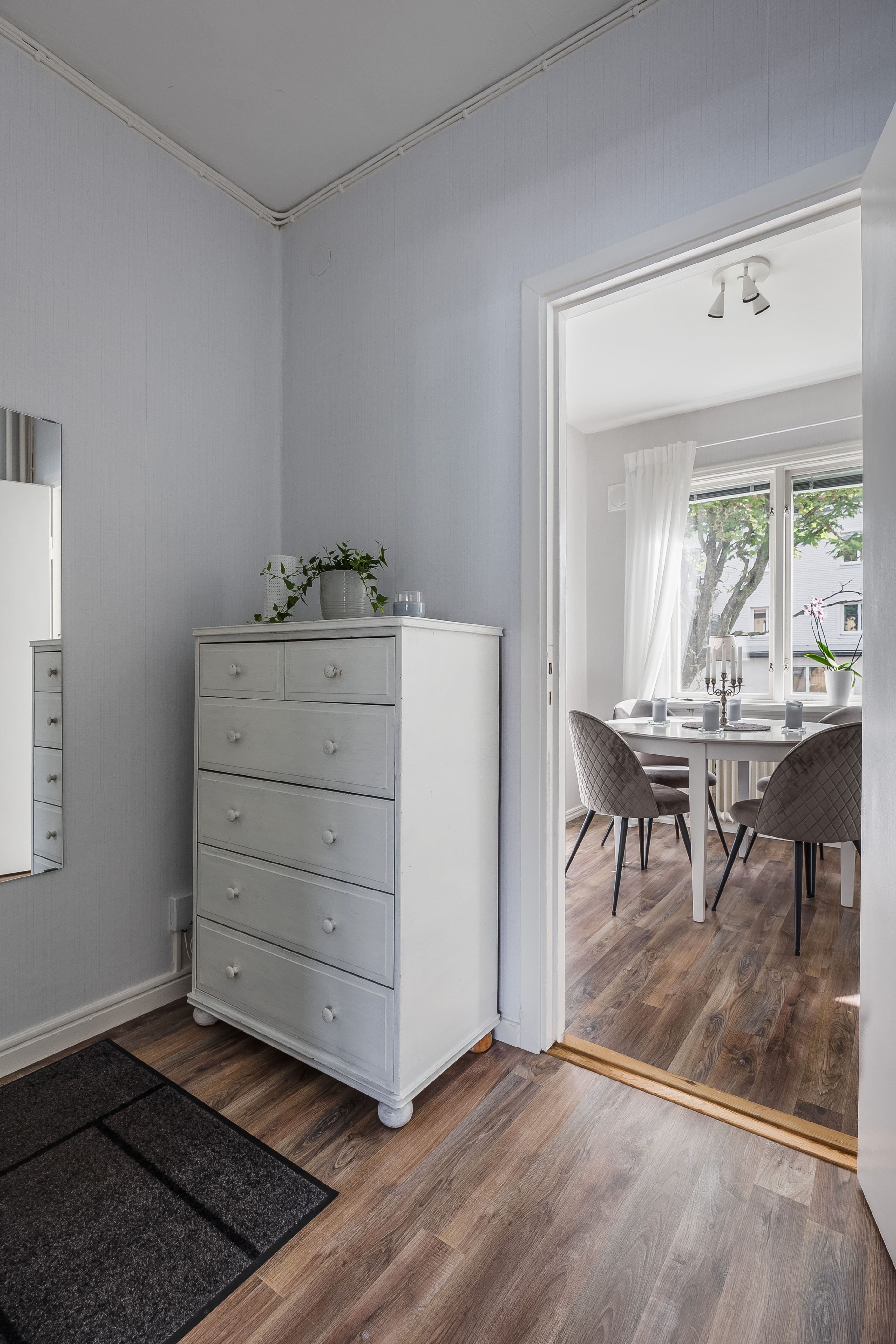 Vardagsrum som är lägenhetens största rum är stort nog för både soffa och matplats. Ljust och trevlig. Vetter mot de underbara "engelska radhusen". Klädkammare för bästa förvaring.