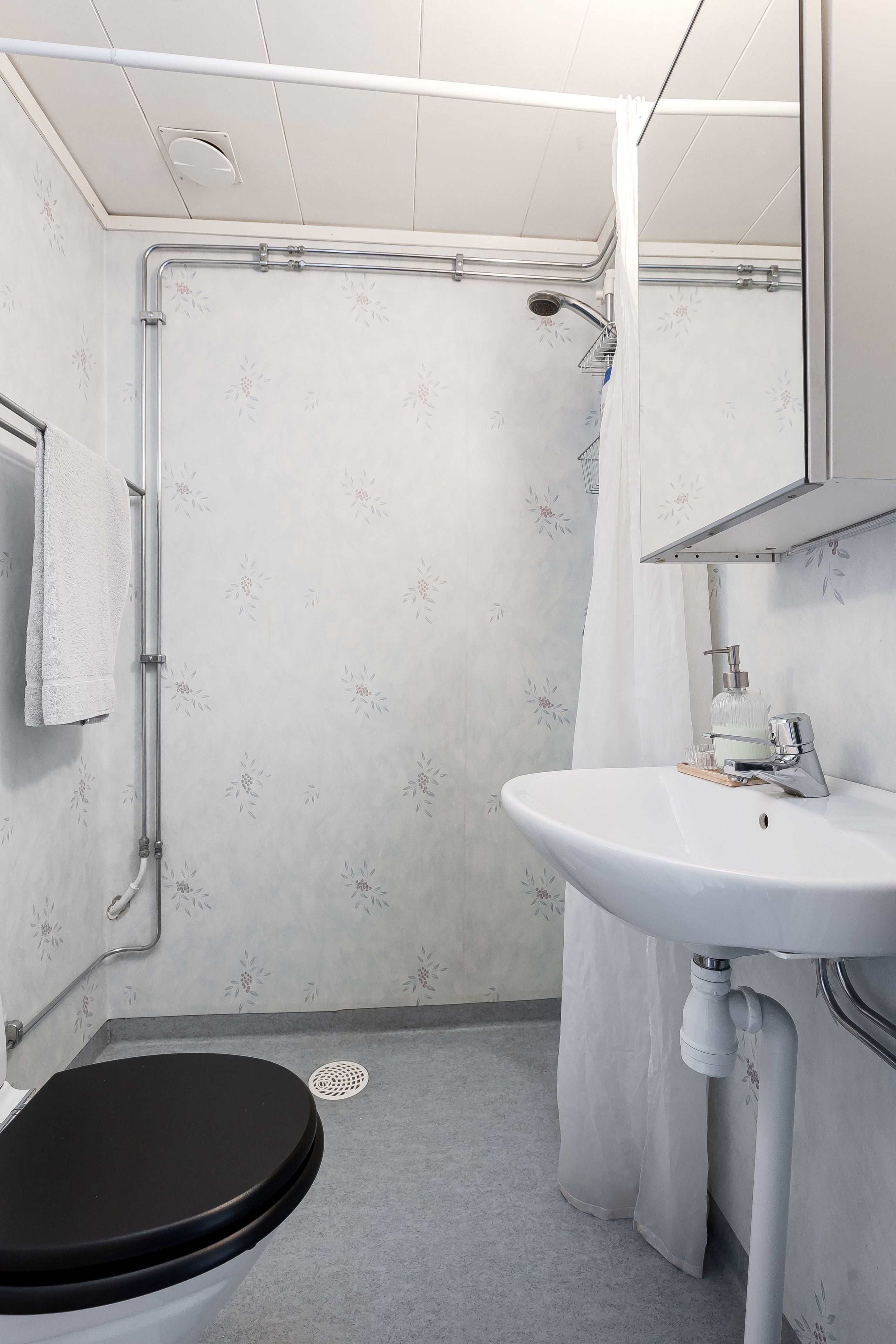 Badrum med våtrumsmatta. Bra storlek, ljust och fräscht.
