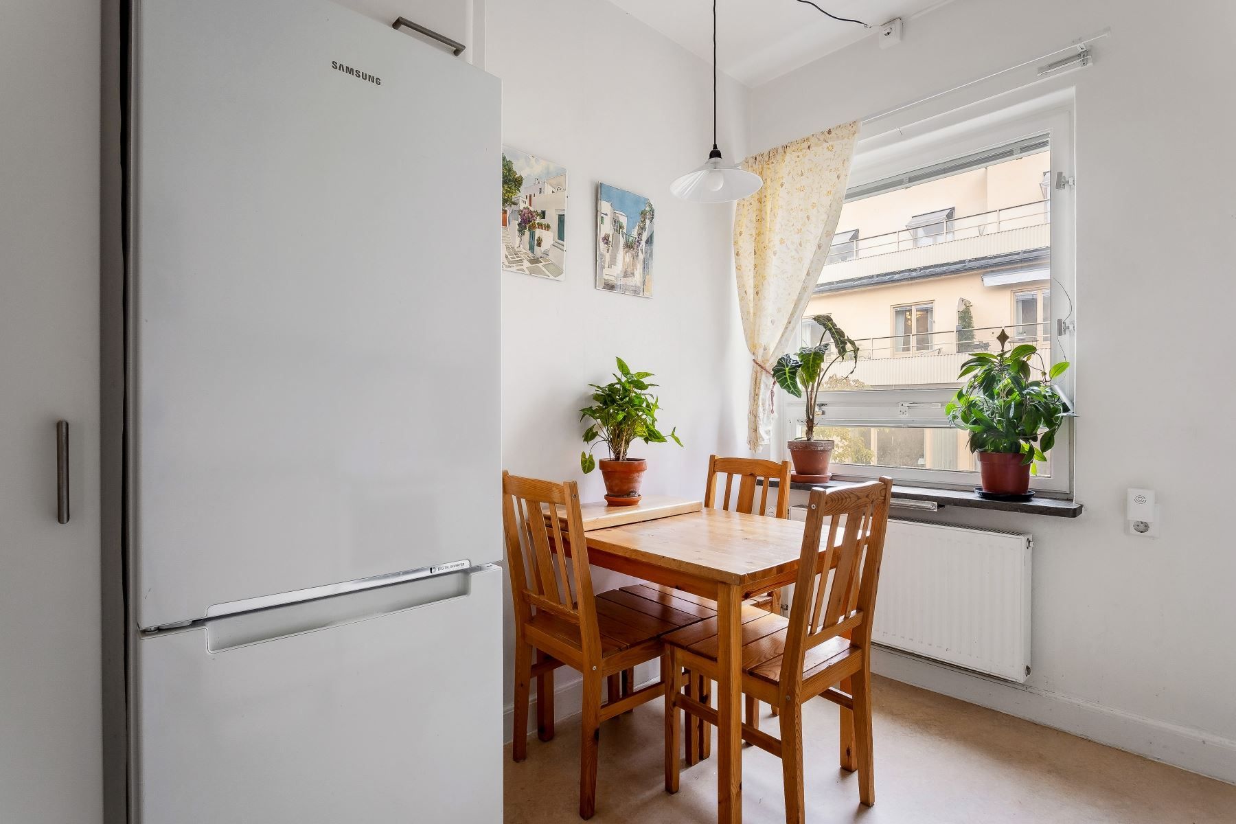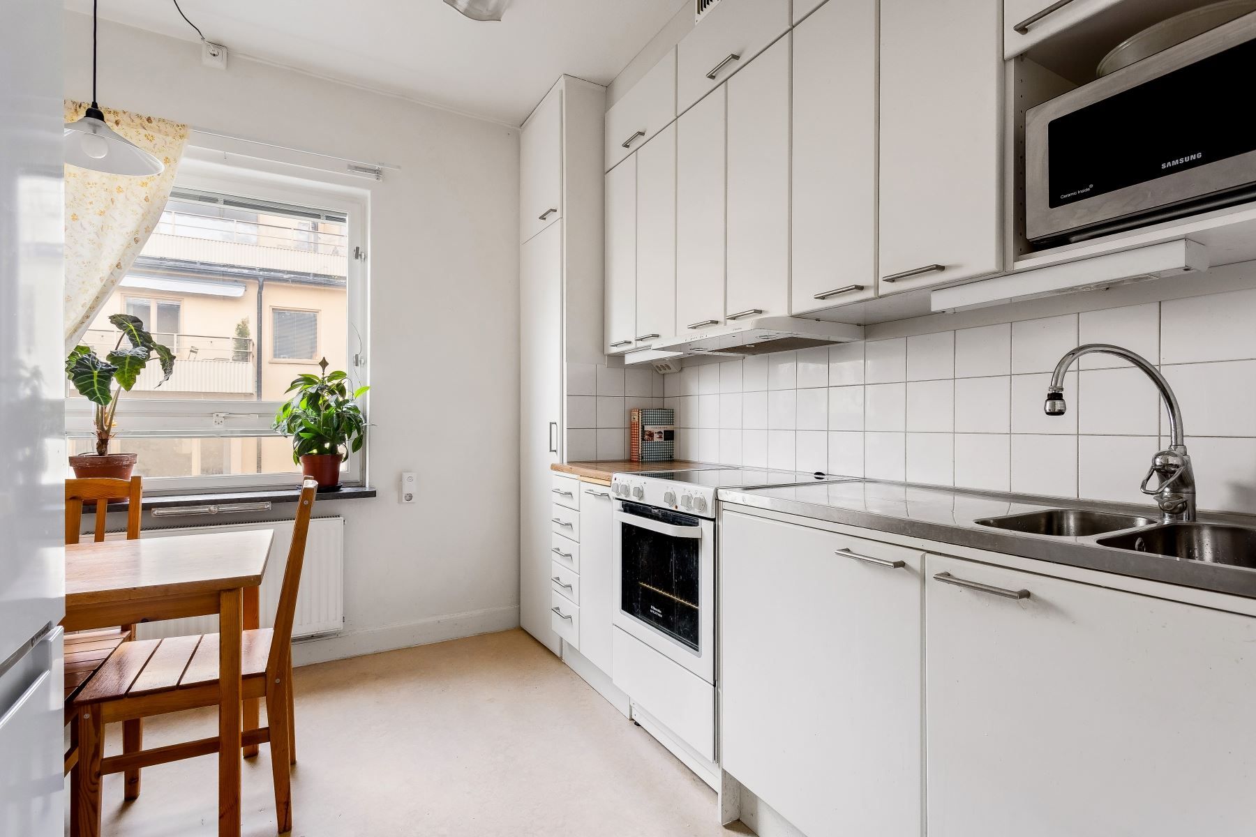 Tidstypiskt KÖK med vita snickerier och diskbänk i rostfritt stål samt arbetsbänk i massivt trä. Gott om förvaring i fullhöjd. Enhetligt stavlagt ekgolv. Fönster med vy mot grönska. Mellan kök och hall finns en bevarad serveringsgång med bra förvaring i djupa platsbyggda skåp.