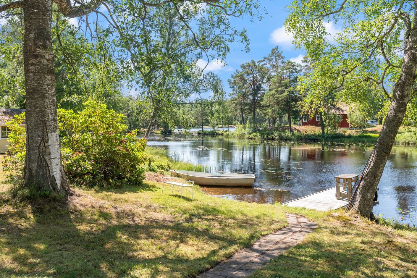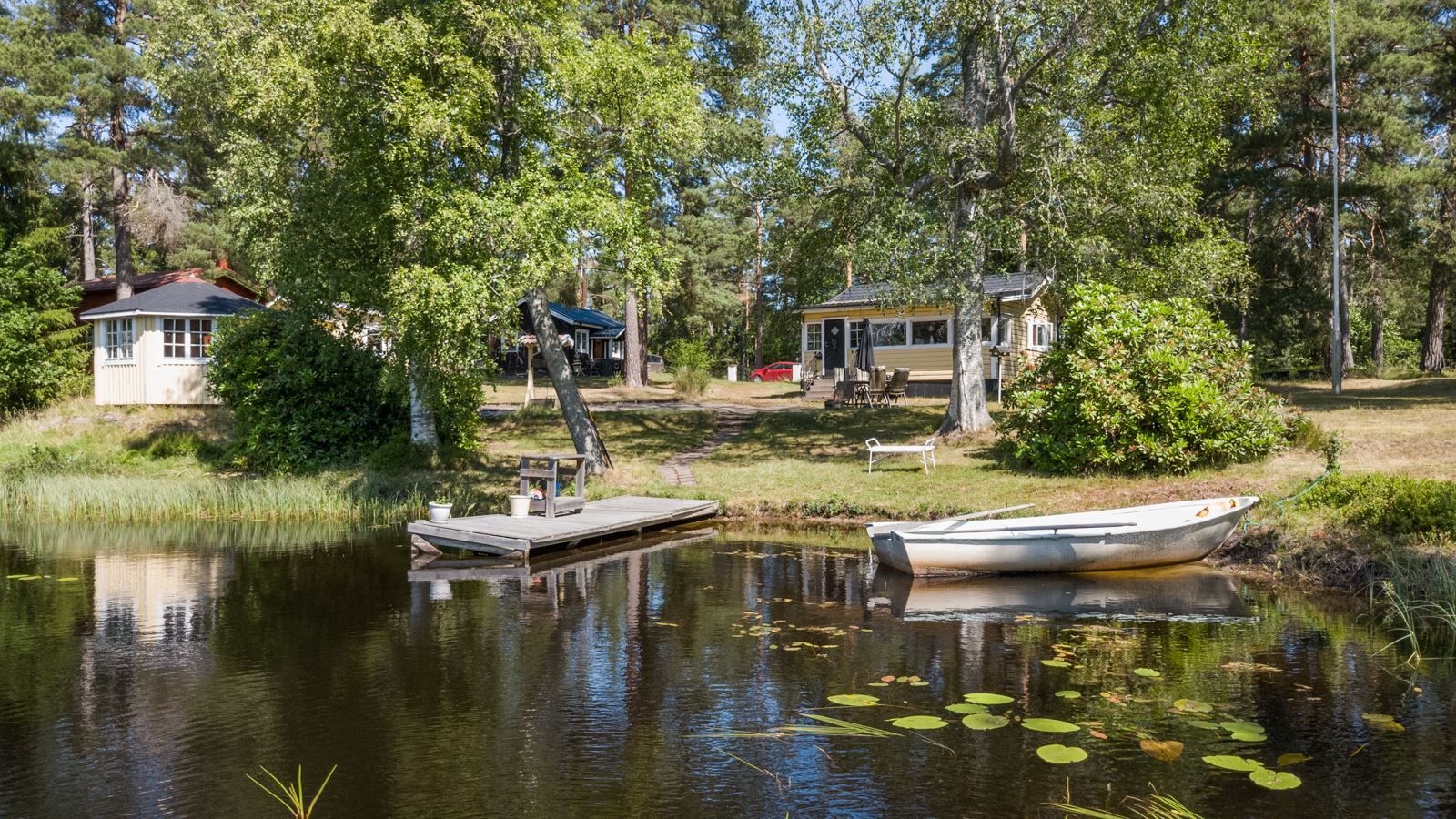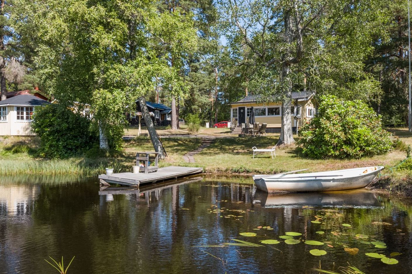 Standarden är äldre men hjärtligt trivsam – en plats där minnen skapas snarare än stilmarkörer visas upp. Tomten är solig hela dagen och insynen minimal. Det är sällsynt att något så genuint och naturnära blir tillgängligt.