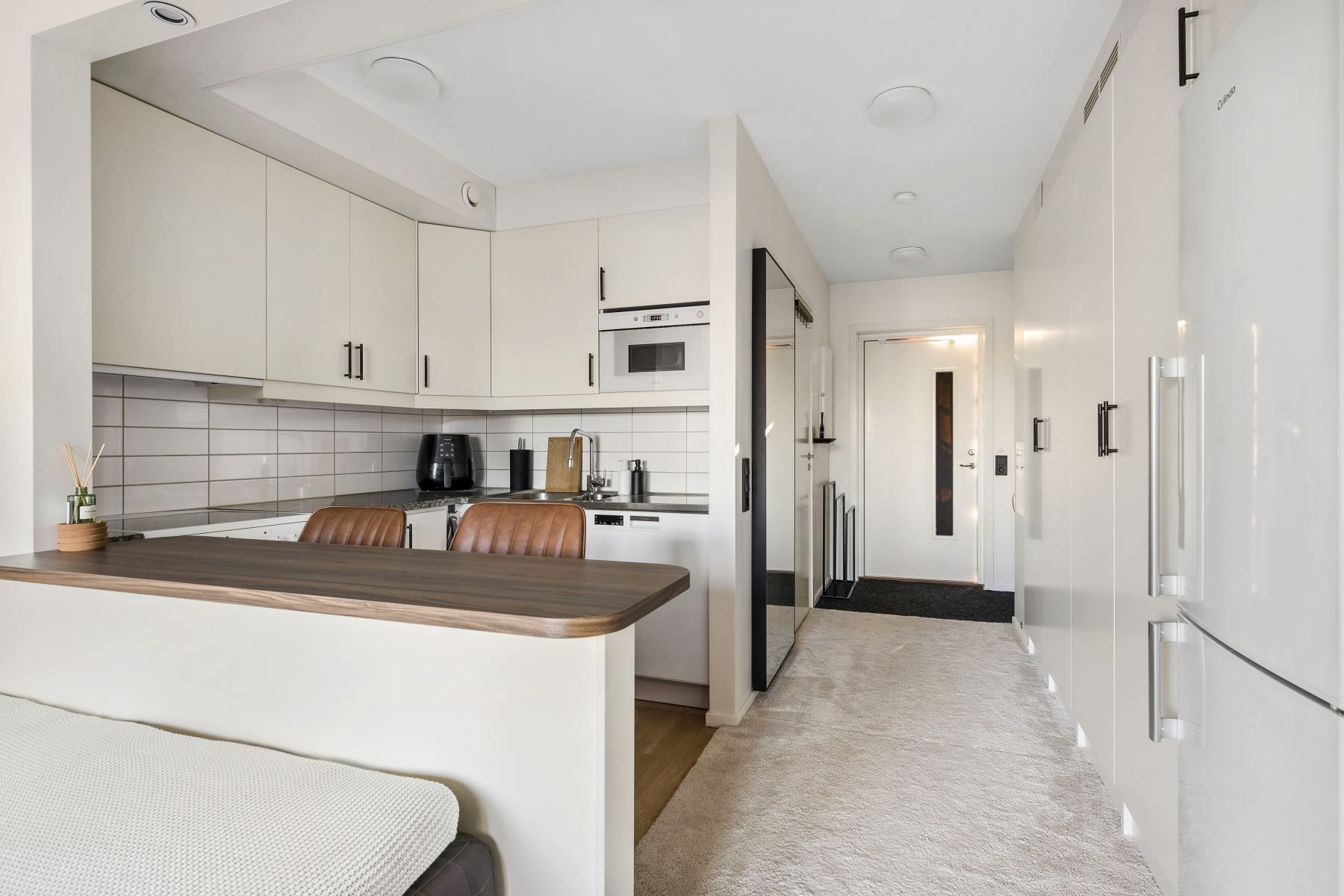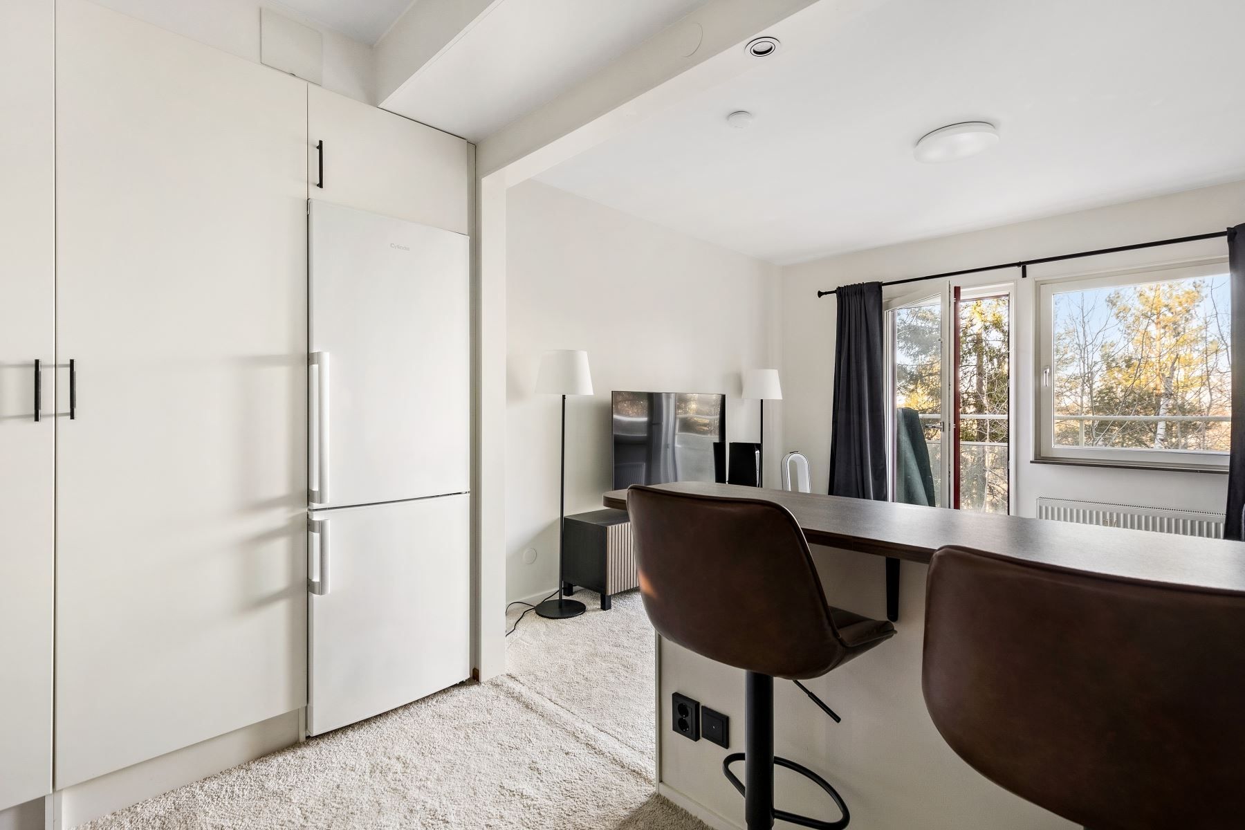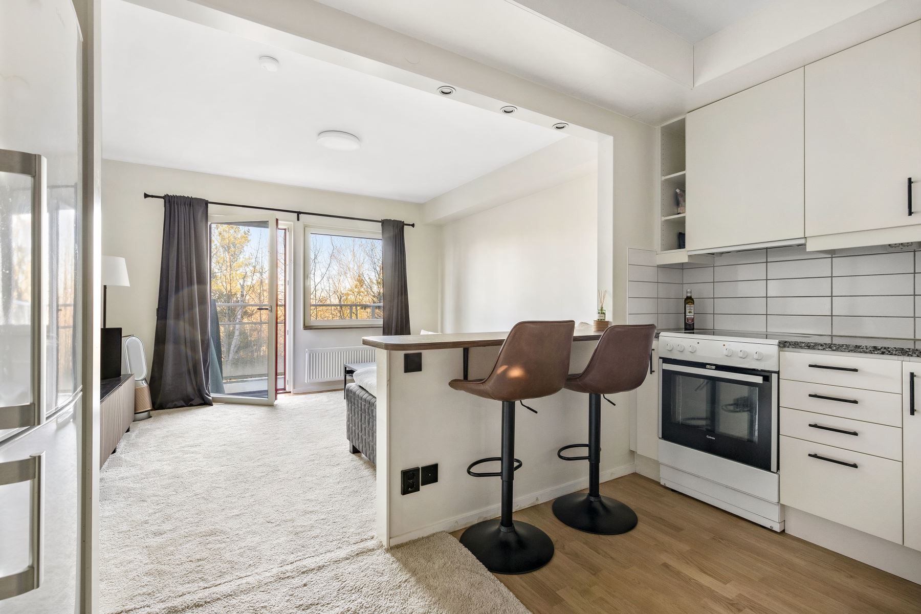 Det rymliga allrummet har en flexibel planlösning som ger utrymme för både säng, soffa, tv-hörna och matplats. Härifrån når du den generösa balkongen om cirka fyra kvadratmeter – en perfekt plats för avkoppling och sociala stunder med sol. Köket är modernt och stilrent med vita skåpluckor, en ny valnötsmönstrad bänkskiva och moderna vitvaror, där en ny köksblandare adderar en extra touch av komfort.