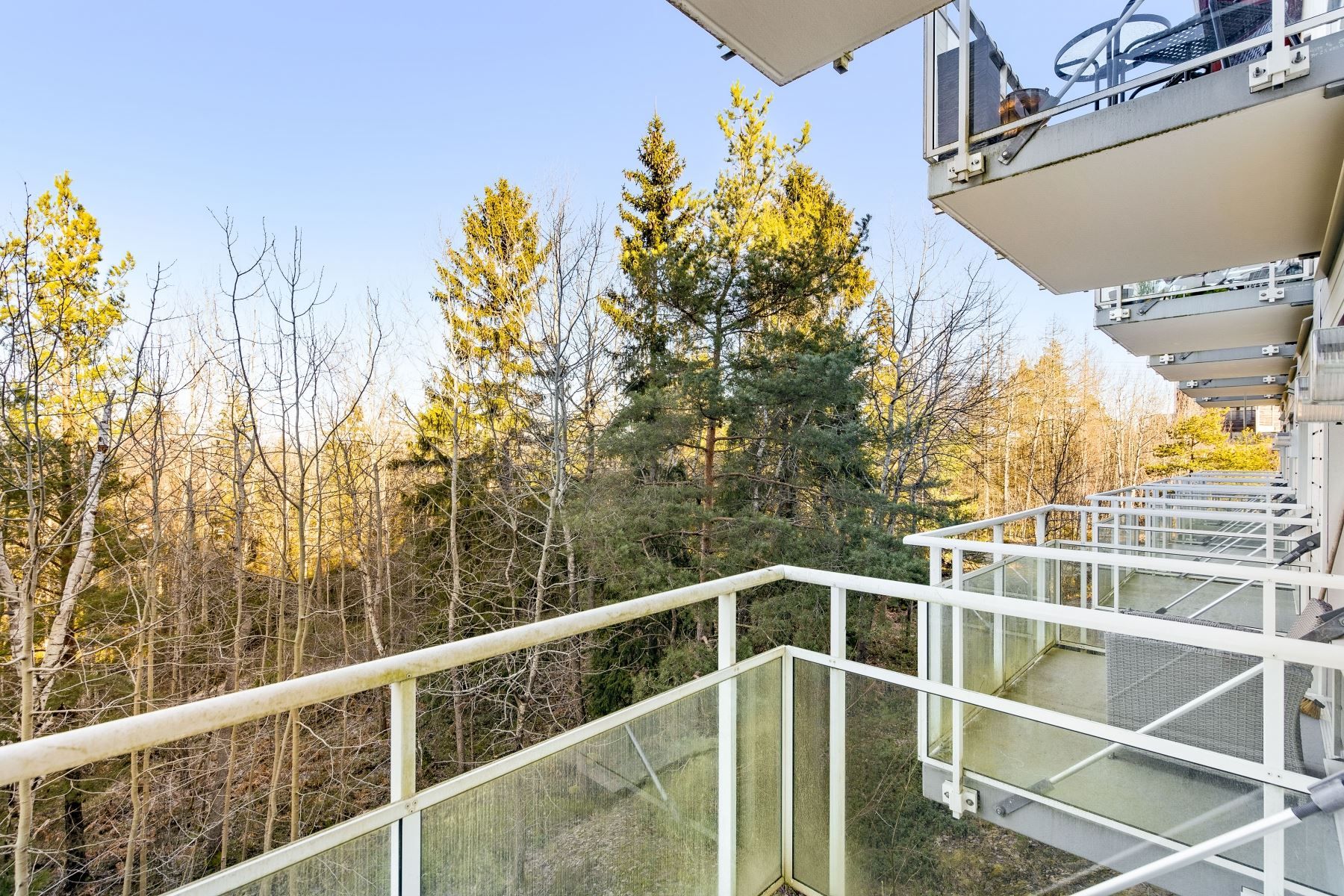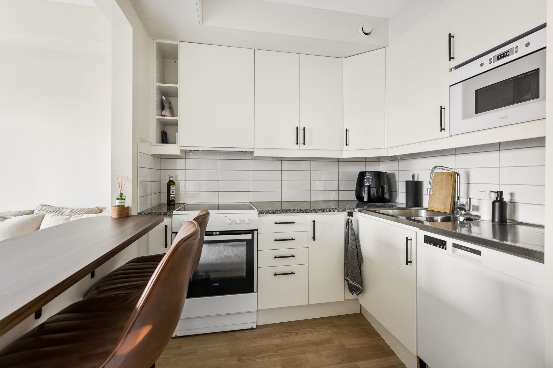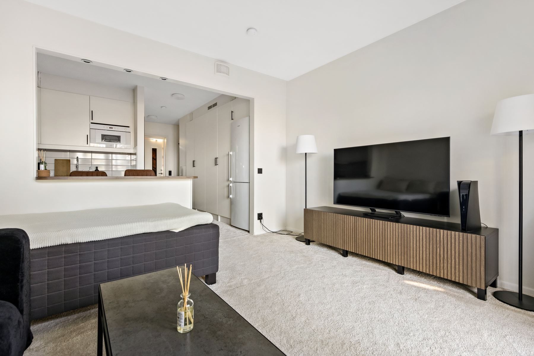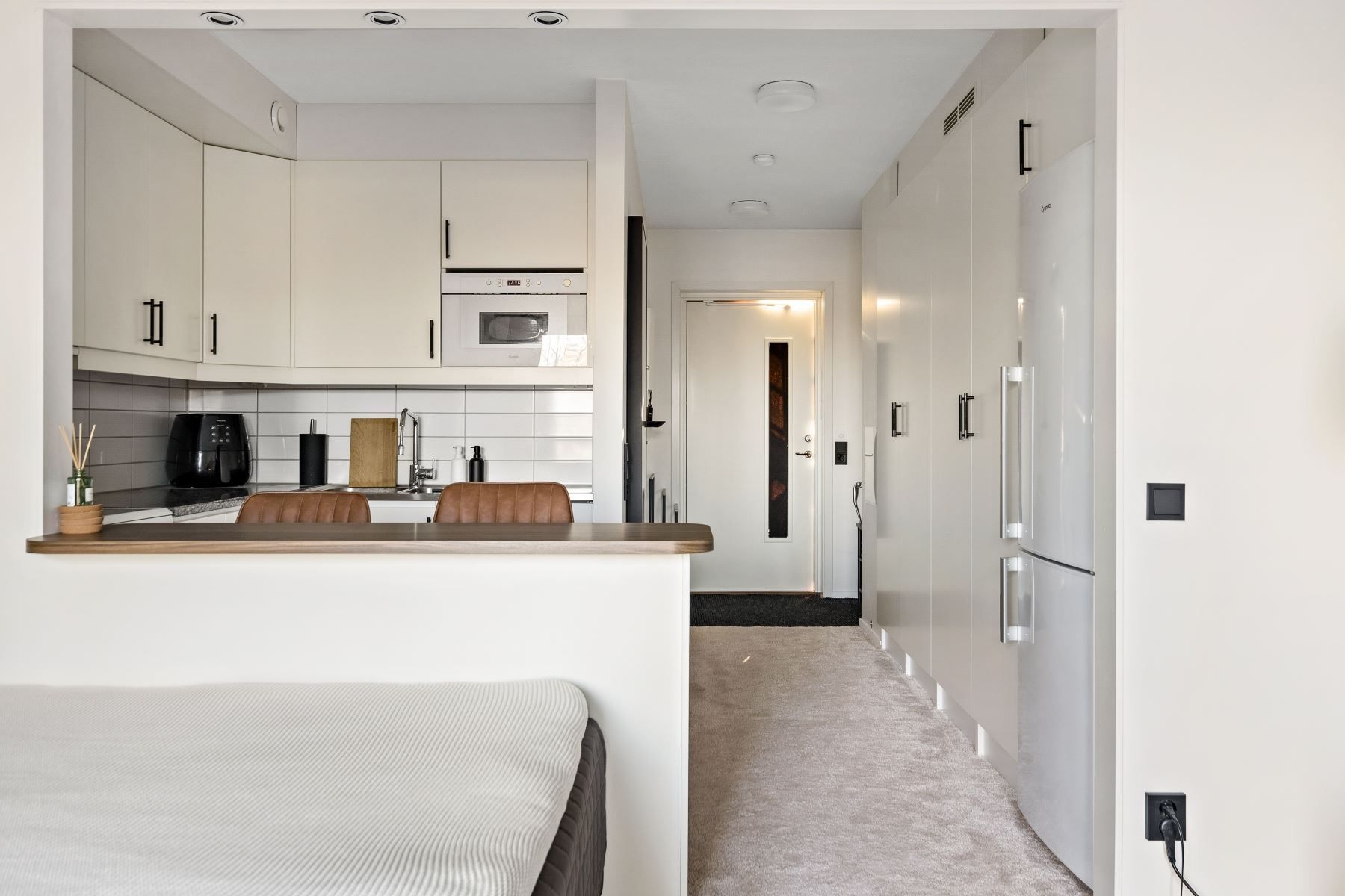 Det rymliga allrummet har en flexibel planlösning som ger utrymme för både säng, soffa, tv-hörna och matplats. Härifrån når du den generösa balkongen om cirka fyra kvadratmeter – en perfekt plats för avkoppling och sociala stunder med sol. Köket är modernt och stilrent med vita skåpluckor, en ny valnötsmönstrad bänkskiva och moderna vitvaror, där en ny köksblandare adderar en extra touch av komfort.