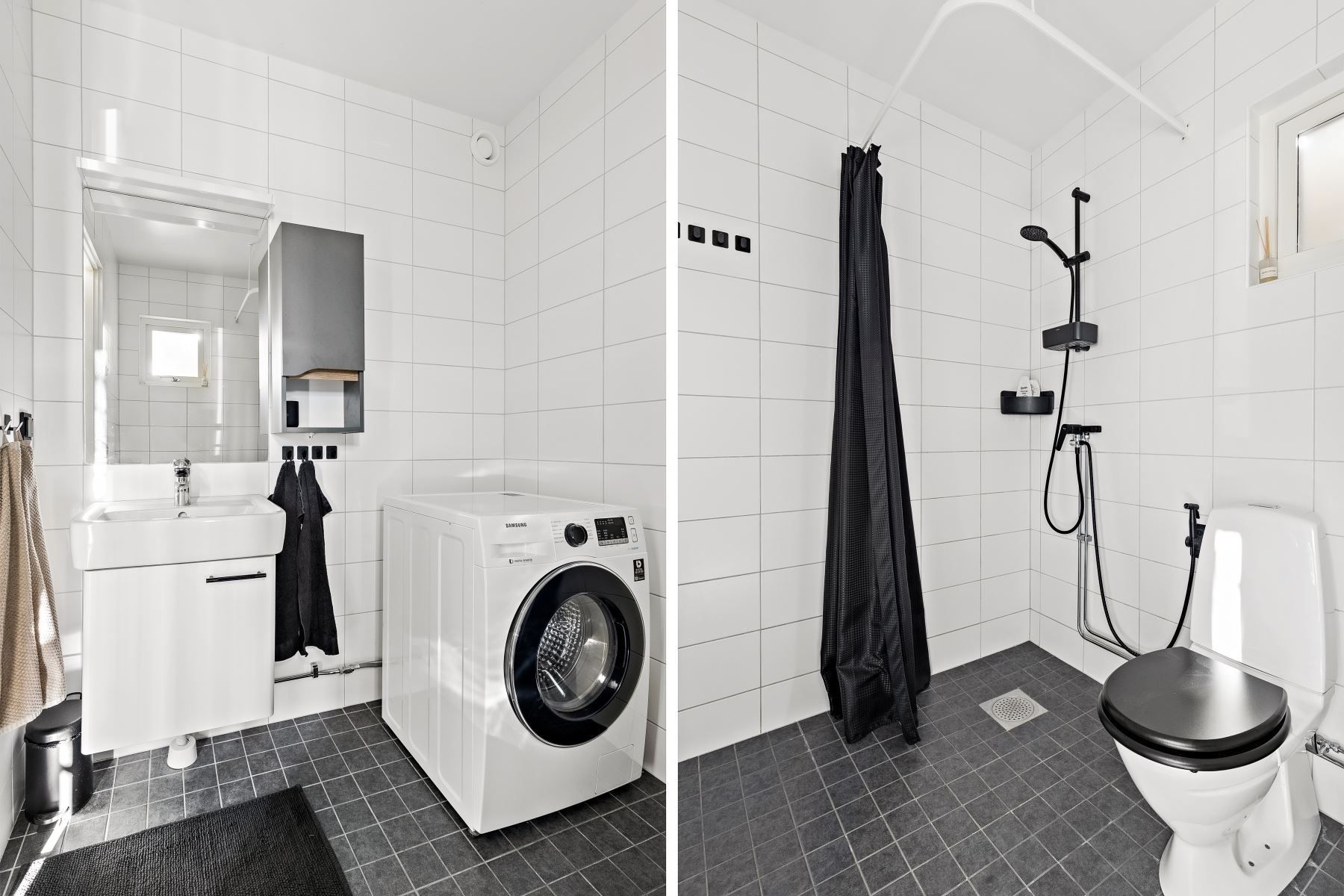 Duschutrymmet är en modern och smakfullt renoverad oas med helkaklade väggar och ett grått klinkergolv med golvvärme. Här finns en dusch med wc, handfat med ett avtagbart vattenlås för enkel rengöring samt en ny Samsung kombitvättmaskin som gör vardagen smidig.