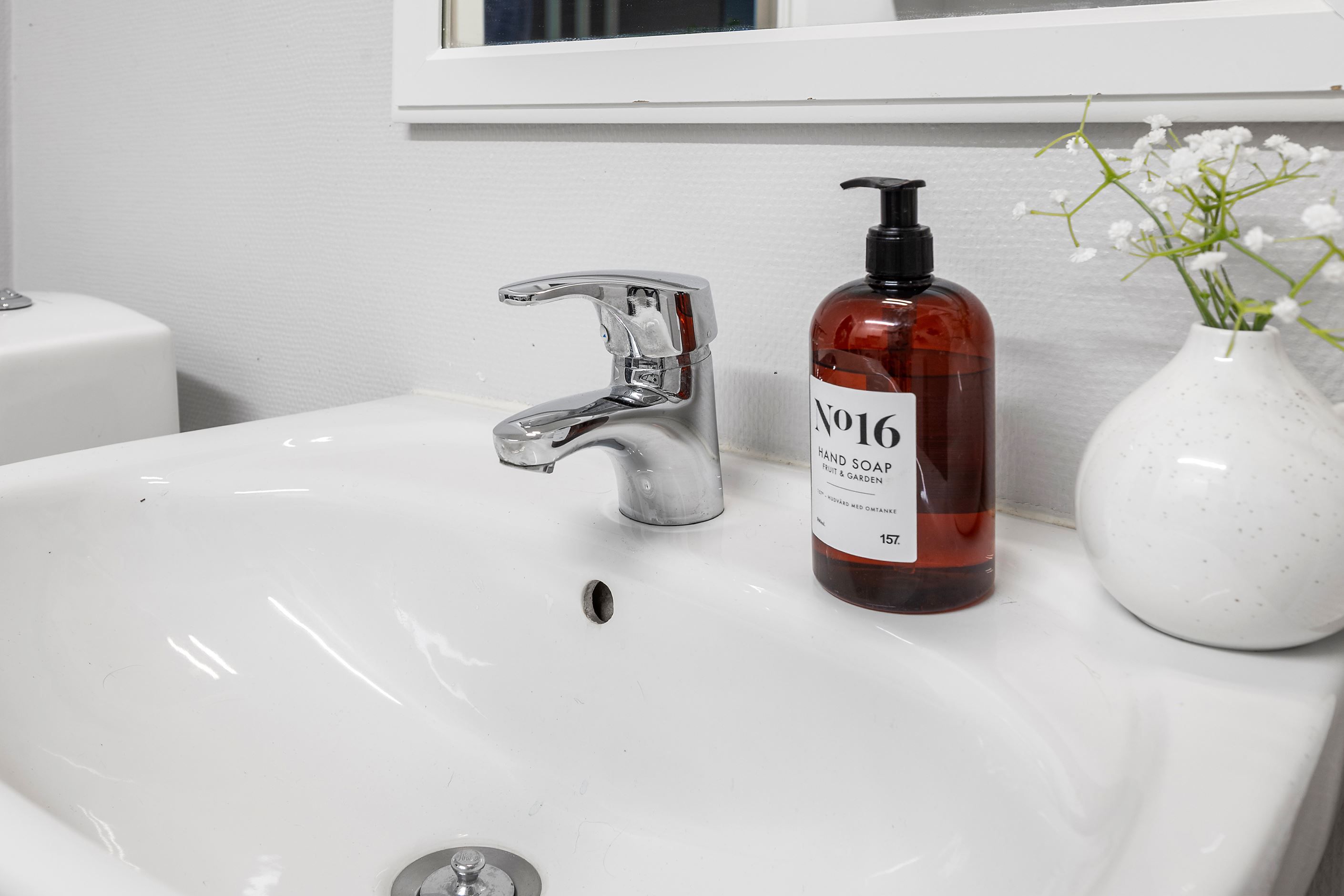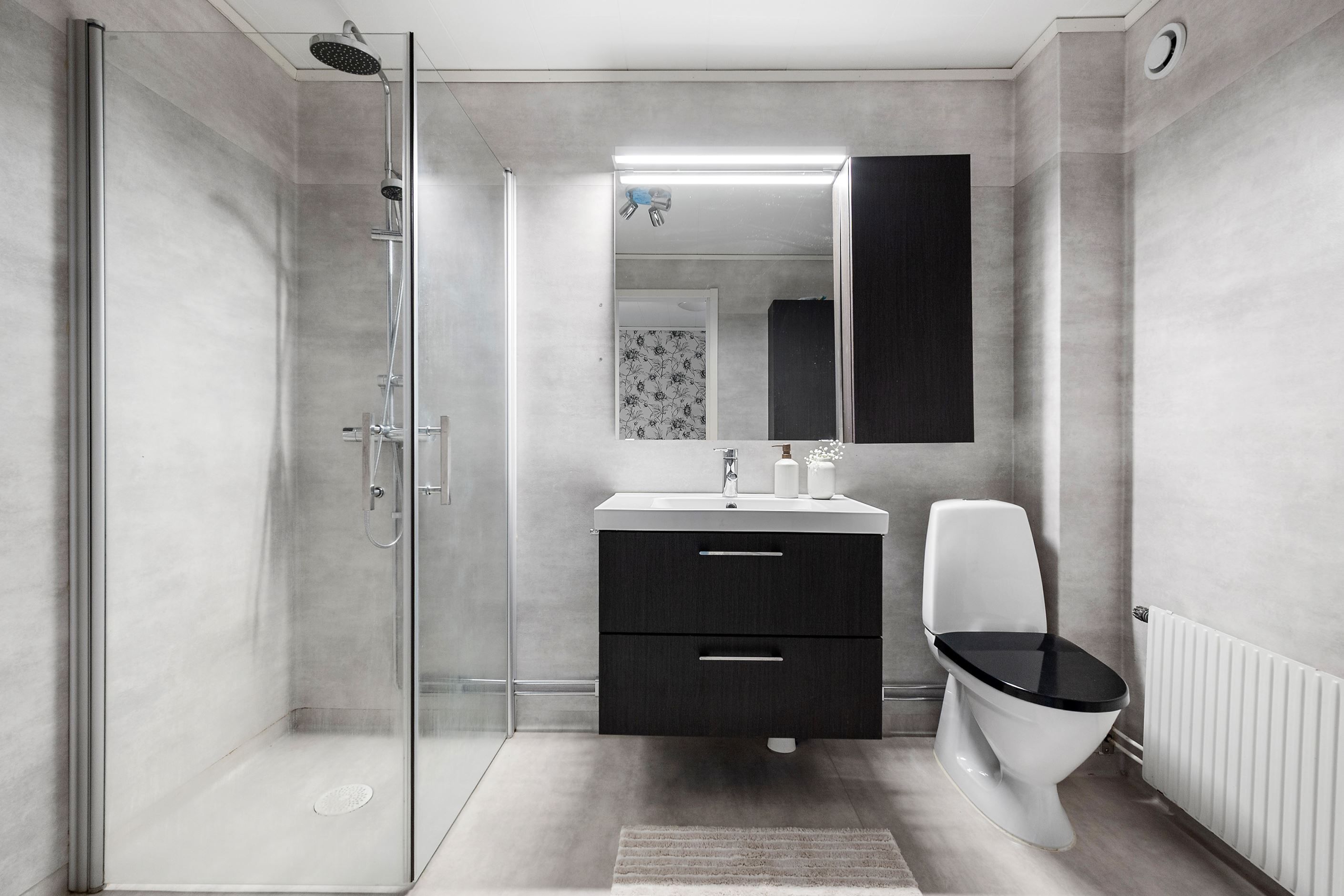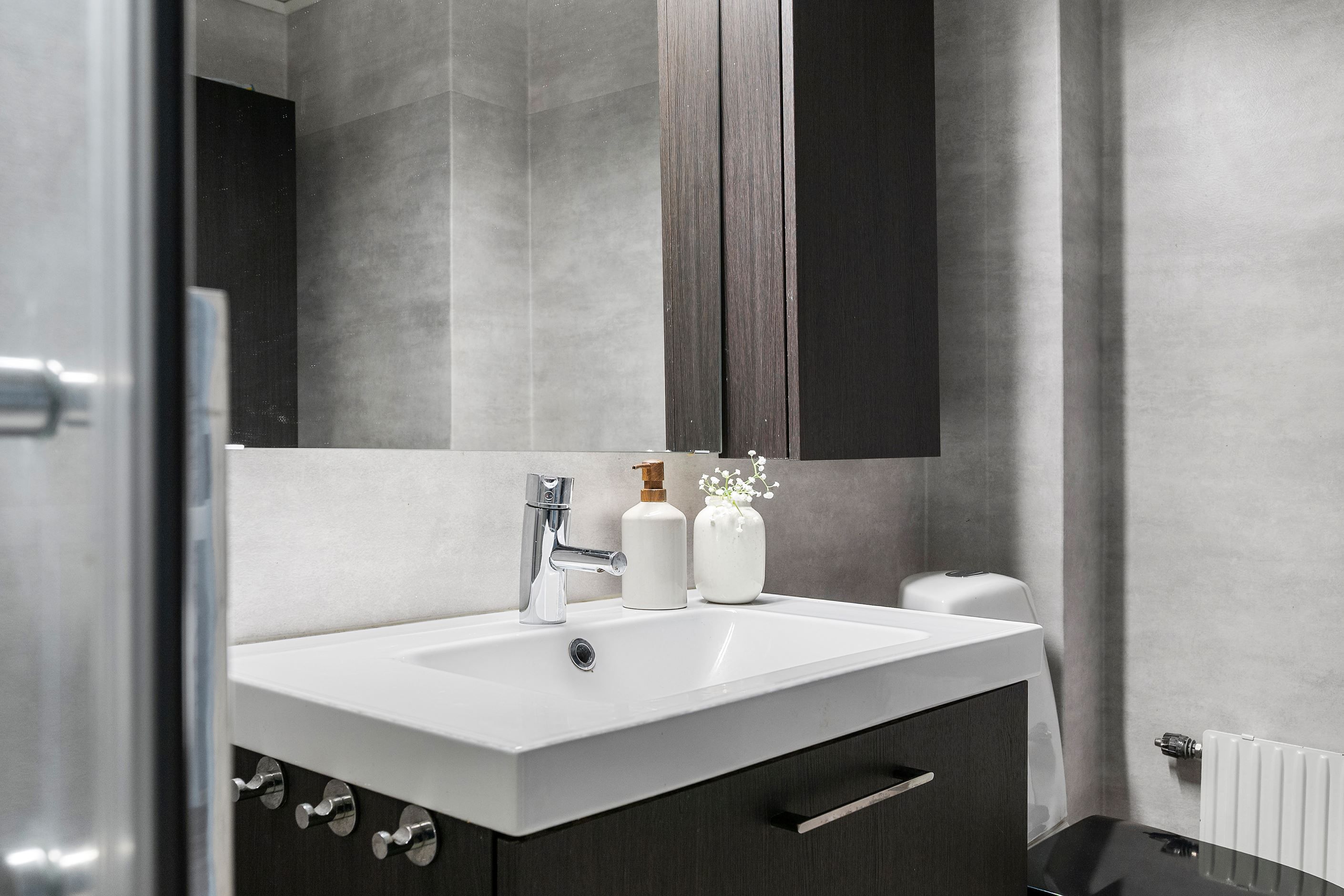 Från den inre hallen, smidigt placerad mellan kök och vardagsrum, når du även bostadens ena badrum – praktiskt och lättillgängligt.