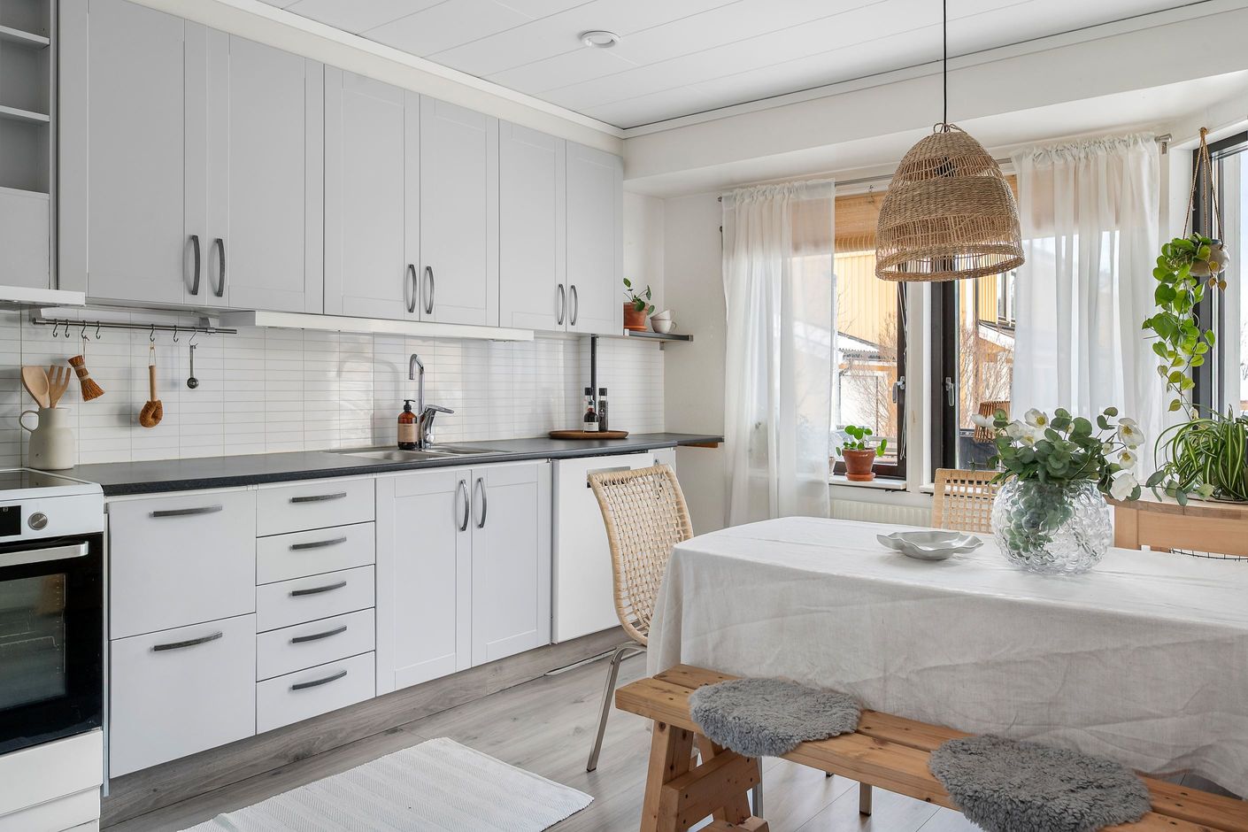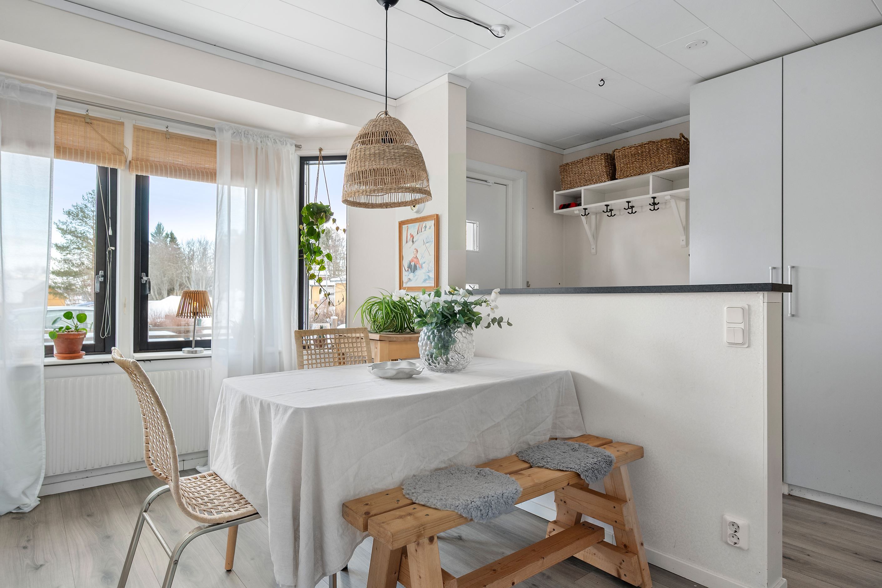 Invändigt öppnar bostaden upp sig med fina sociala ytor på entréplan. Det nyrenoverade, stilrena köket blir hemmets självklara samlingspunkt – modernt, funktionellt och inbjudande. Intill ligger ett ljust och trivsamt vardagsrum med gott om plats för både soffgrupp och matplats. Härifrån kliver du rakt ut till den inglasade uteplatsen i eftermiddagssol – en förlängning av vardagsrummet som kan nyttjas stora delar av året.
