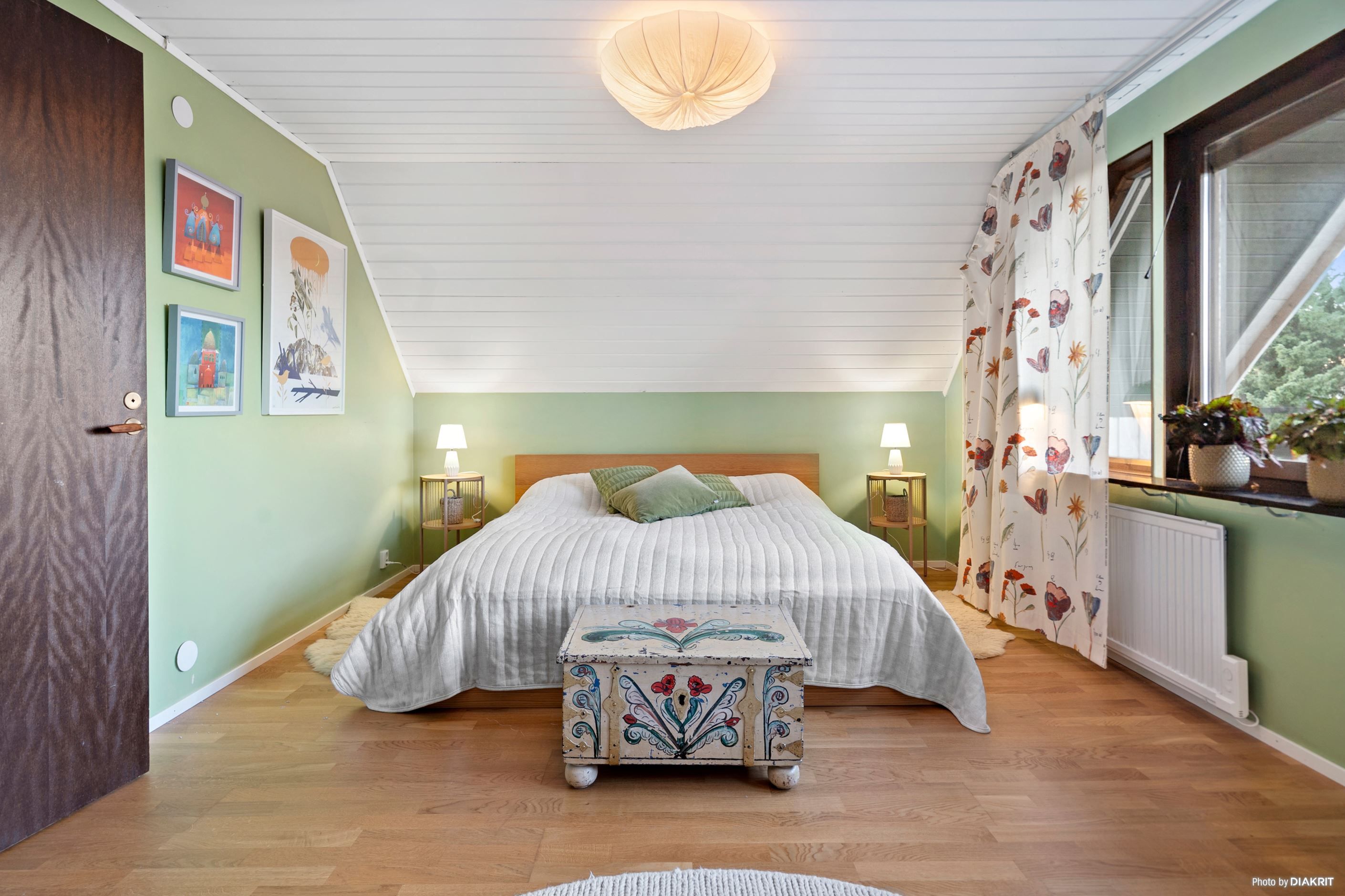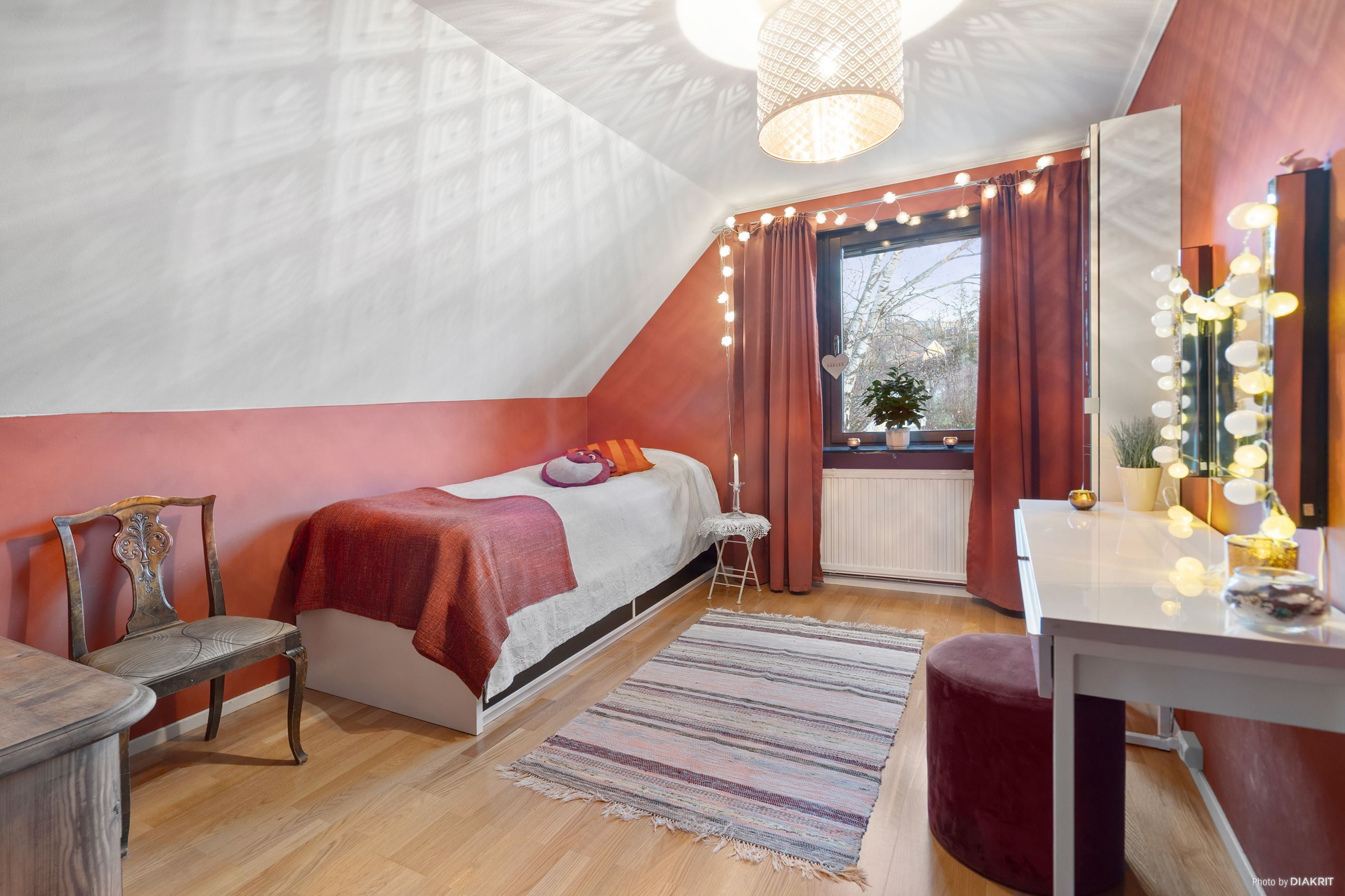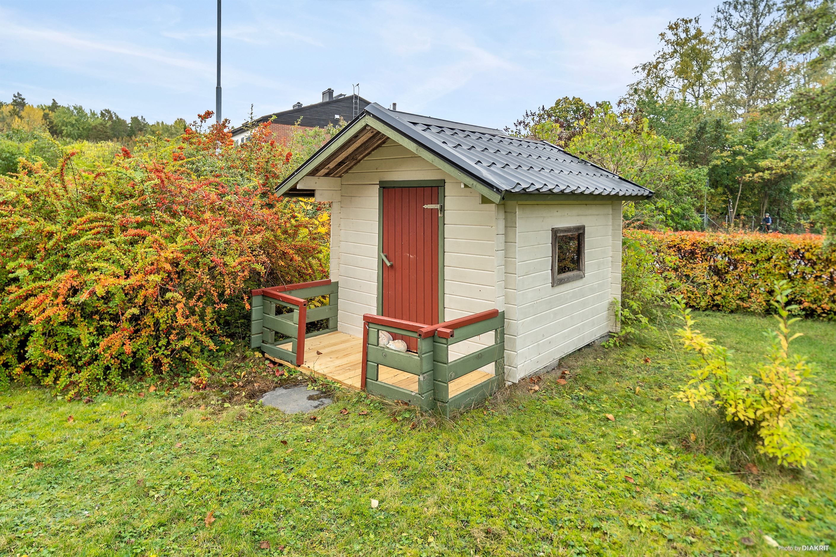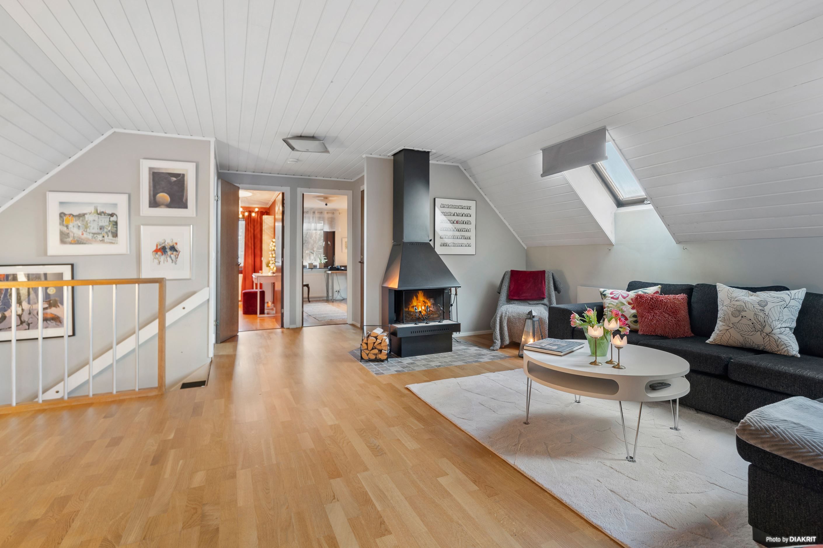 Övervåningen som verkligen bjuder in till socialt umgänge tack vare den stora ungdomsavdelningen med öppen spis och de tre sovrummen, där det större föräldrasovrummet har utgång till en balkong i västerläge. Här finns också kaklat duschrum samt klädkammare som underlättar vardagslivet. För sommarens uteliv och privat avkoppling, finns en stor insynsskyddad terrass för lata dagar med familj och vänner. Trädgården som ligger med ett fritt gavelläge, är lätt att tycka om och erbjuder hela 1113 kvadratmeter, vilket ger stora möjligheter och fina ytor för utveckla ert trädgårdsintresse. Här finns fruktträd, buskar, lekstuga för familjens busfrön och trädgårdsförråd på ca 2 kvadratmeter med plats för trädgårdsredskap och gräsklippare. Vid huset finns också ett garage samt ett isolerat förråd på omkring 14 kvadratmeter.