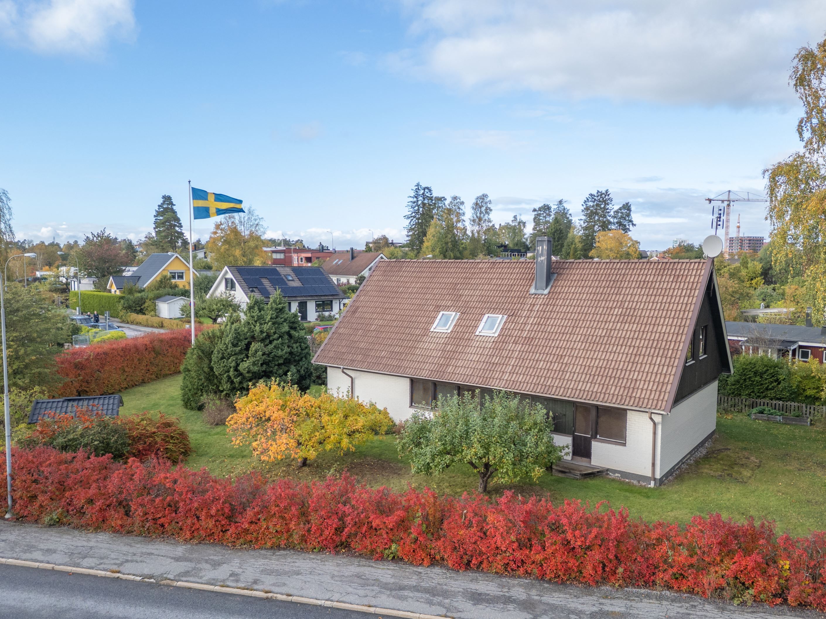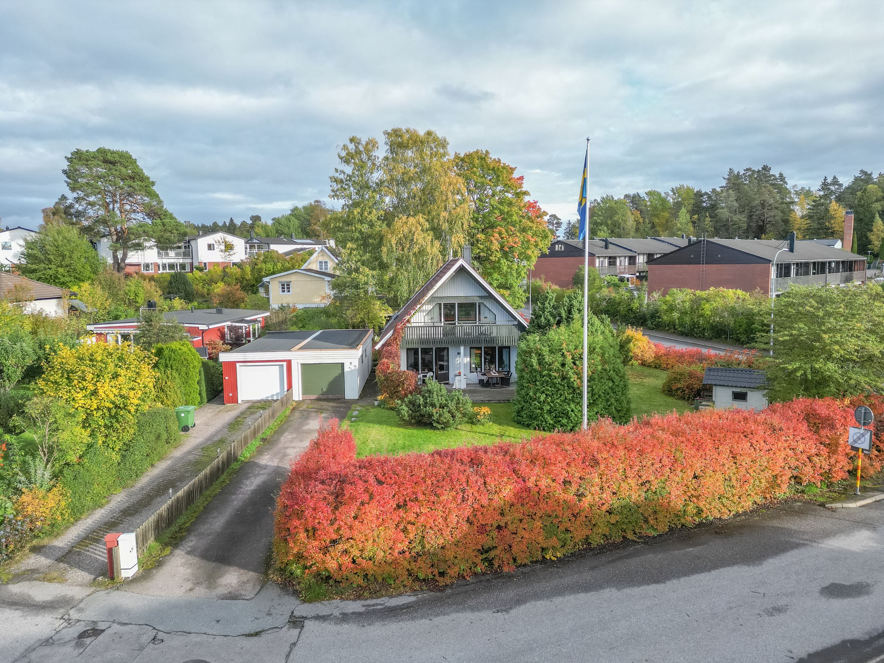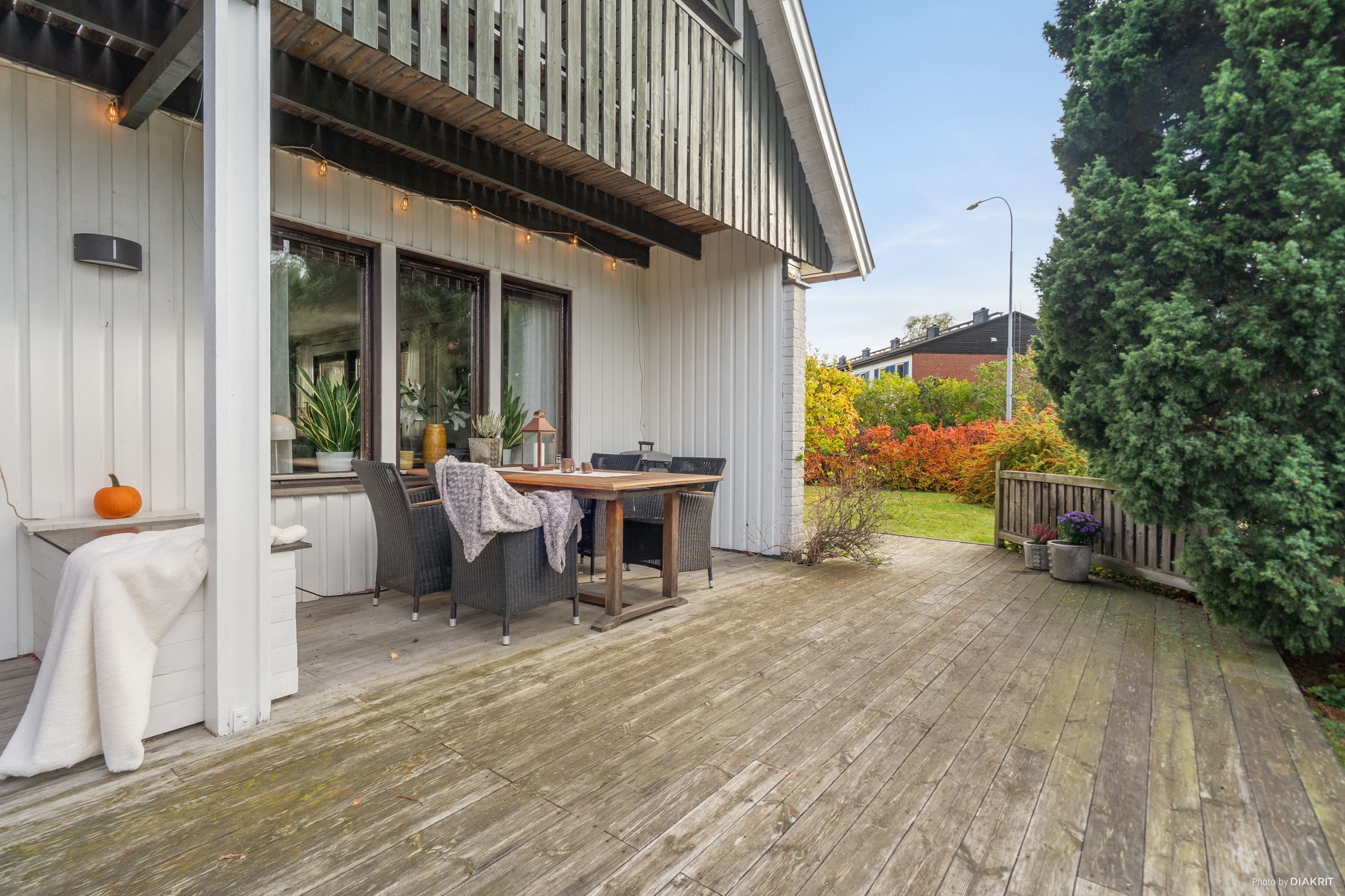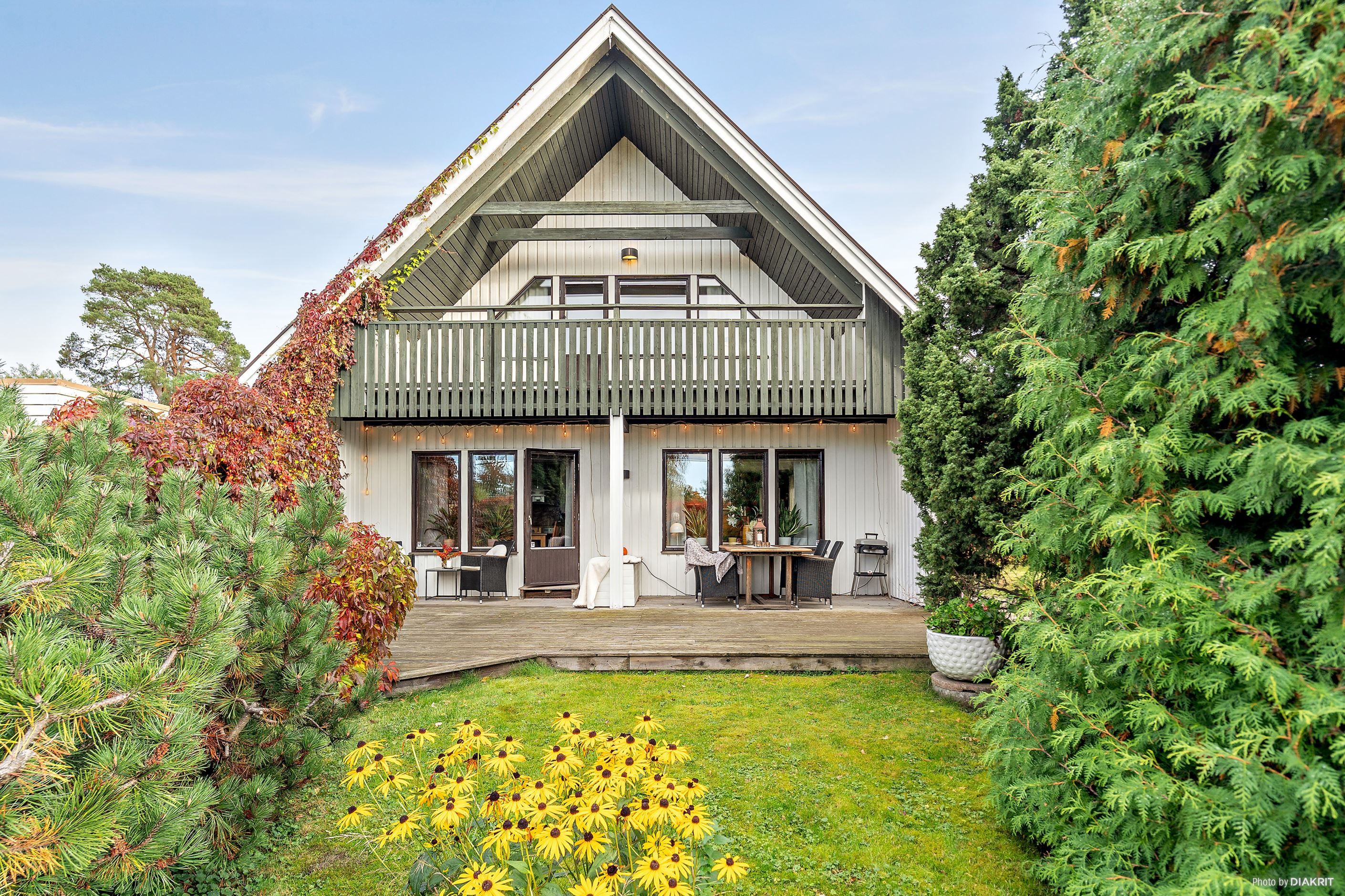 Övervåningen som verkligen bjuder in till socialt umgänge tack vare den stora ungdomsavdelningen med öppen spis och de tre sovrummen, där det större föräldrasovrummet har utgång till en balkong i västerläge. Här finns också kaklat duschrum samt klädkammare som underlättar vardagslivet. För sommarens uteliv och privat avkoppling, finns en stor insynsskyddad terrass för lata dagar med familj och vänner. Trädgården som ligger med ett fritt gavelläge, är lätt att tycka om och erbjuder hela 1113 kvadratmeter, vilket ger stora möjligheter och fina ytor för utveckla ert trädgårdsintresse. Här finns fruktträd, buskar, lekstuga för familjens busfrön och trädgårdsförråd på ca 2 kvadratmeter med plats för trädgårdsredskap och gräsklippare. Vid huset finns också ett garage samt ett isolerat förråd på omkring 14 kvadratmeter.