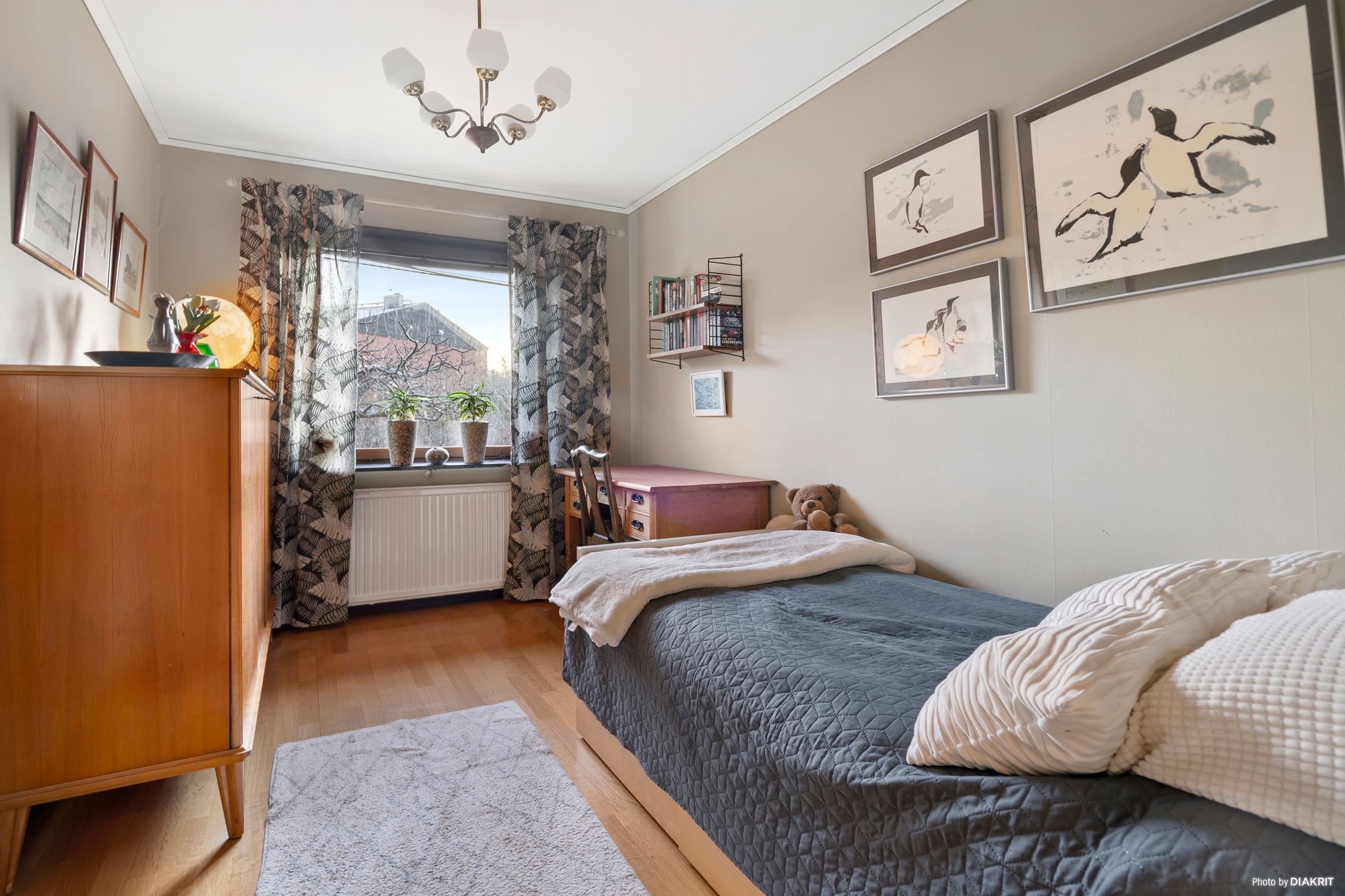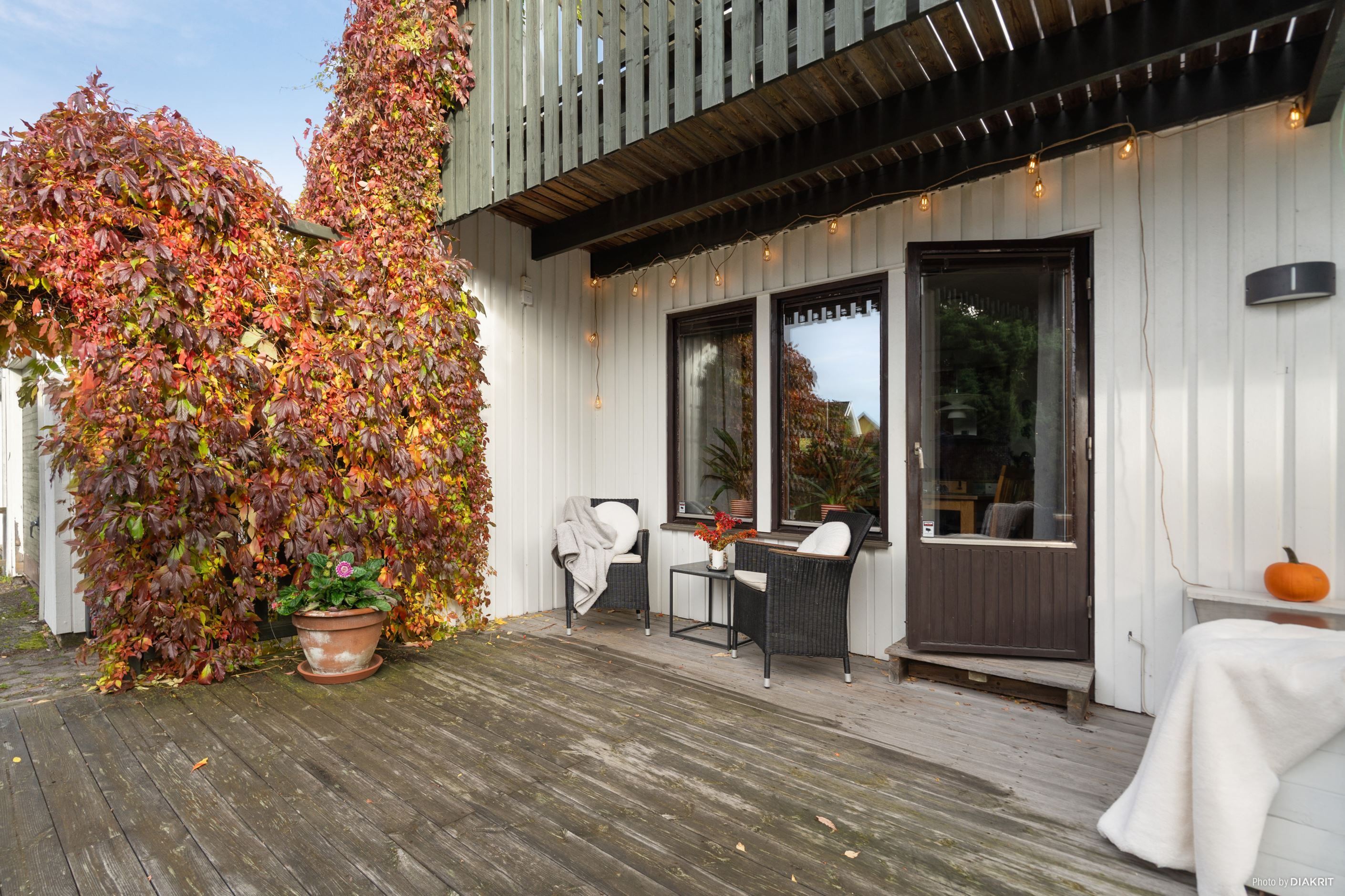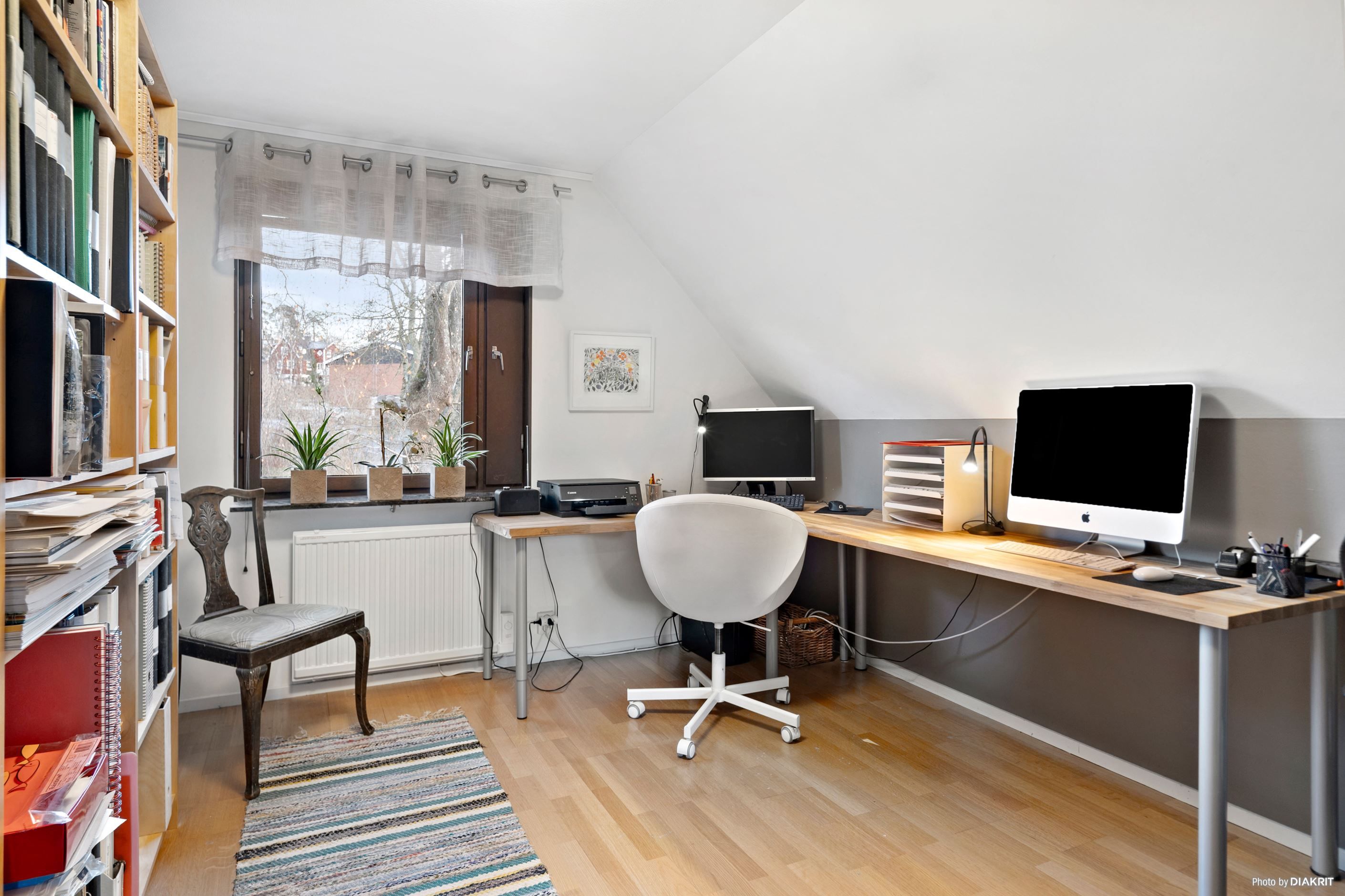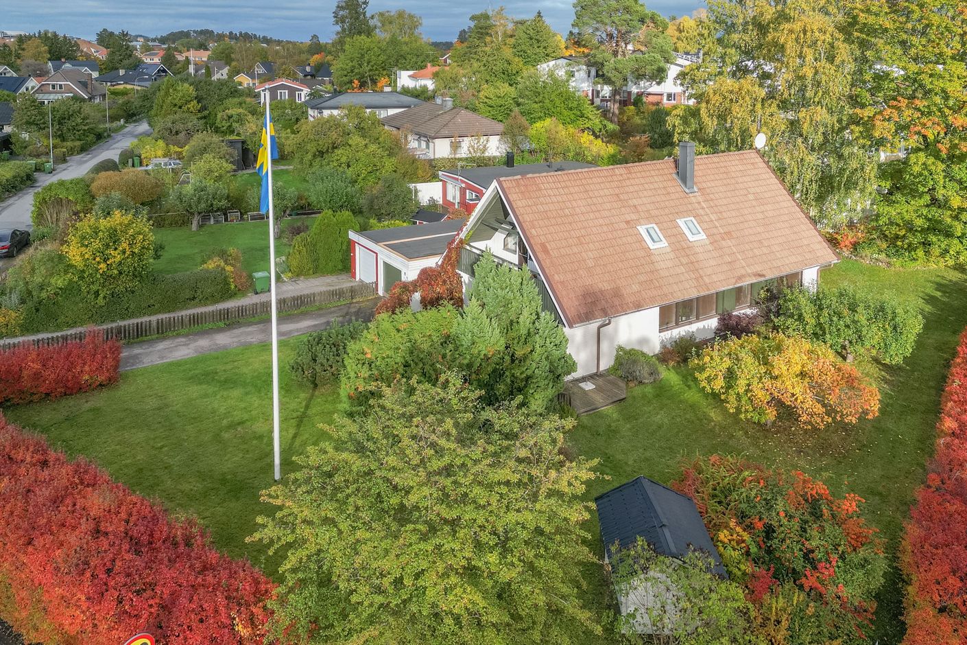 Övervåningen som verkligen bjuder in till socialt umgänge tack vare den stora ungdomsavdelningen med öppen spis och de tre sovrummen, där det större föräldrasovrummet har utgång till en balkong i västerläge. Här finns också kaklat duschrum samt klädkammare som underlättar vardagslivet. För sommarens uteliv och privat avkoppling, finns en stor insynsskyddad terrass för lata dagar med familj och vänner. Trädgården som ligger med ett fritt gavelläge, är lätt att tycka om och erbjuder hela 1113 kvadratmeter, vilket ger stora möjligheter och fina ytor för utveckla ert trädgårdsintresse. Här finns fruktträd, buskar, lekstuga för familjens busfrön och trädgårdsförråd på ca 2 kvadratmeter med plats för trädgårdsredskap och gräsklippare. Vid huset finns också ett garage samt ett isolerat förråd på omkring 14 kvadratmeter.