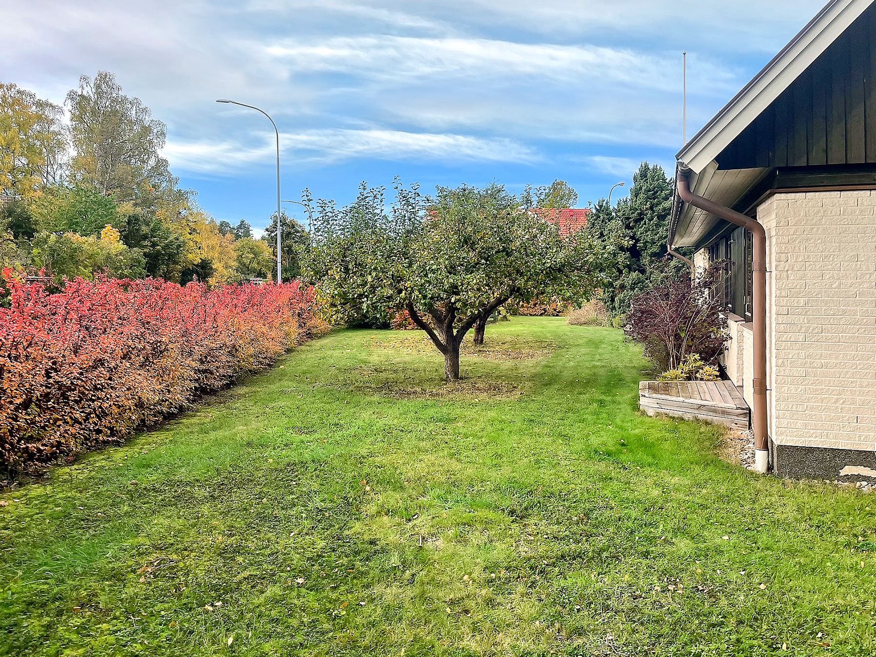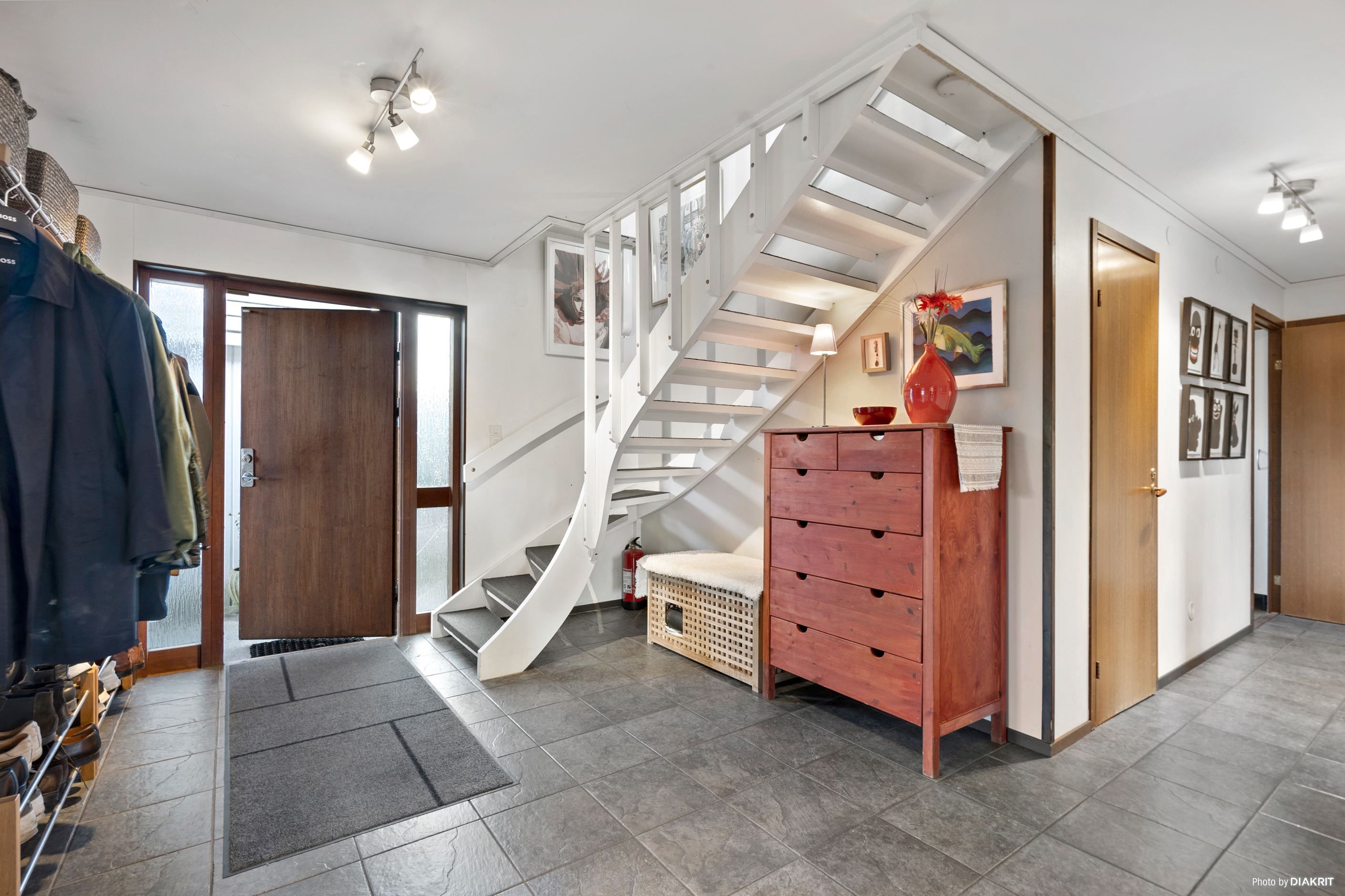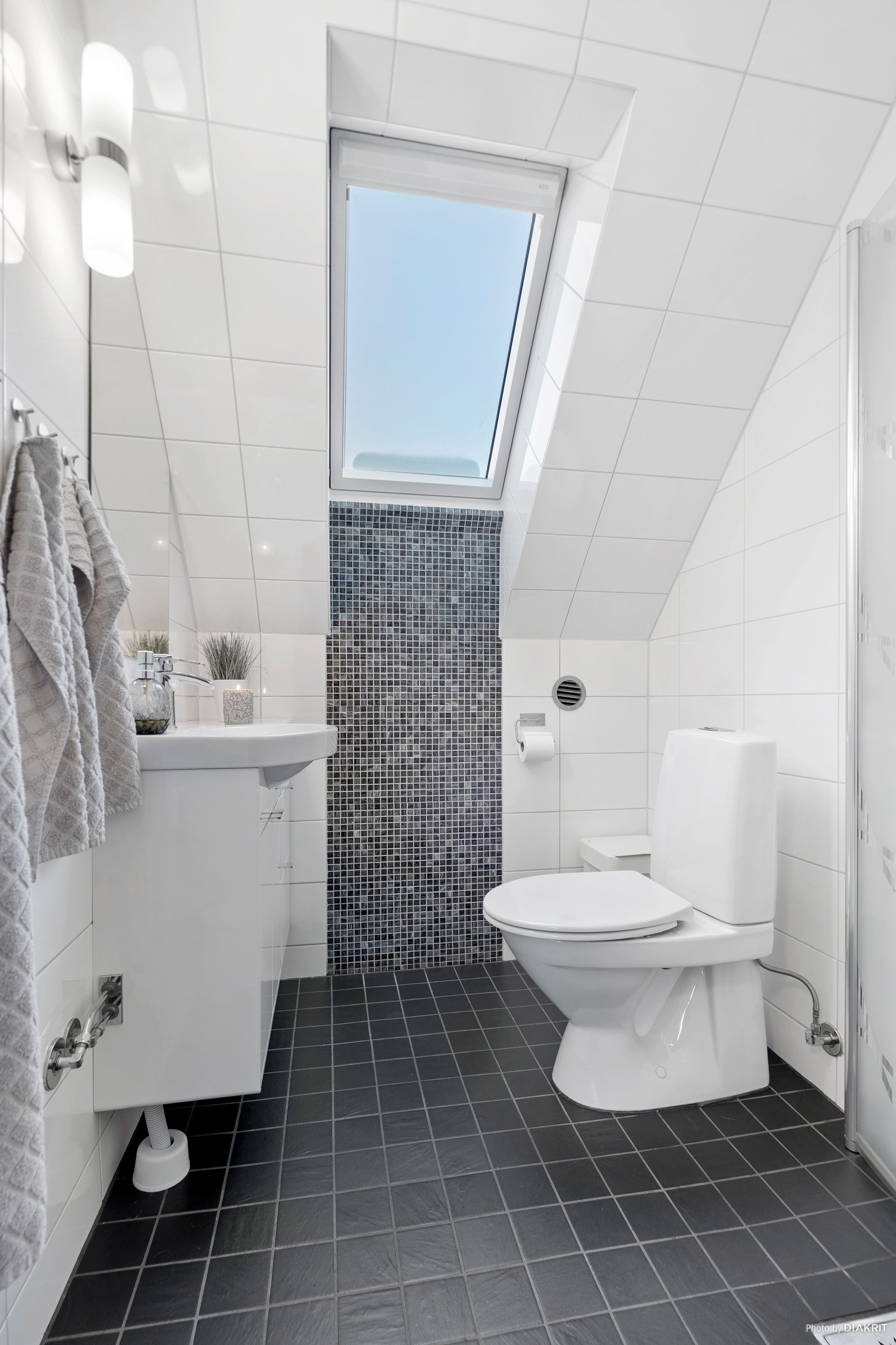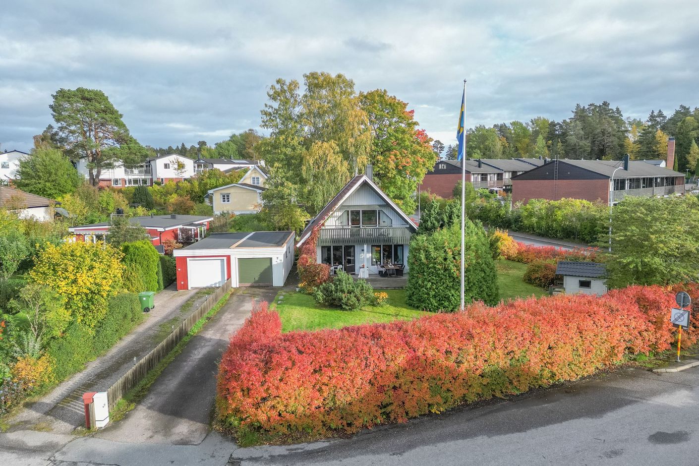 Övervåningen som verkligen bjuder in till socialt umgänge tack vare den stora ungdomsavdelningen med öppen spis och de tre sovrummen, där det större föräldrasovrummet har utgång till en balkong i västerläge. Här finns också kaklat duschrum samt klädkammare som underlättar vardagslivet. För sommarens uteliv och privat avkoppling, finns en stor insynsskyddad terrass för lata dagar med familj och vänner. Trädgården som ligger med ett fritt gavelläge, är lätt att tycka om och erbjuder hela 1113 kvadratmeter, vilket ger stora möjligheter och fina ytor för utveckla ert trädgårdsintresse. Här finns fruktträd, buskar, lekstuga för familjens busfrön och trädgårdsförråd på ca 2 kvadratmeter med plats för trädgårdsredskap och gräsklippare. Vid huset finns också ett garage samt ett isolerat förråd på omkring 14 kvadratmeter.