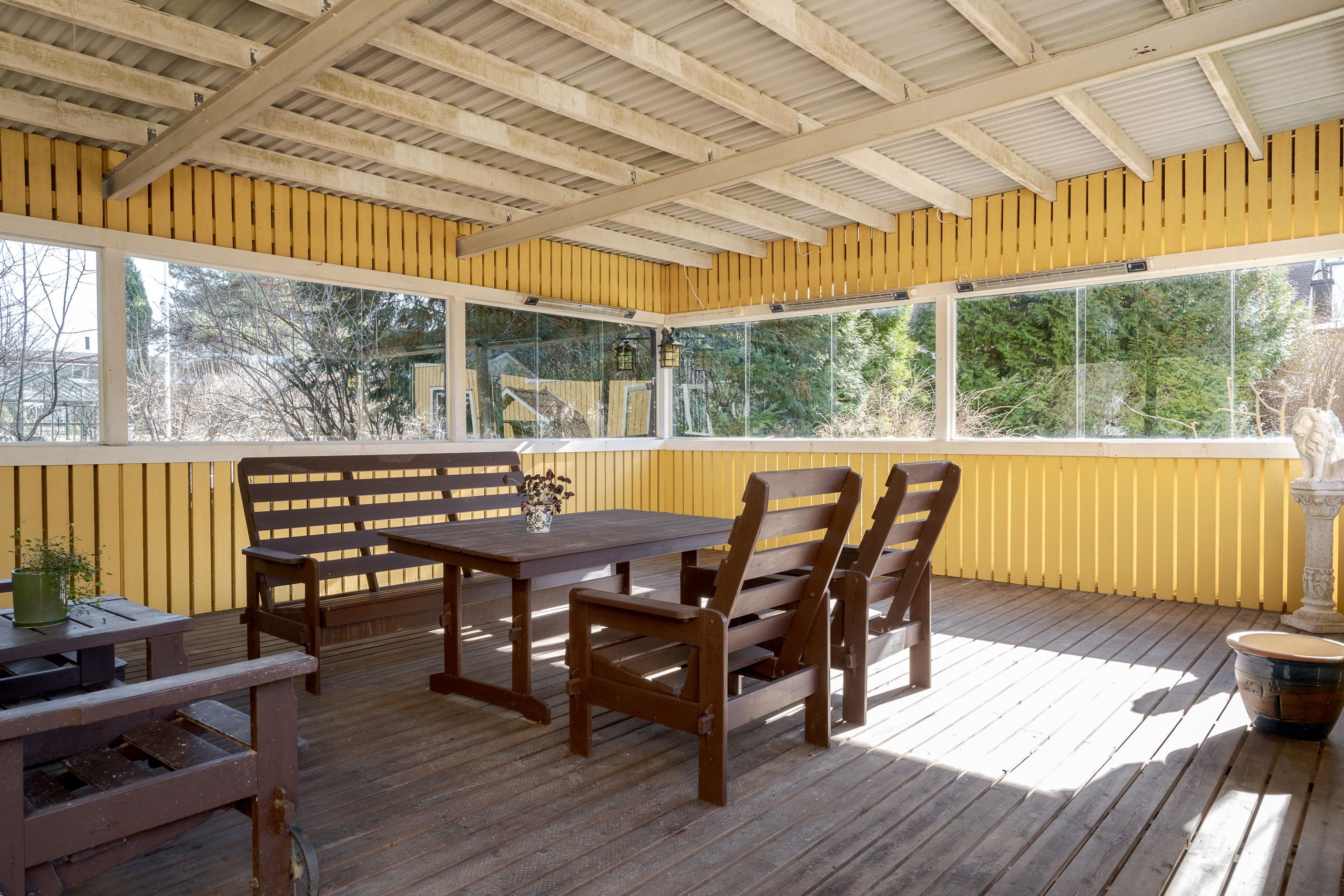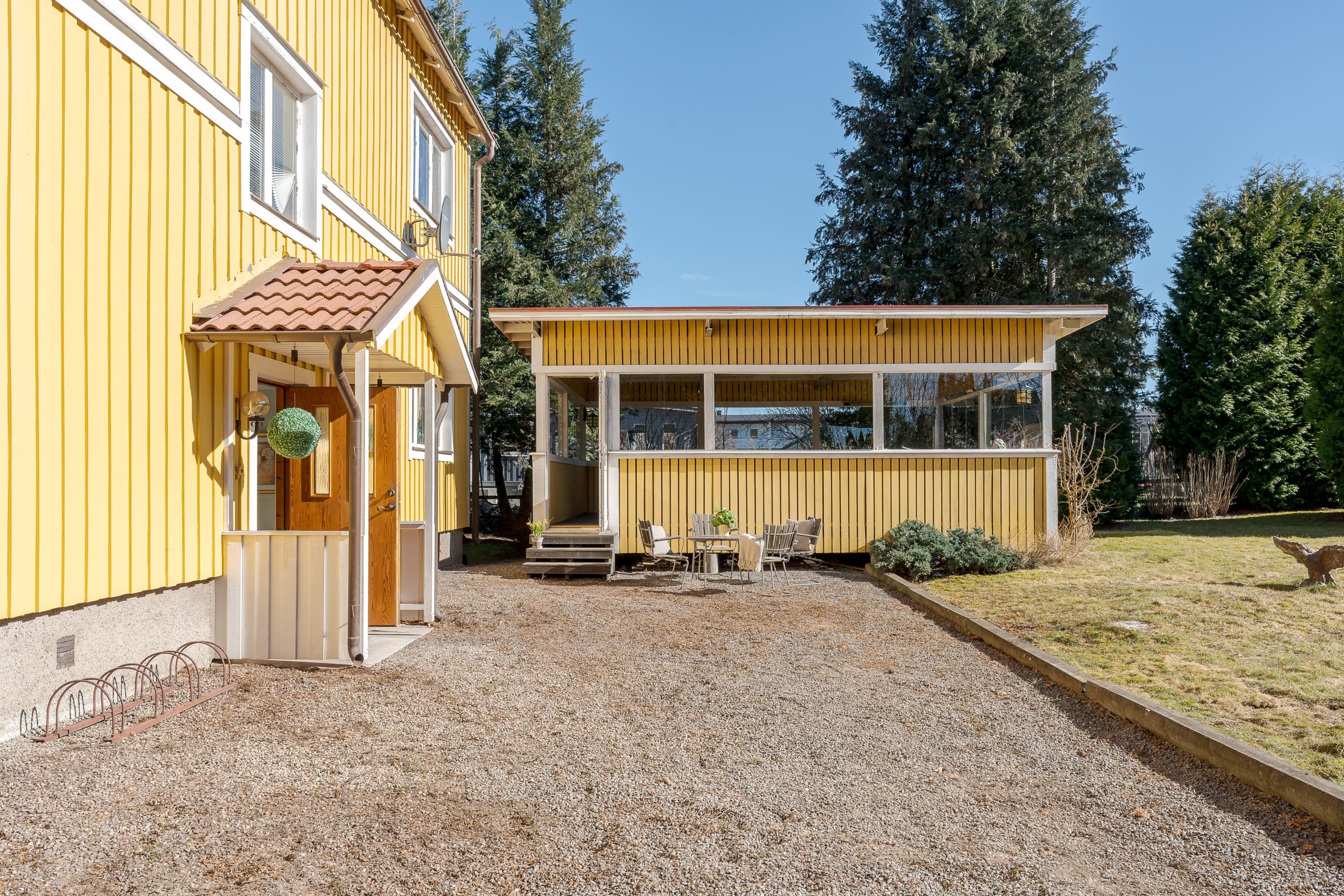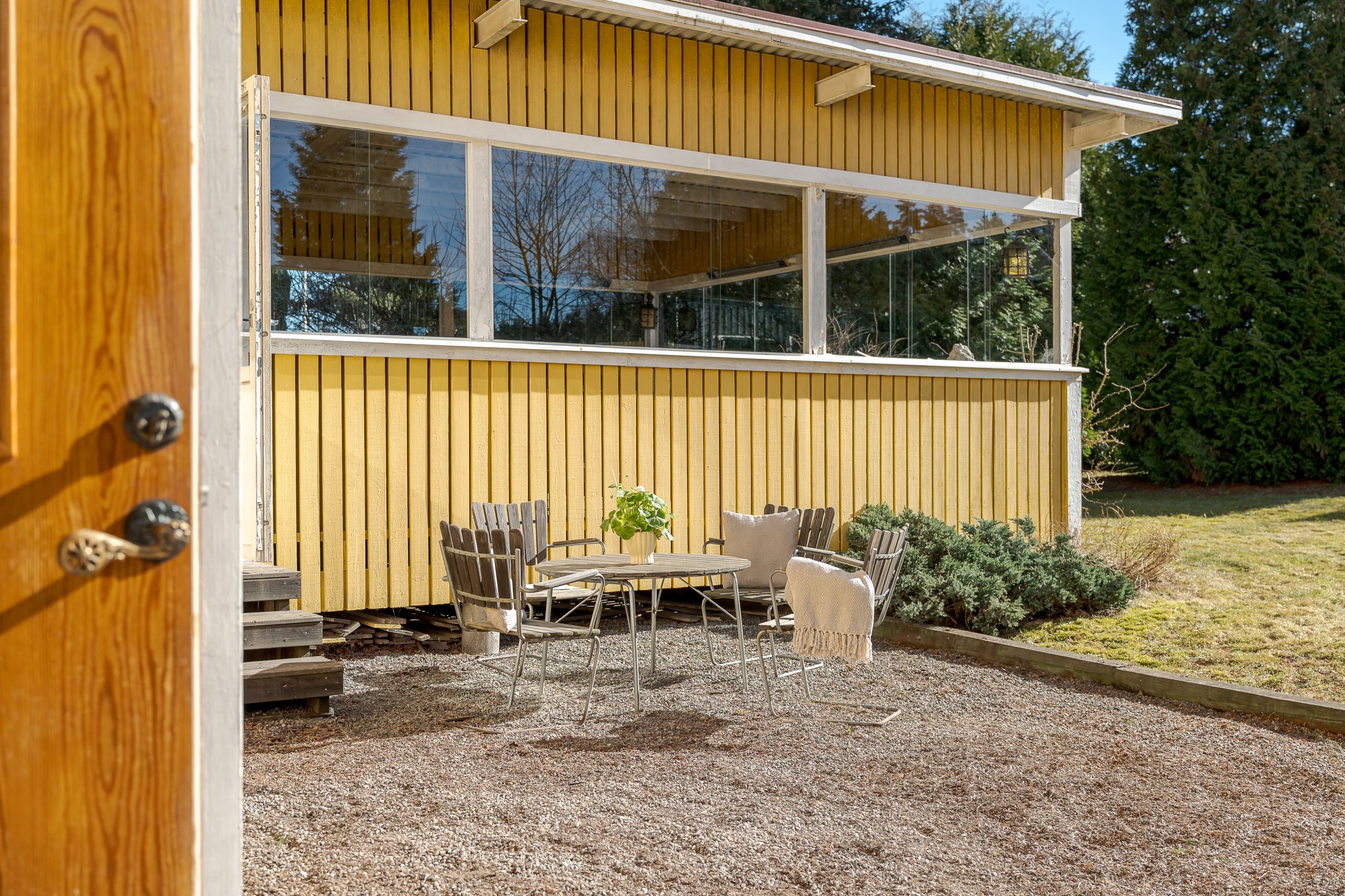Tomten om hela 1098 kvm bjuder på stora gräsytor för lek, odling och avkoppling. På tomten finns även ett stort, fristående inglasat uterum – en perfekt plats för sociala tillställningar, sommarfester eller lugna stunder i skuggan under varma dagar.