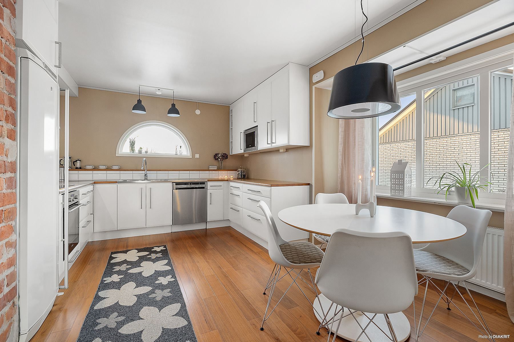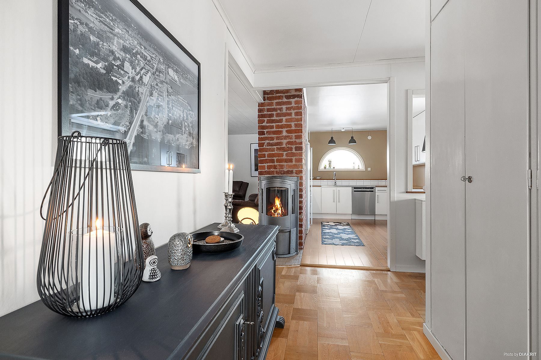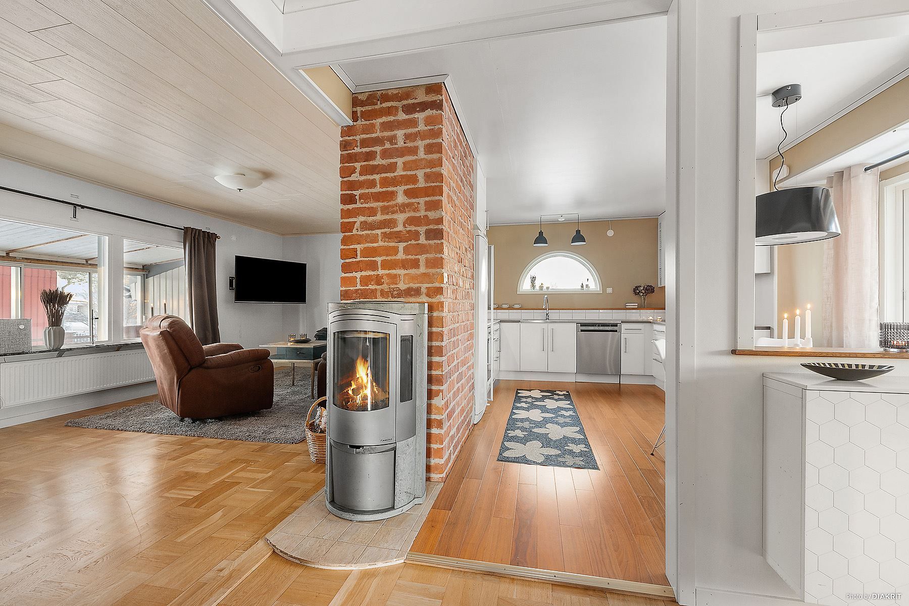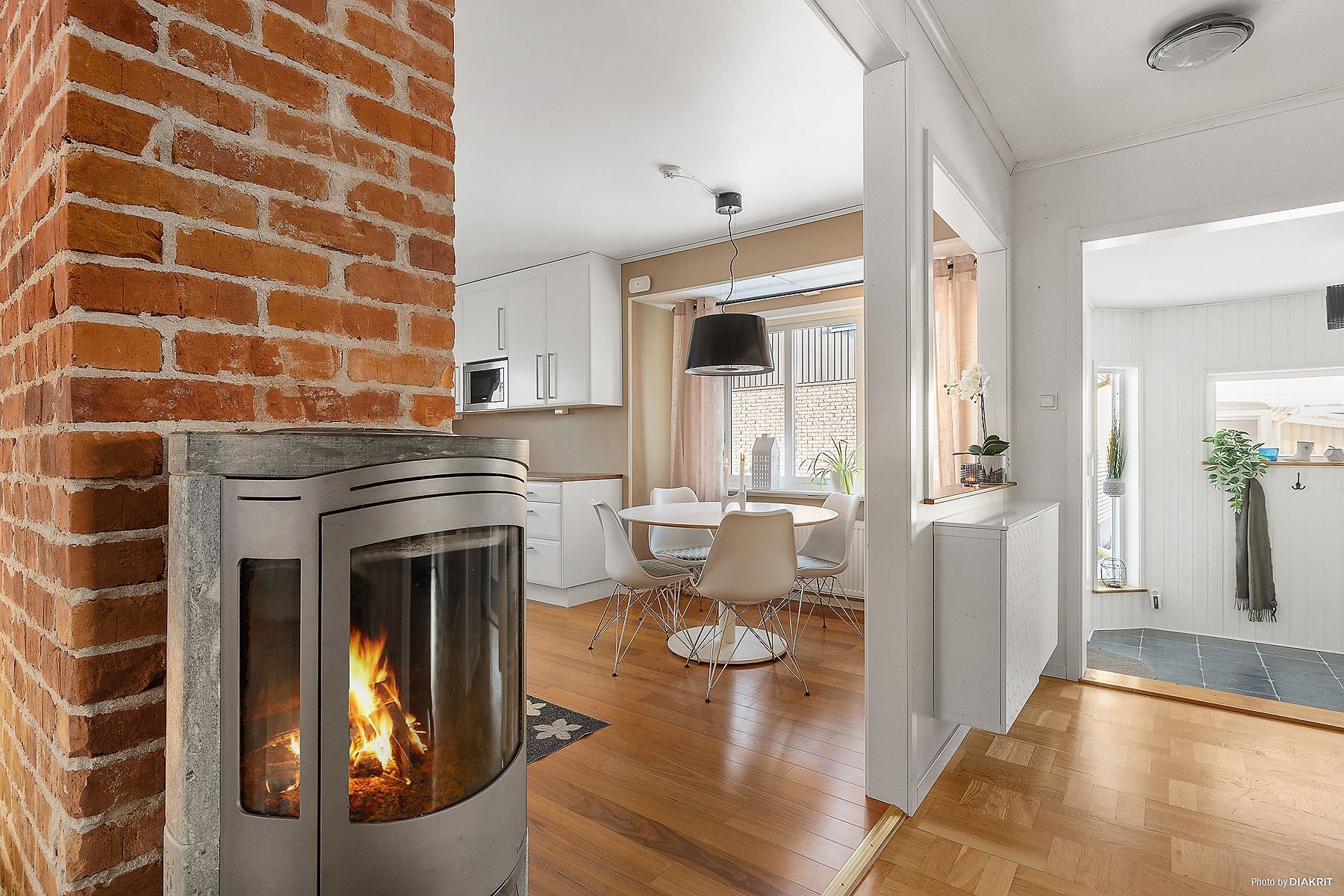 På entréplanet möts du av ett ljust och inbjudande kök med gott om arbetsytor, bra förvaring och en trevlig matplatsdel. Intill ligger det generösa vardagsrummet, där den öppna spisen skapar extra mysfaktor. Härifrån når du även den inglasade altanen på baksidan, perfekt för avkoppling eller sociala stunder.