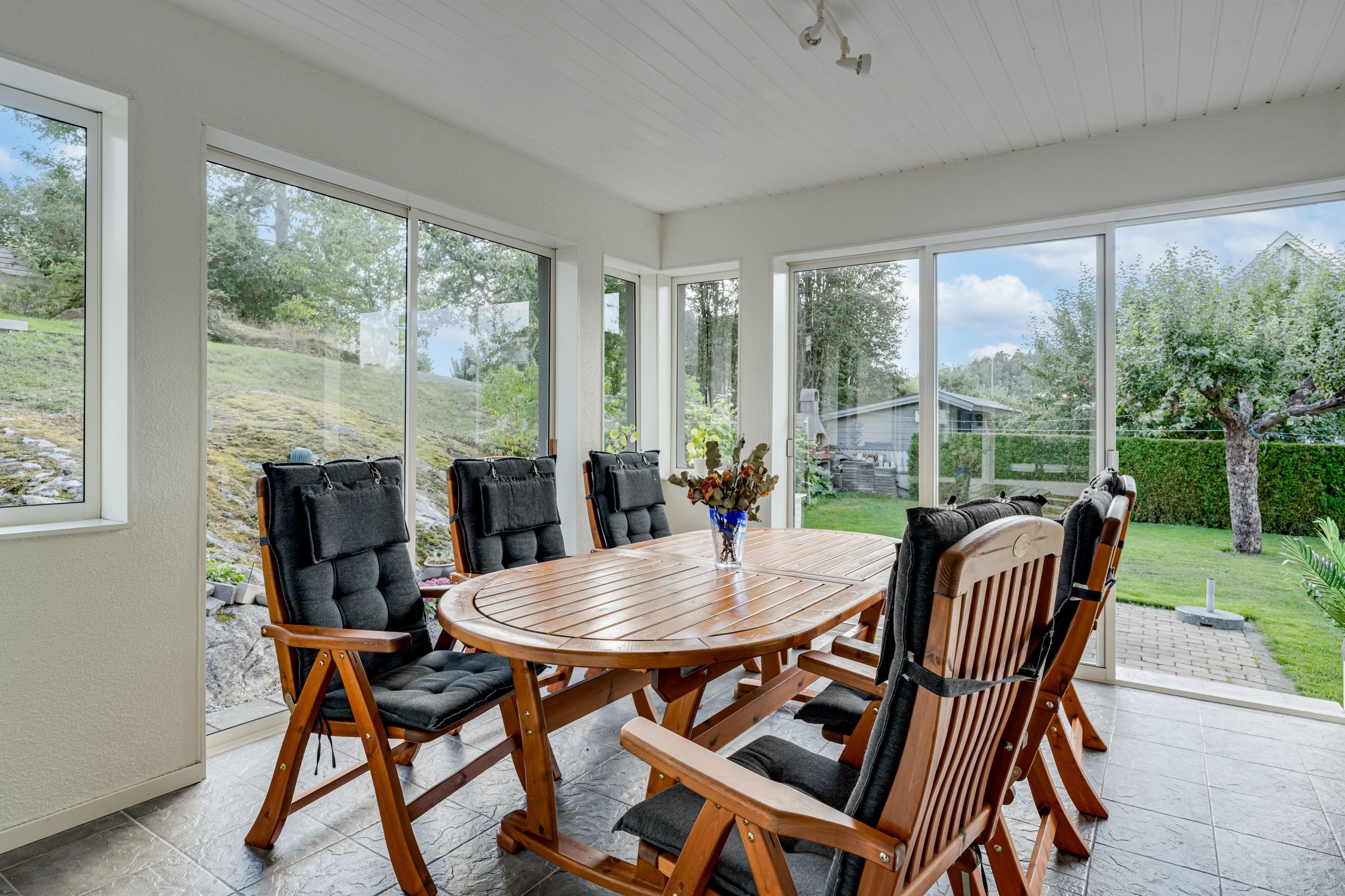 Den inglasade verandan, integrerad med huset, fungerar som en naturlig samlingspunkt året runt – oavsett säsong.