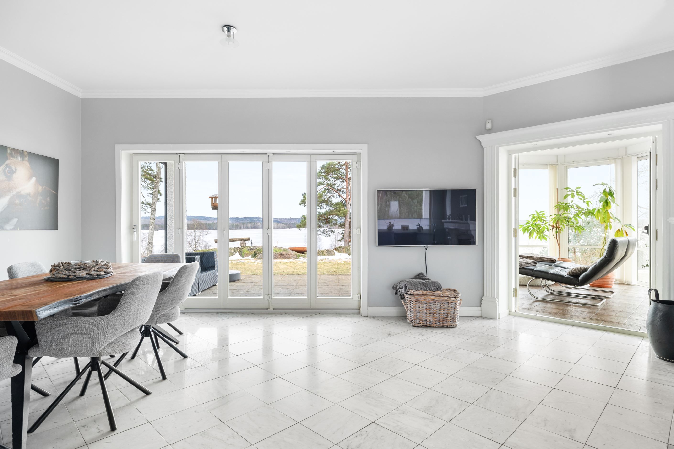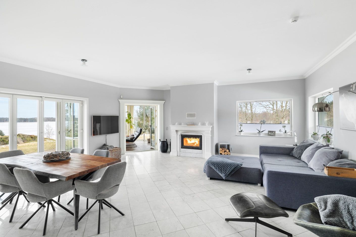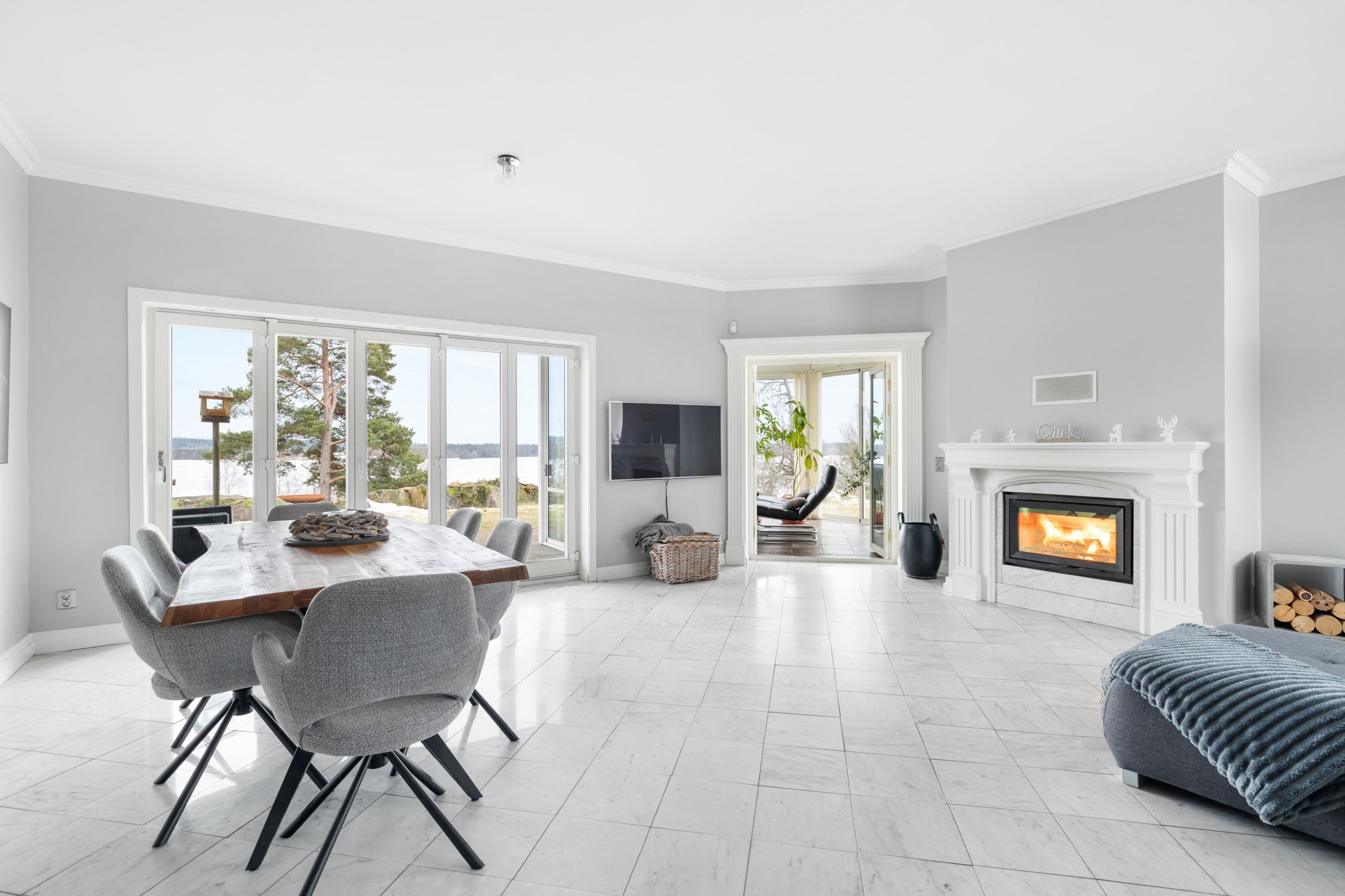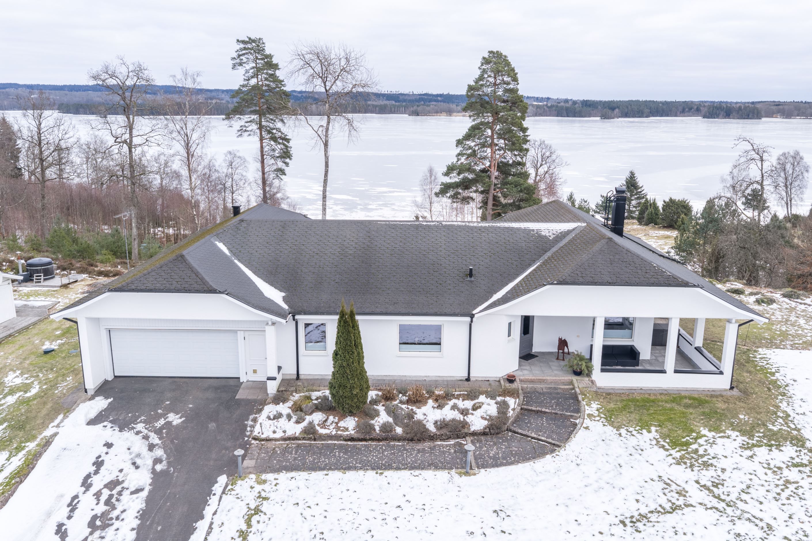 Bostadshuset på fastigheten Herrestad 1:234 är smakfullt utformat med generösa ytor och en öppen, luftig planlösning där naturen ständigt gör sig påmind genom stora fönsterpartier. Den öppna spisen bidrar till en varm och inbjudande atmosfär under årets kallare månader. Huset rymmer 3–4 sovrum samt ett inglasat uterum där du kan njuta av den vackra sjöutsikten året om. För extra bekvämlighet finns dessutom direktaccess från det rymliga dubbelgaraget in i bostadshuset.