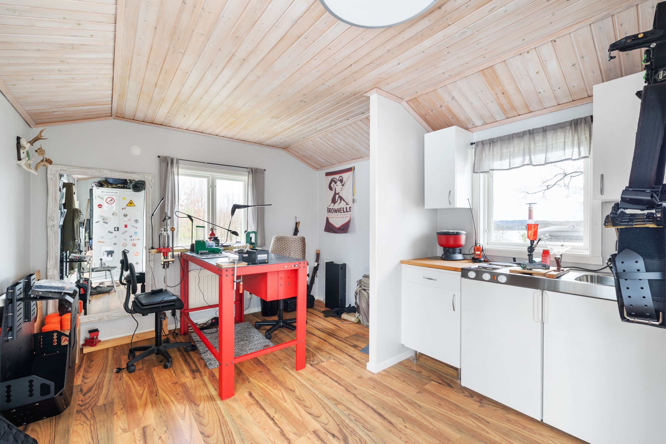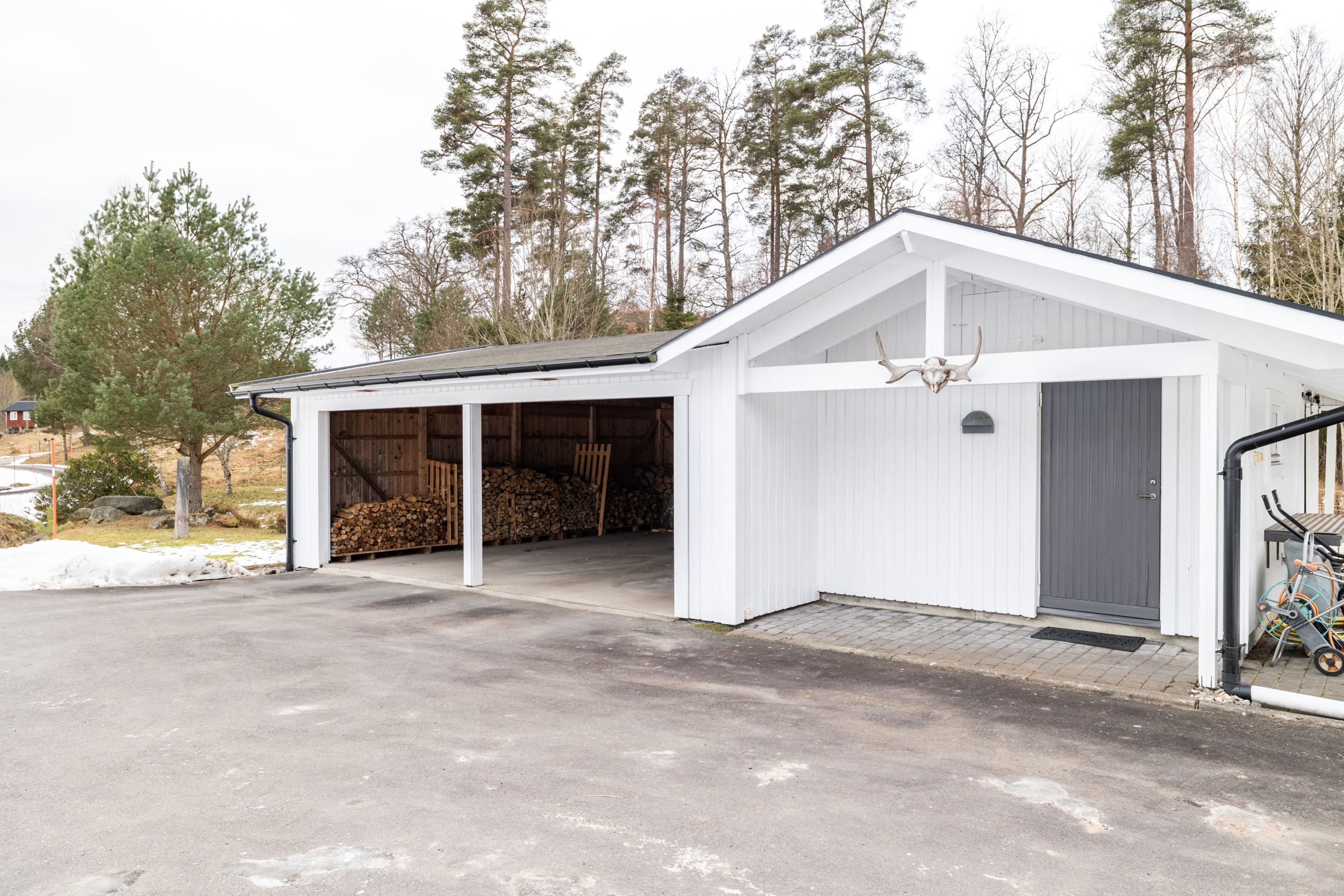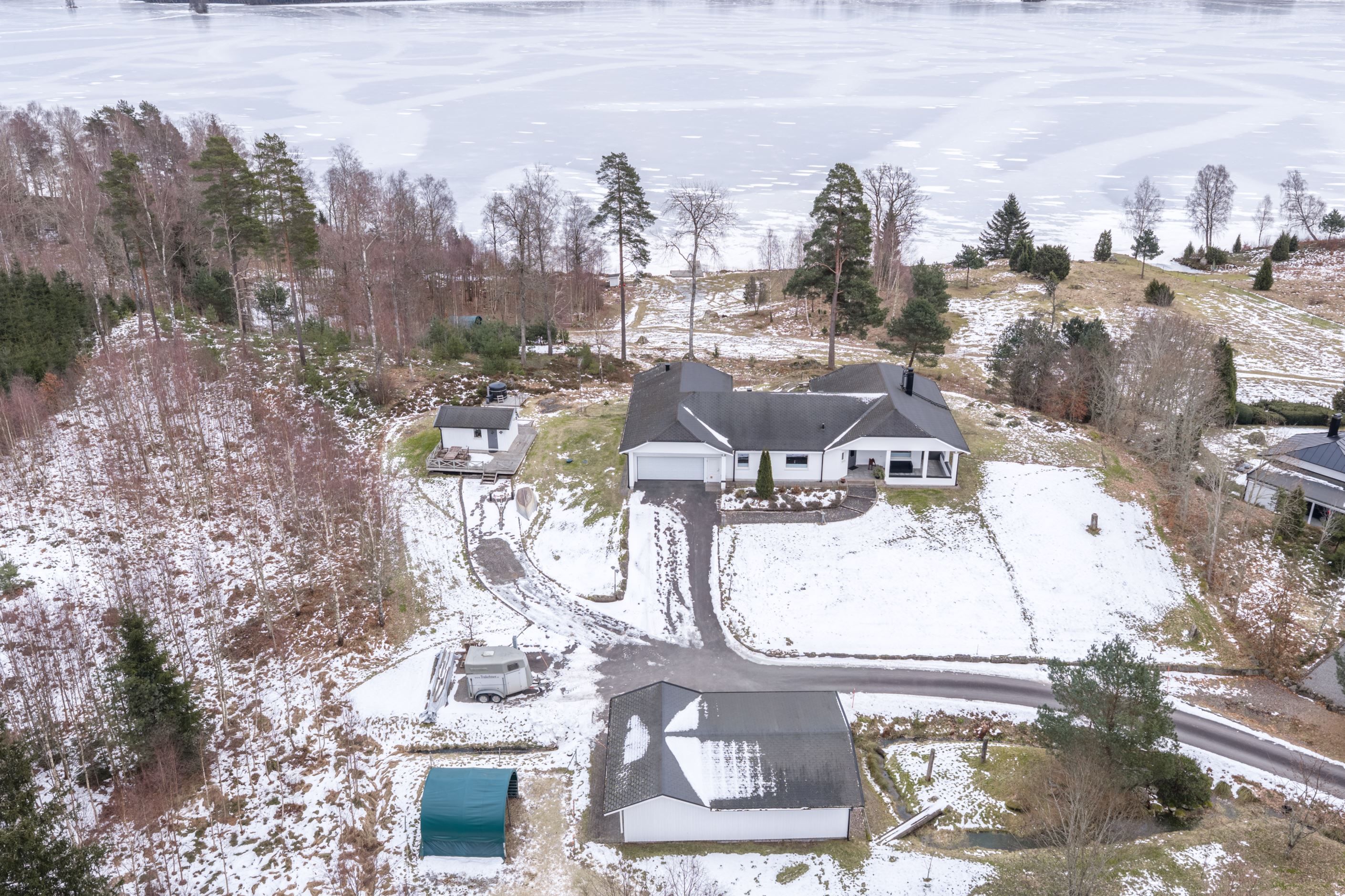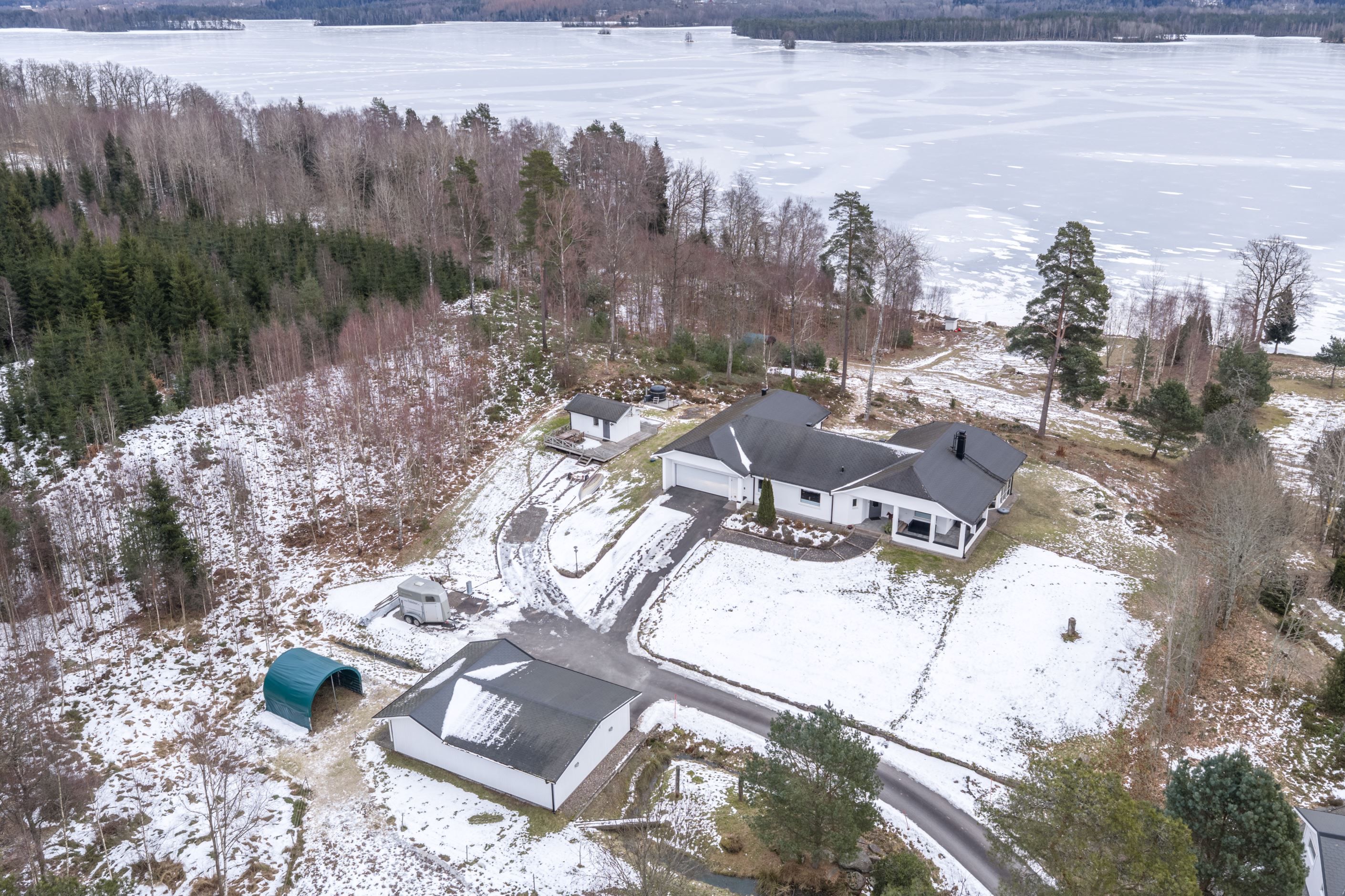 På fastigheten finns även carport med förråd samt ett vinterbonat gästhus, vilket lämpar sig utmärkt för gäster eller som utrymme för hobbyverksamhet. Gästhuset är utrustat med badrum med dusch och WC samt ett praktiskt kökpentry. Vid gästhuset finns en vedeldad badtunna med sjöutsikt. I anslutning till carporten finns dessutom en hage med möjlighet till djurhållning, där säljarna idag har tre ponnys. Sammantaget skapas ett komplett gårdsliv där boende, mark och funktion samspelar på bästa sätt.