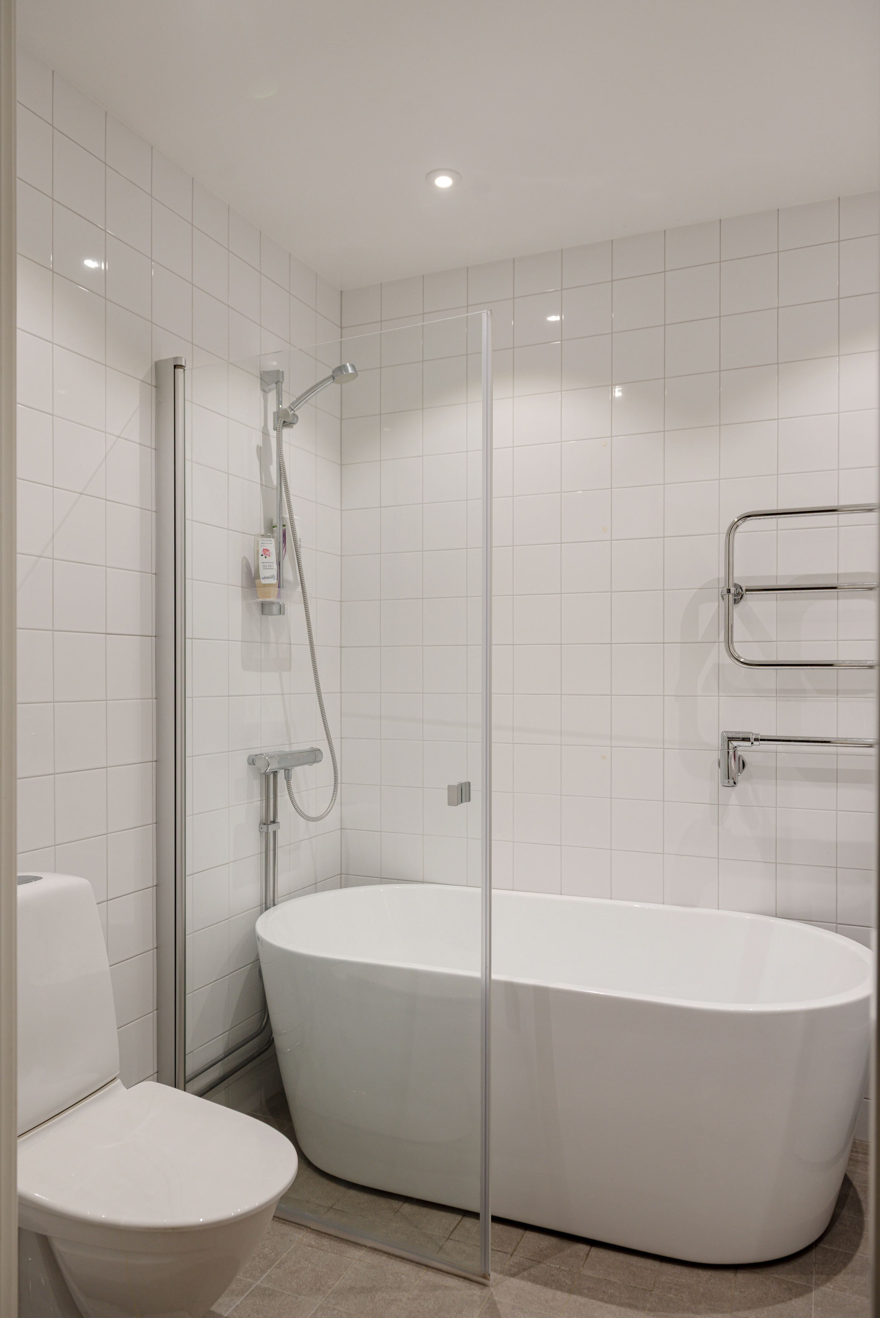 Badrummet är helkaklat och lägenheten har dessutom egen tvättmöjlighet med kombinerad tvättmaskin och torktumlare – en stor fördel i det dagliga livet. För förvaring finns både garderober i lägenheten och möjlighet till extra förråd i källarplanet.