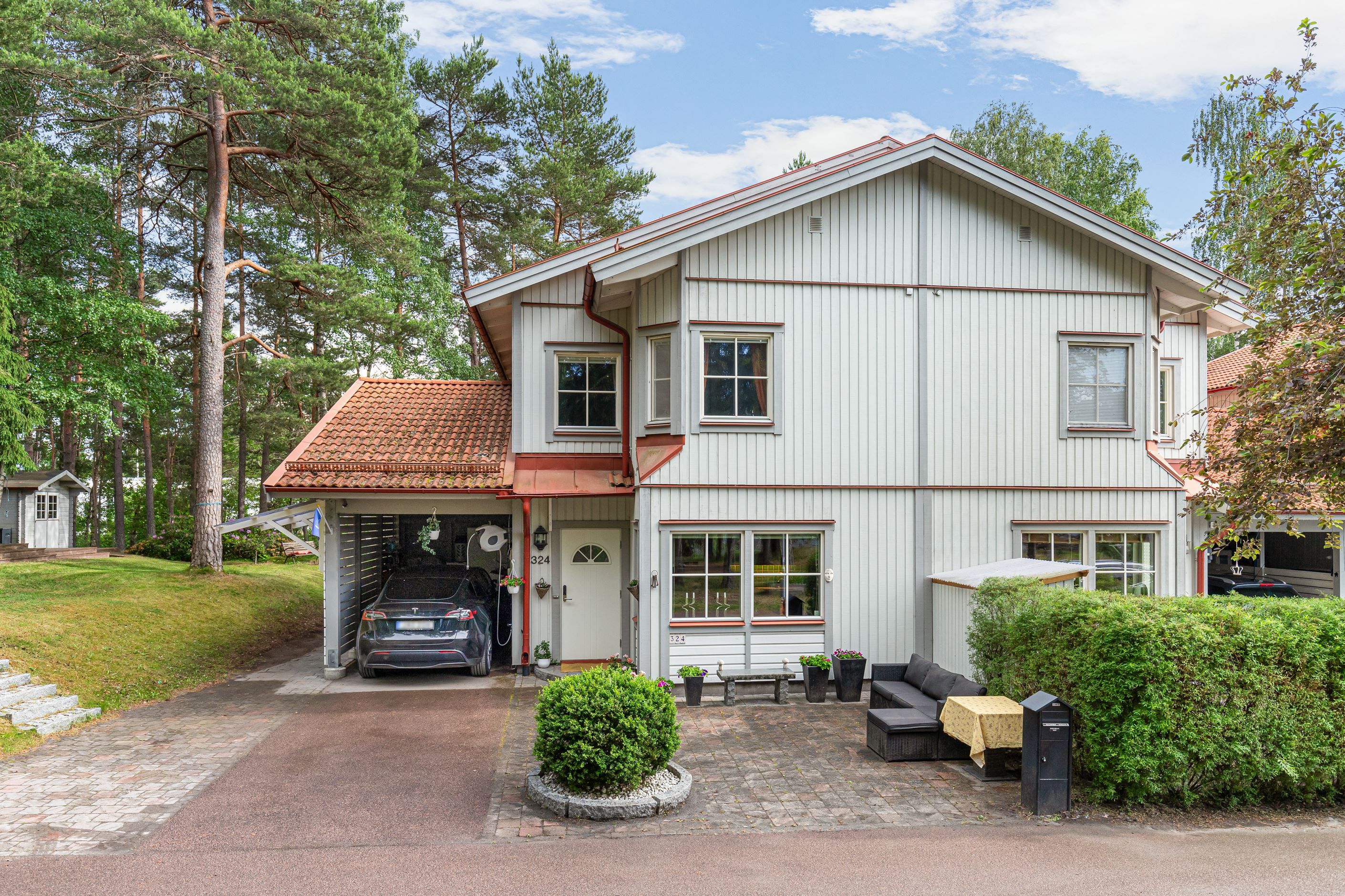På framsidan finns en stenlagd uteplats som går att inreda med en stor sittgrupp. Under och framför carporten finns det plats för 3 bilar att parkera. Elbilsladdaren Easee installerades 2022 för en smidig laddning. Extra förvaring finns ovanpå carporten med hyllor och golv på cirka 20 kvm, samt på vinden med golv på cirka 28 kvm. Förvaringsbehovet täcks ytterligare av en friggebod på 10 kvm för trädgårdsmaskiner, cyklar med mera.