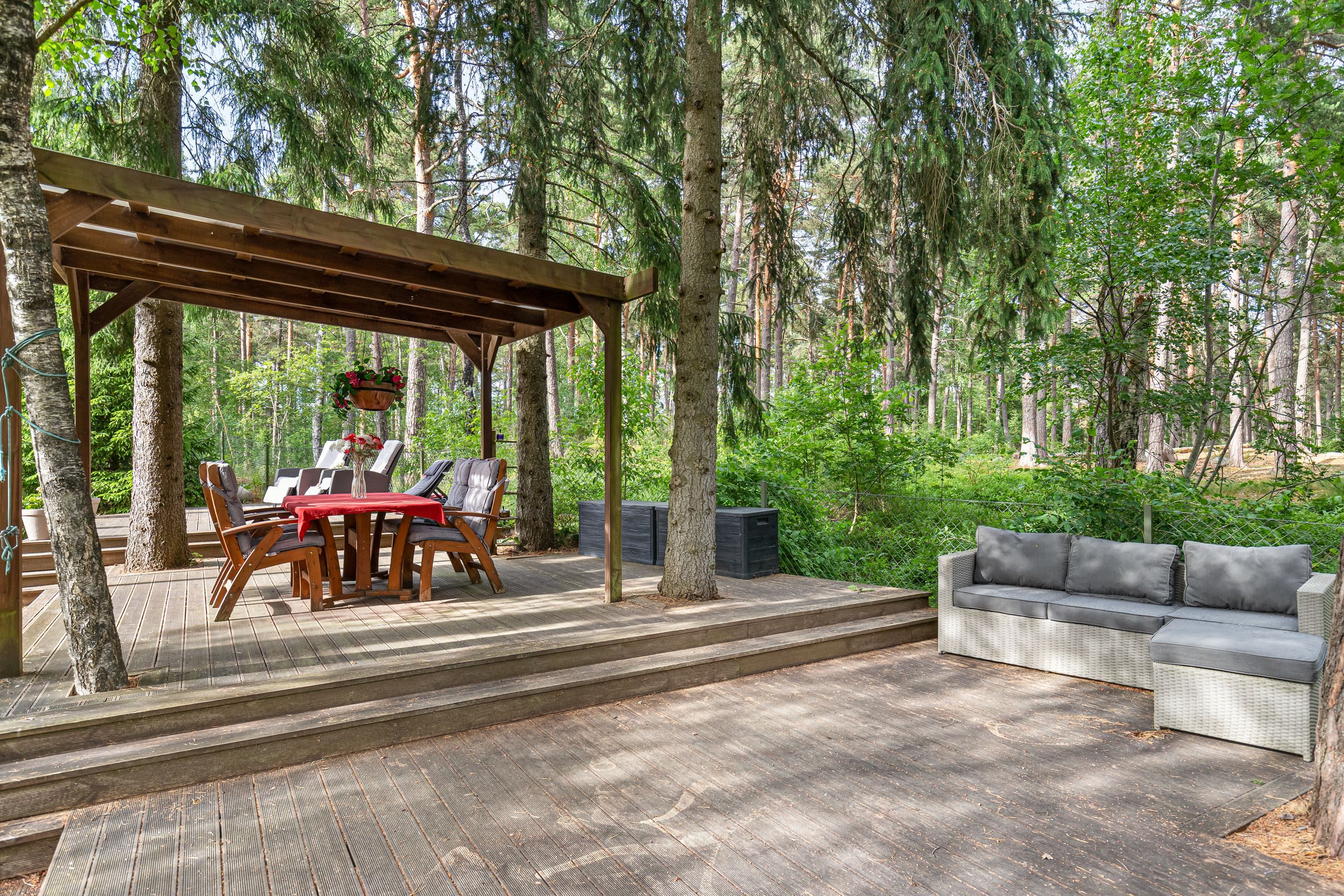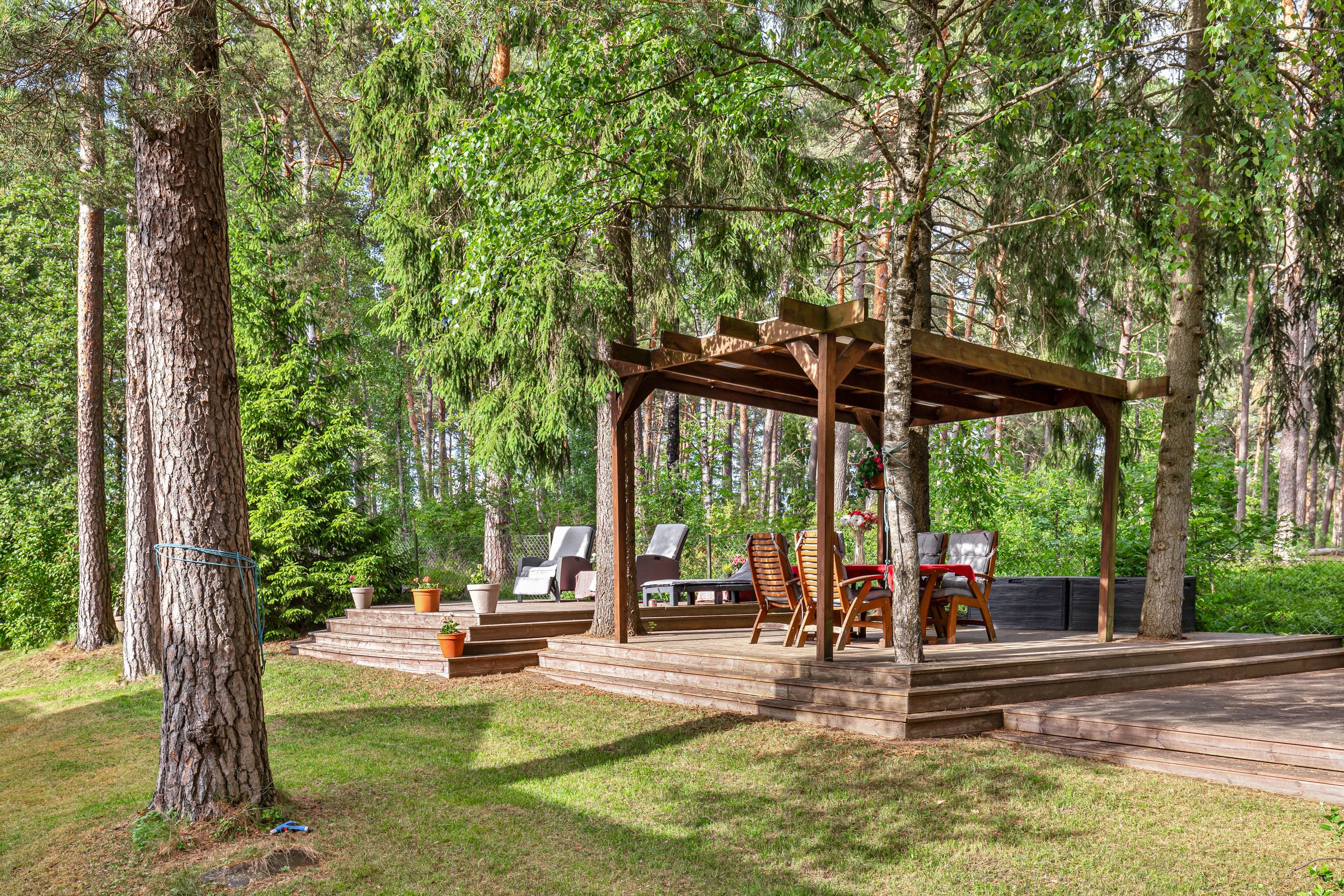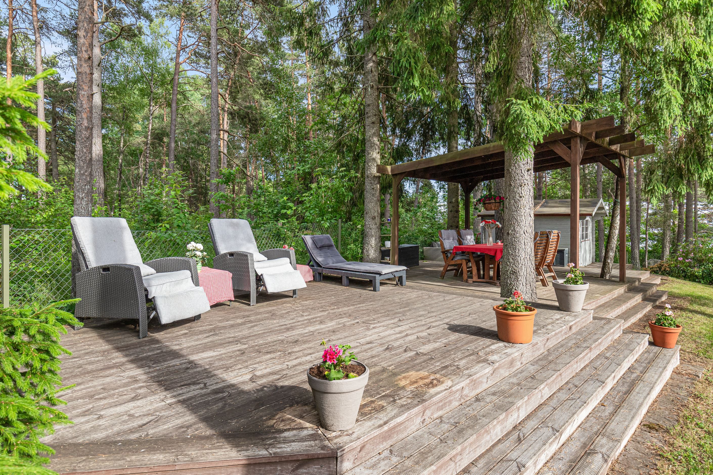 Trädgården är vackert anlagd med en häggmispelhäck, körsbärsträd, sex rhododendrer, fyra syrener och en stor Buxbom. Här får era botaniska drömmar en chans att komma till liv och frodas! Hela tomten, förutom bilsidan, är inhägnad med staket och erbjuder både gräsmatta och vacker grönska men också en härlig altan av trä på ca 100 kvm varav 10 kvm är under tak. Denna uteplats är idealisk för sommarfester för vänner och familj eller när du bara vill koppla av i solen med en god bok. Här kan du ordna fantastiska sommarmiddagar och andra sociala tillställningar!